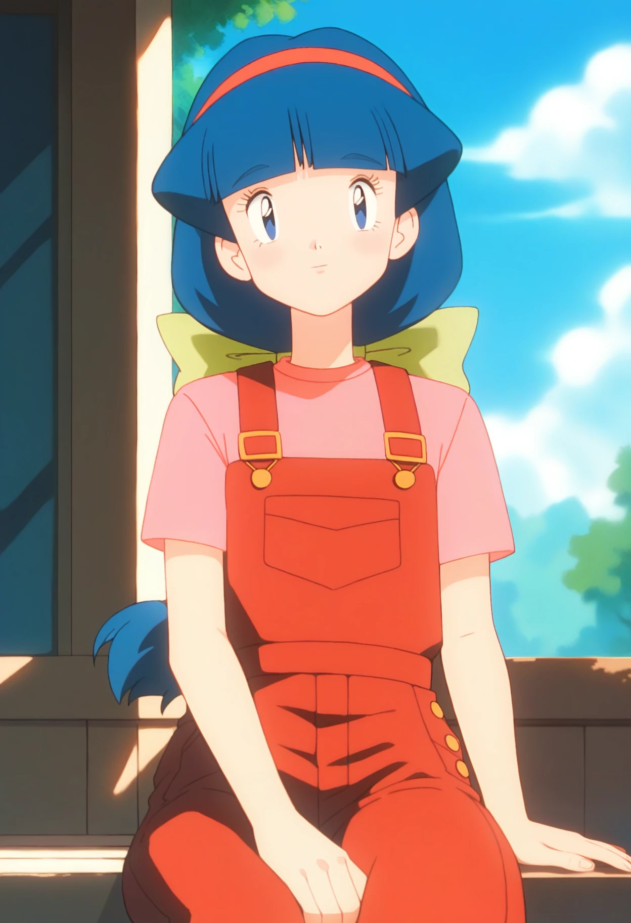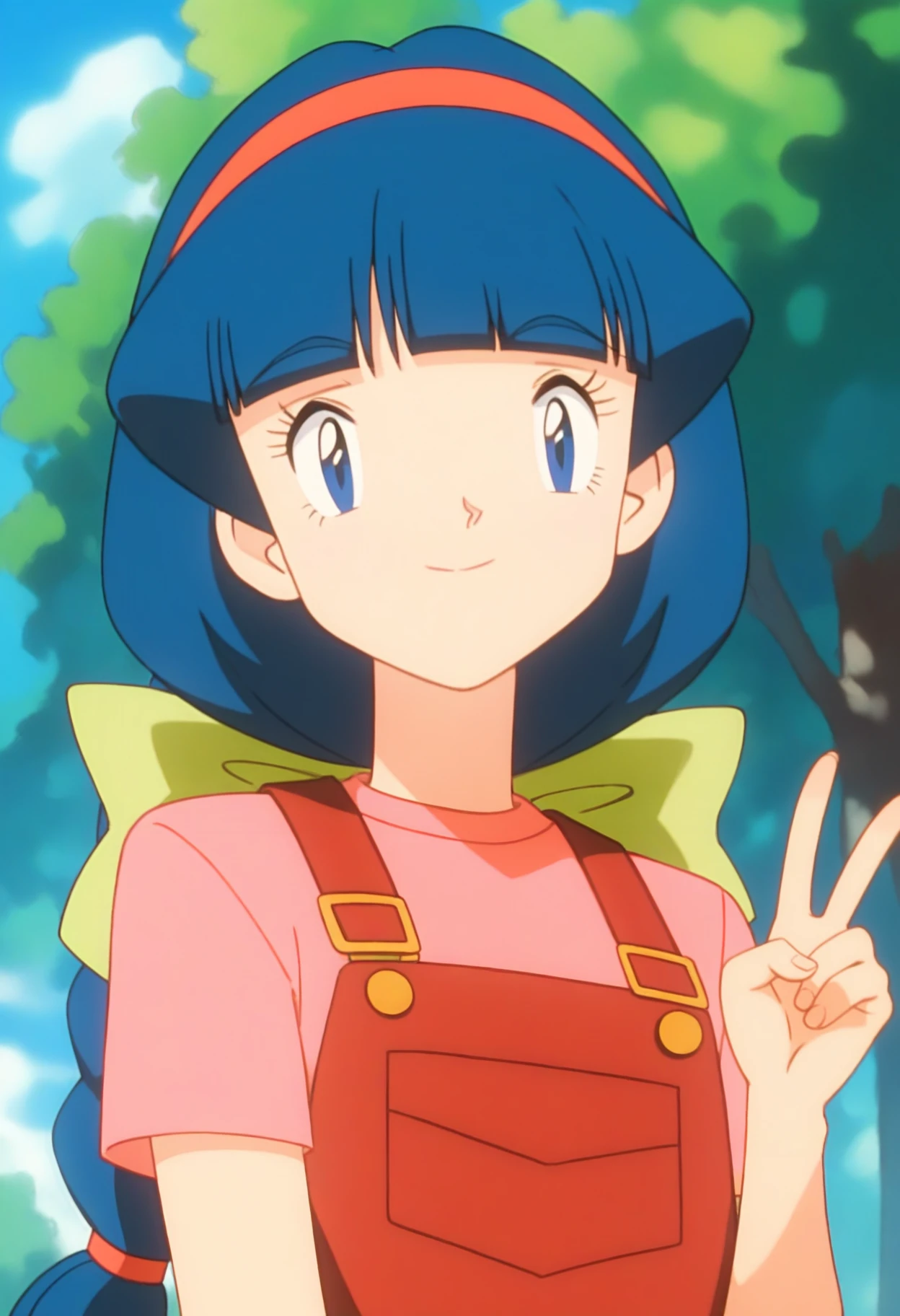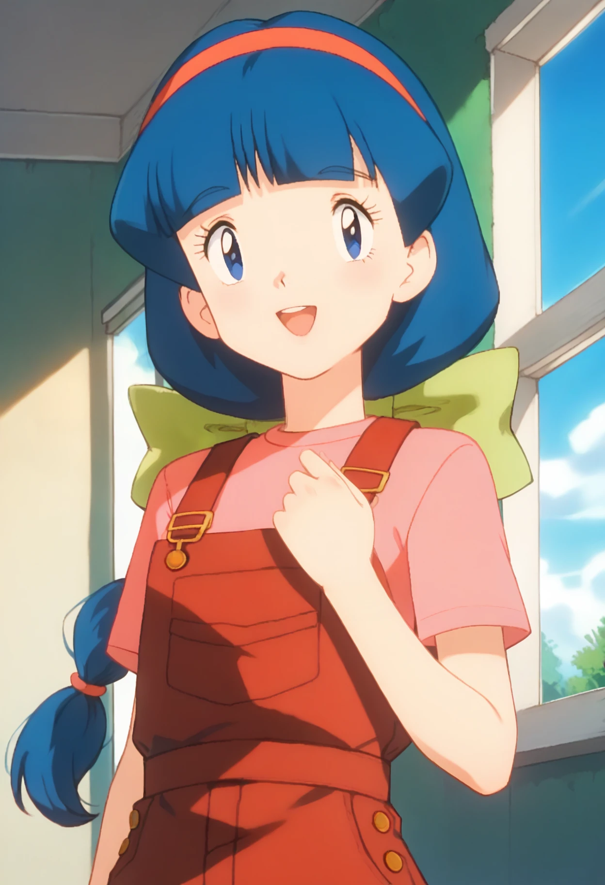 PMMelanie, aged up, blue eyes, blue hair, braided ponytail, blunt bangs, red hairband, green bow,