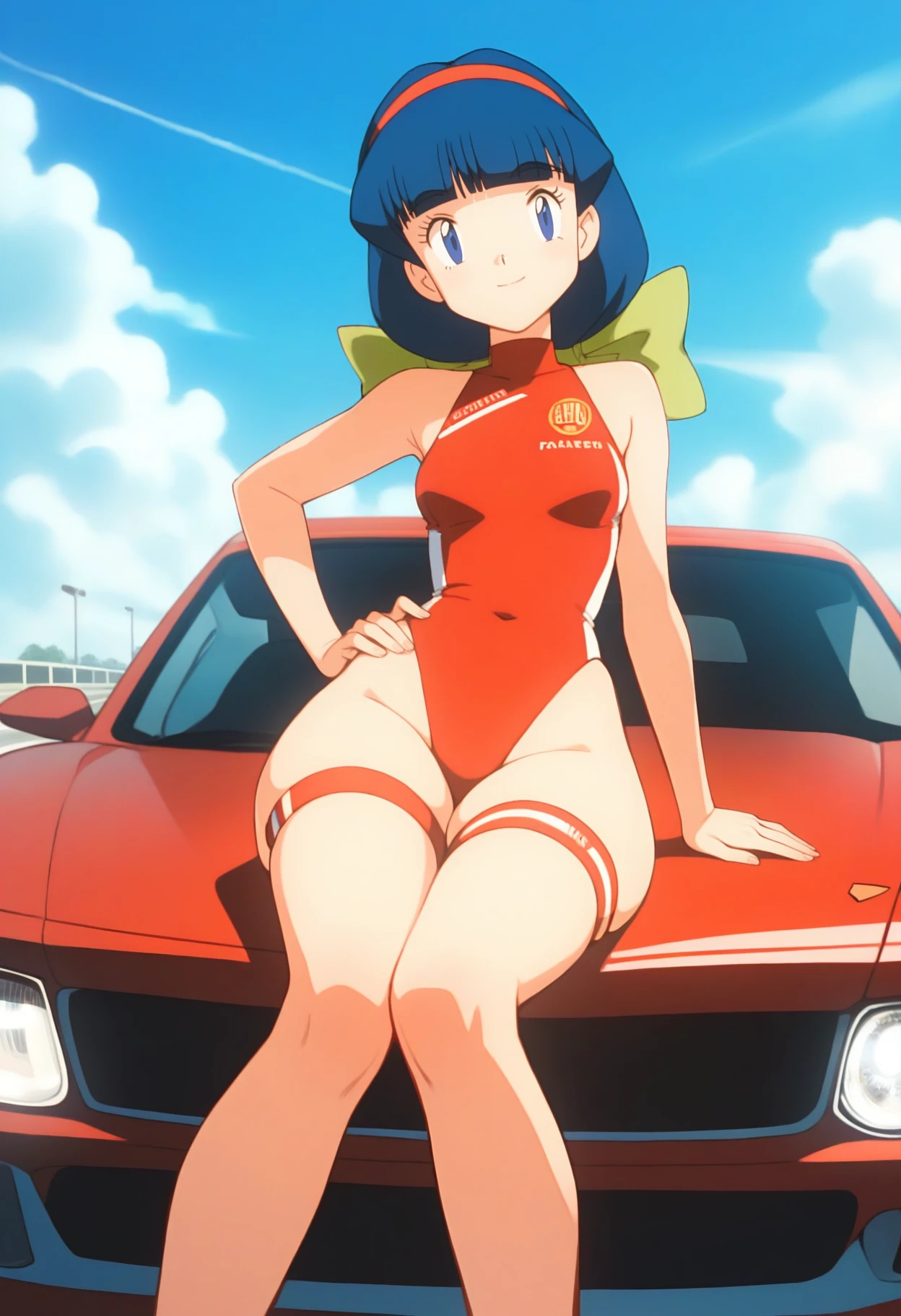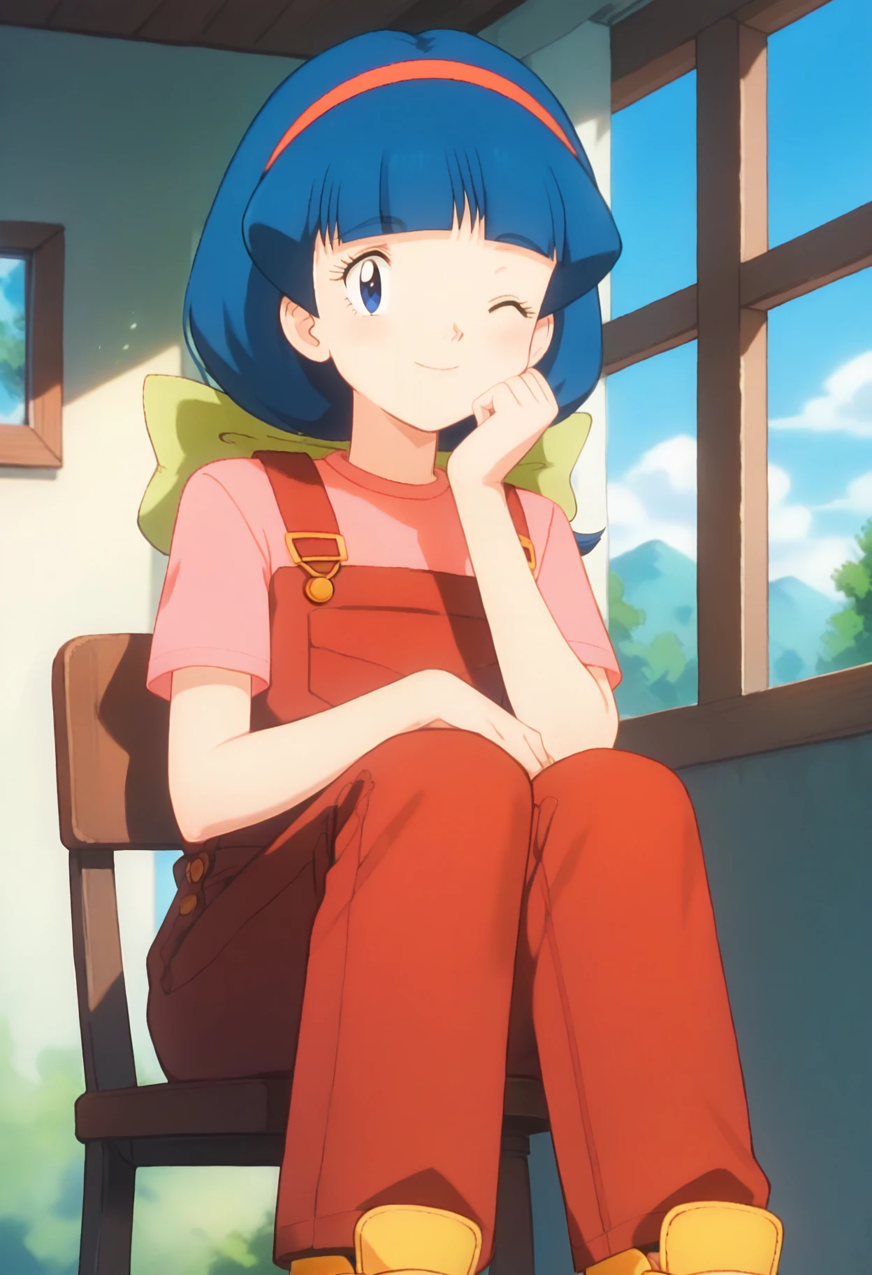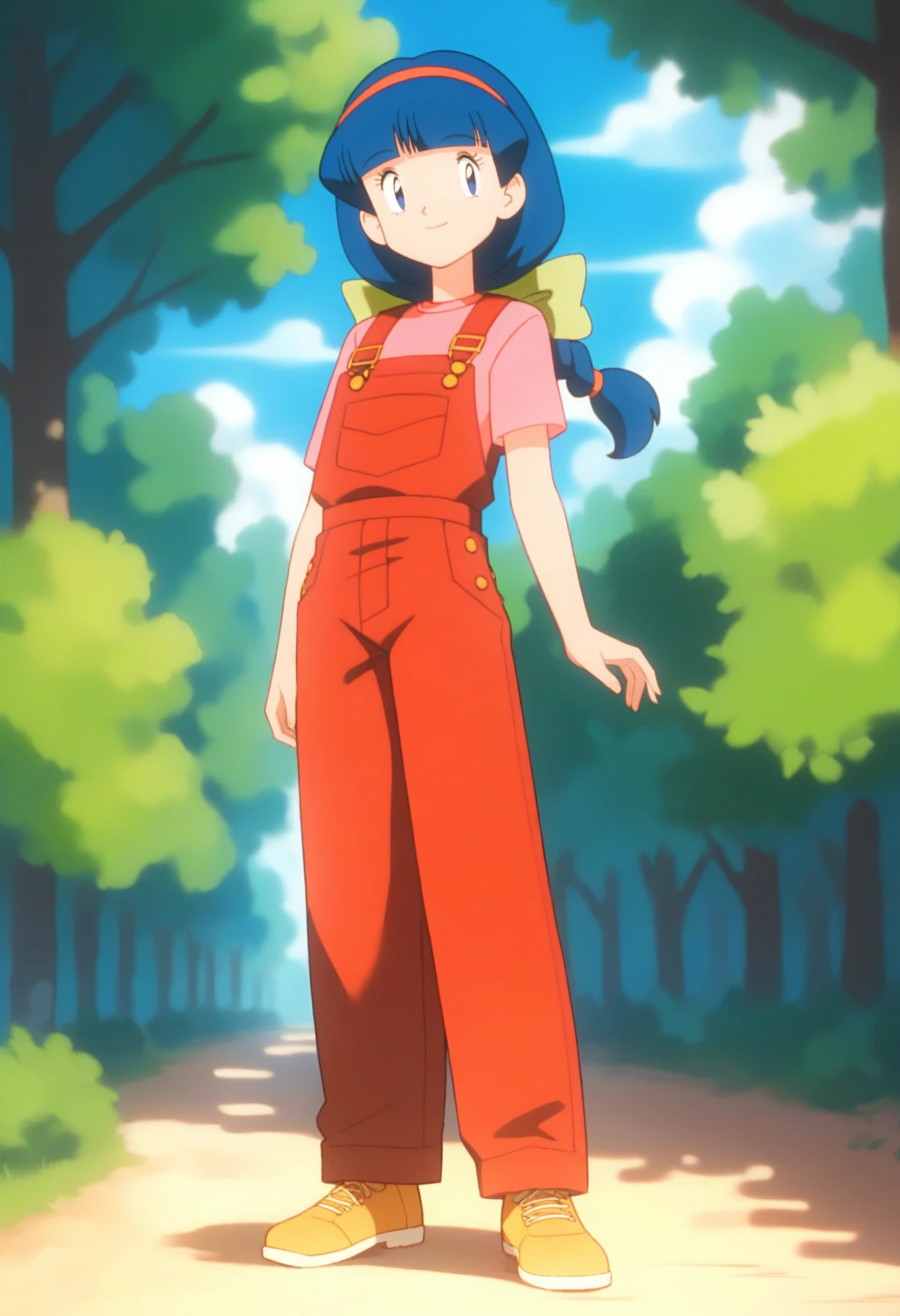 PMMelanie, aged up, blue eyes, blue hair, braided ponytail, blunt bangs, red hairband, green bow,