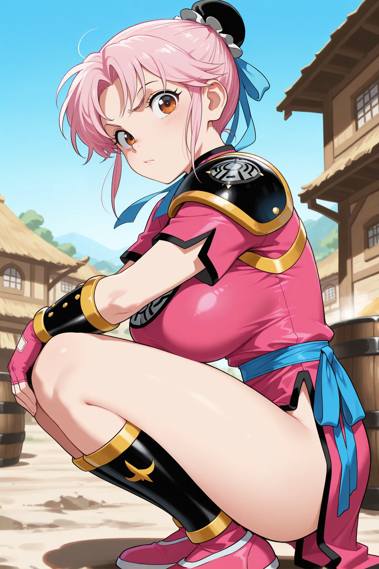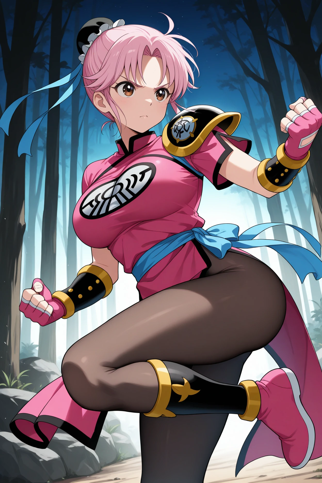 Add "martmm, pink hair, amber eyes, single hair bun, bun cover, short hair, blue ribbon, pink dress, china dress, short sleeves, blue sash, single shoulder pad, black bracers, pink gloves, fingerless gloves, pink shoes" for her Martial Artist outfit.