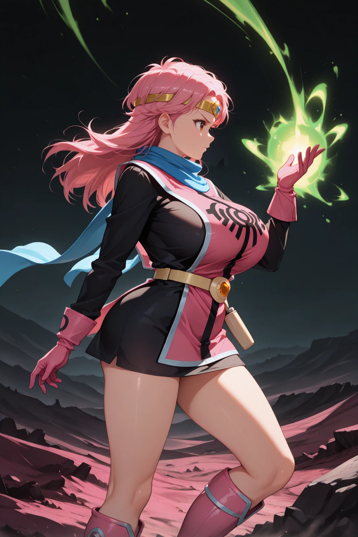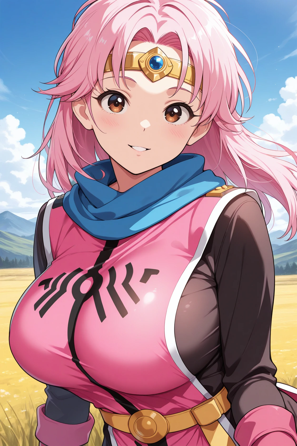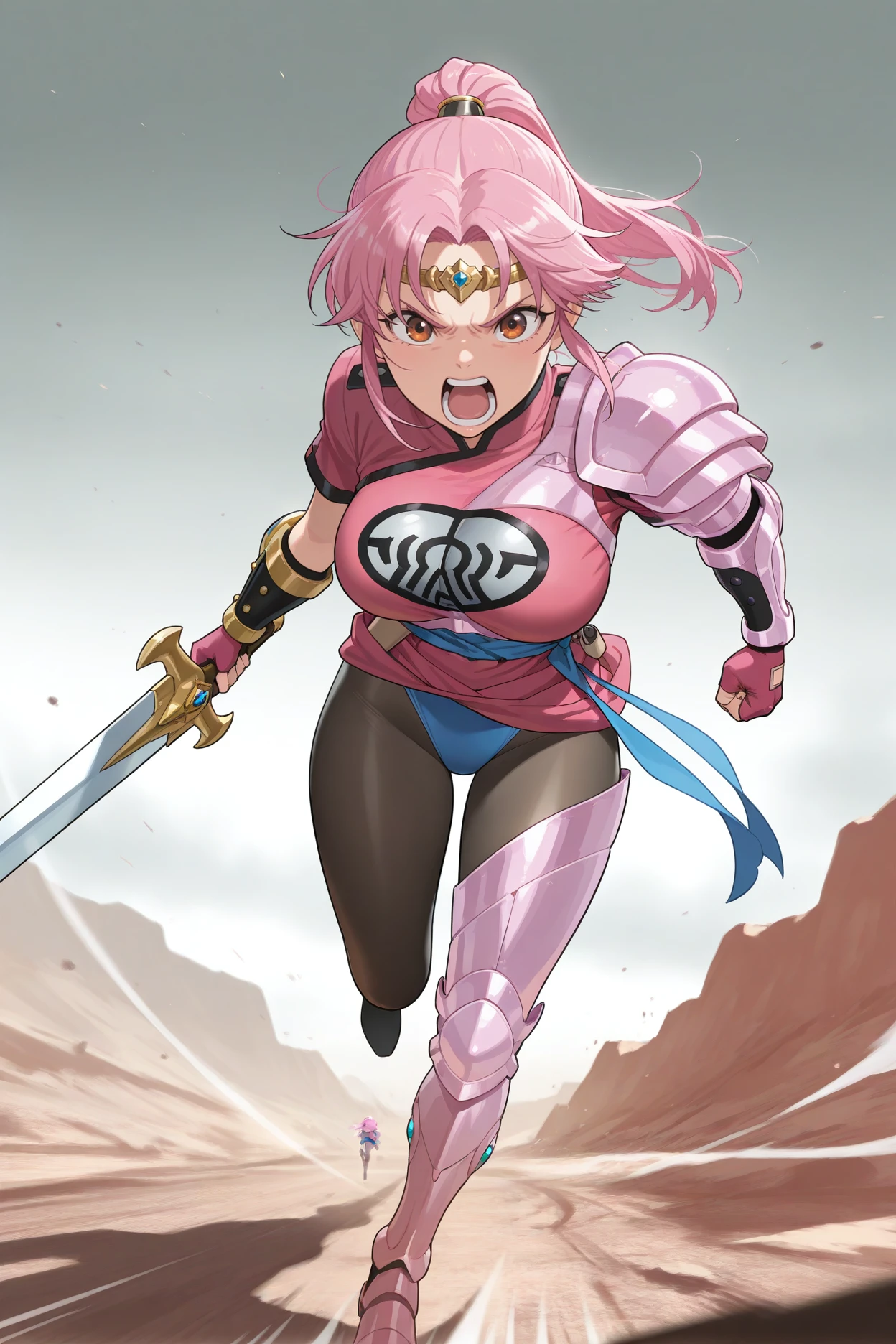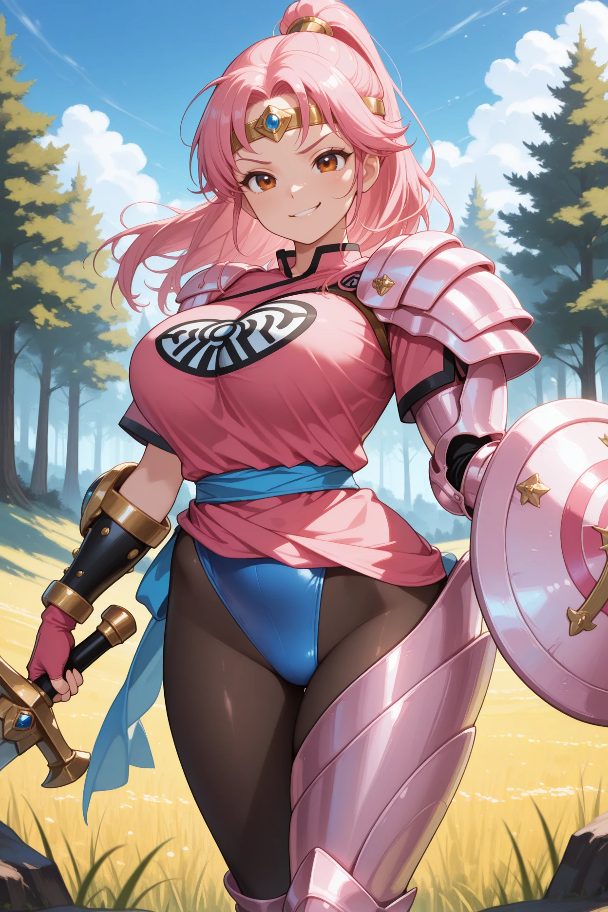 Add "gamrmm, pink hair, amber eyes, high ponytail, long hair, circlet, pink armor, shoulder armor, pink tunic, blue sash, single gauntlet, pink gloves, fingerless gloves, blue leotard, leotard under clothes, black pantyhose, armored legwear, asymmetrical legwear, armored boots" for her armored outfit.