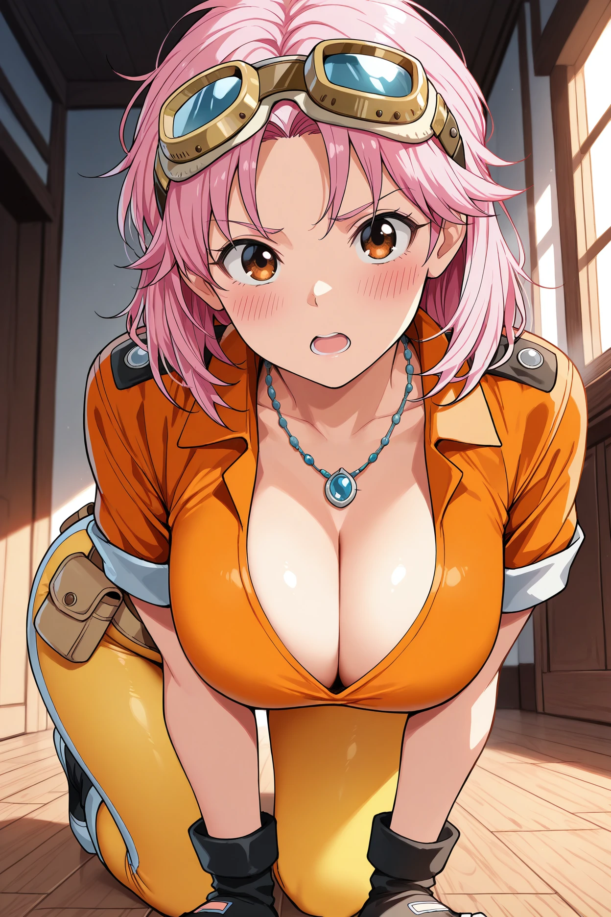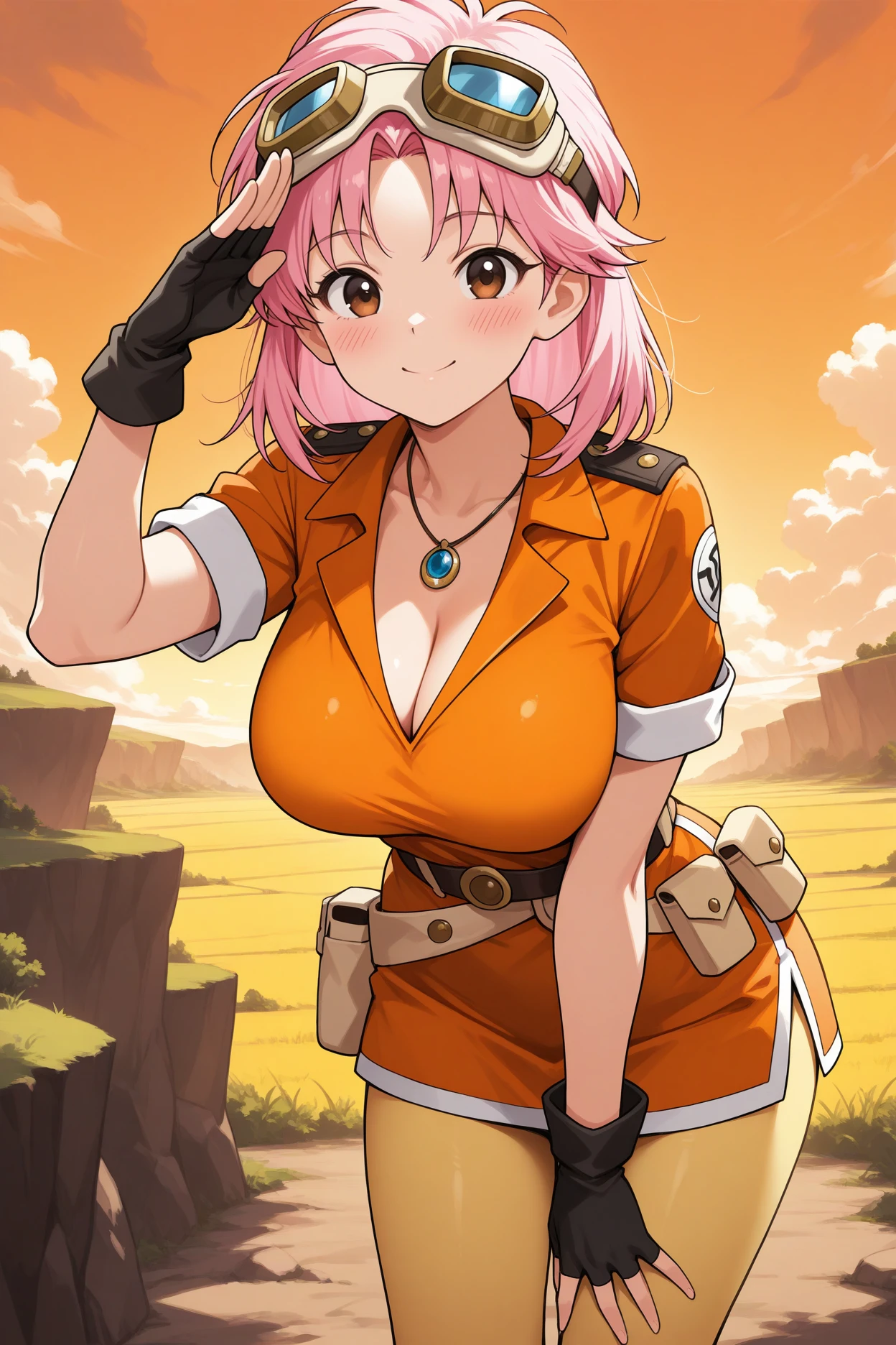 Add "bsmm, pink hair, amber eyes, medium hair, goggles on head, necklace, orange shirt, collared shirt, short sleeves, cleavage, belt pouch, black gloves, fingerless gloves, yellow leggings" for her orange dress.