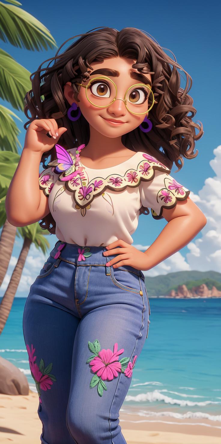 Curly hair, green glasses, brown eyes, light brown skin, white blouse with floral embroidery, purple and blue earrings, small nose, arched eyebrows, thin lips, slight smile, <lora:Mirabel_Madrigal:1>, jeans, holding a butterfly, outdoors, ocean, sand, palms, sun