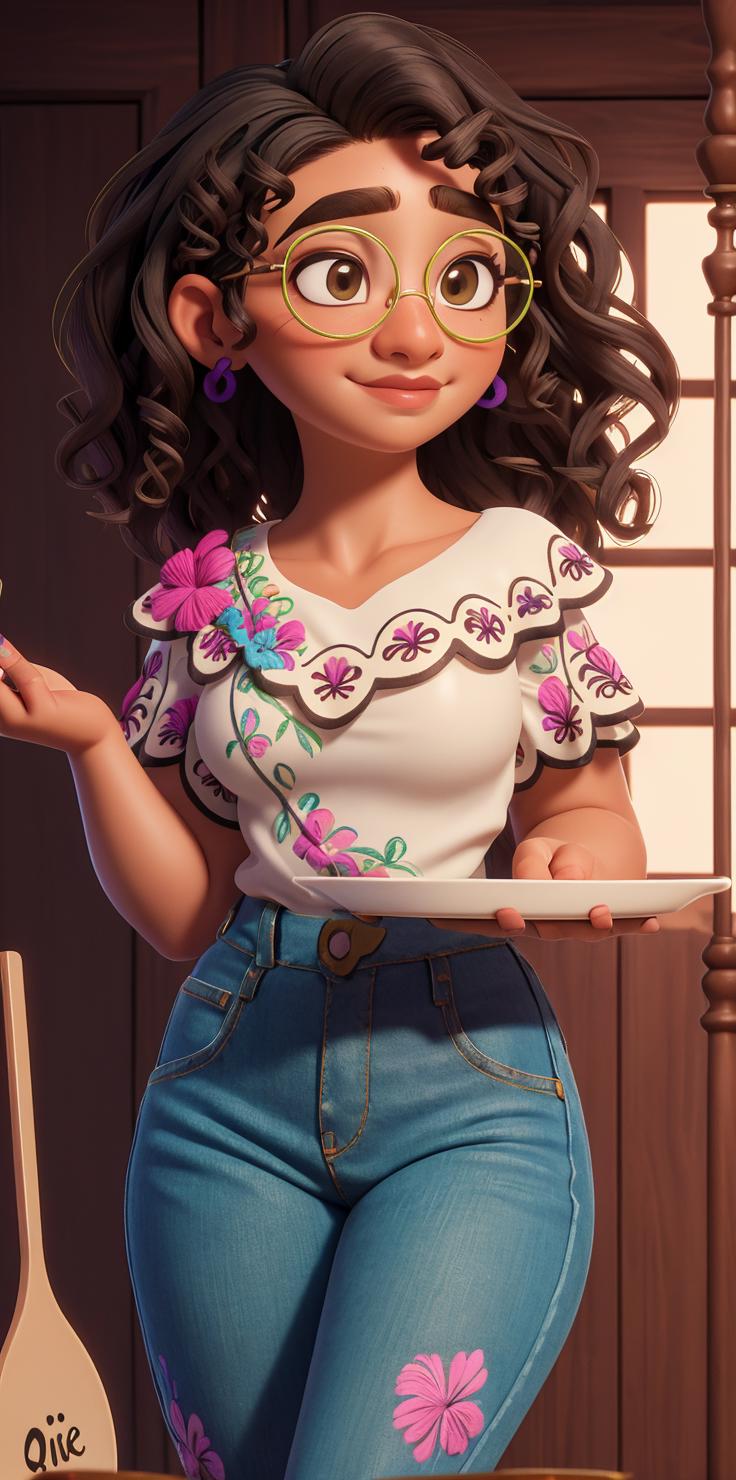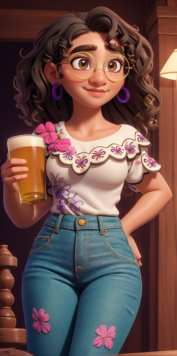 Curly hair, green glasses, brown eyes, light brown skin, white blouse with floral embroidery, purple and blue earrings, small nose, arched eyebrows, thin lips, slight smile, <lora:Mirabel_Madrigal:1>, jeans, holding a beer