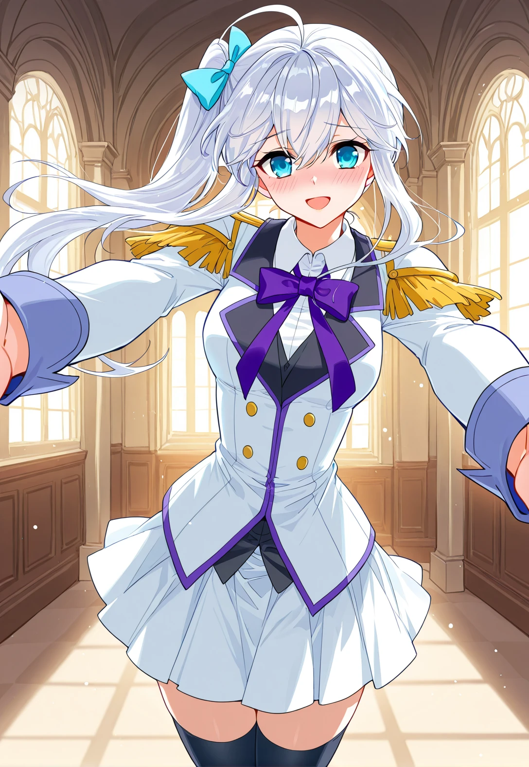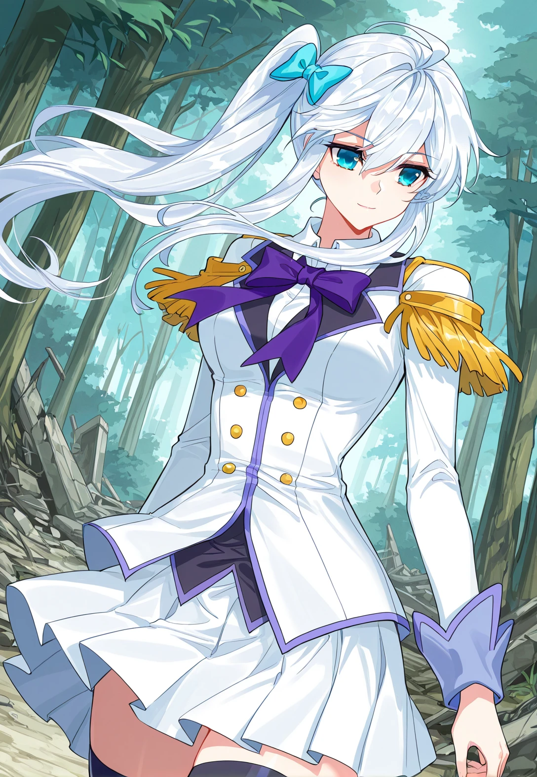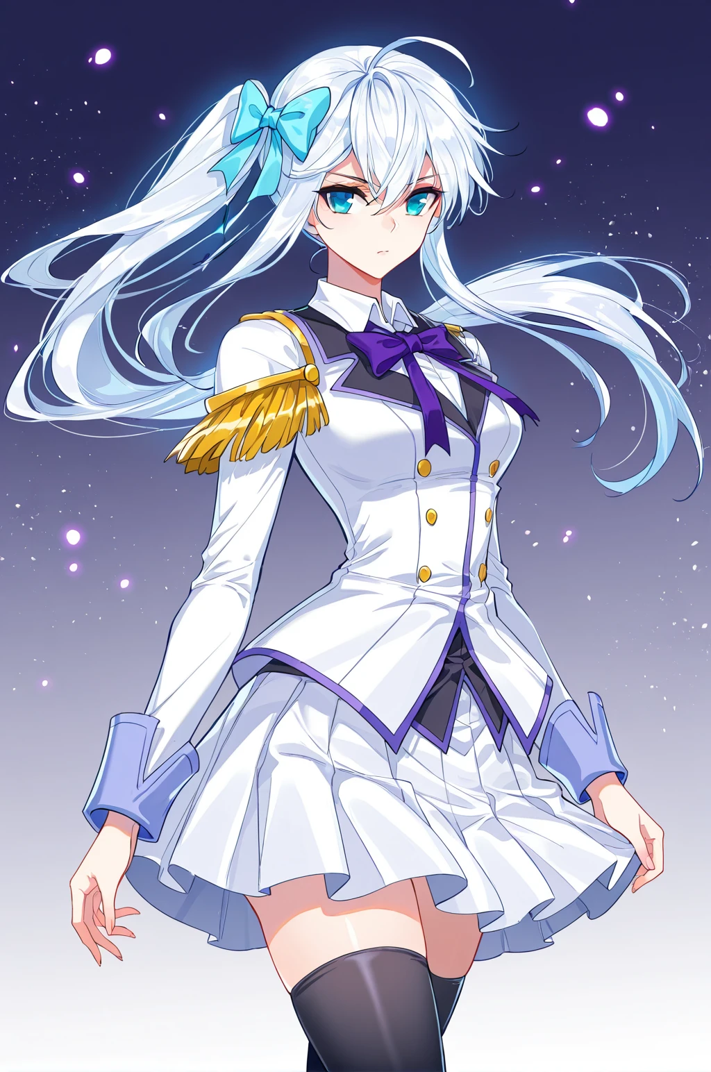 Meng_outfit, white uniform, purple trim, purple neck bow, pleated skirt, long sleeves, white shirt collar, golden shoulder epaulettes, epaulette uniform, thigh-highs, black thigh-highs, white shoes,