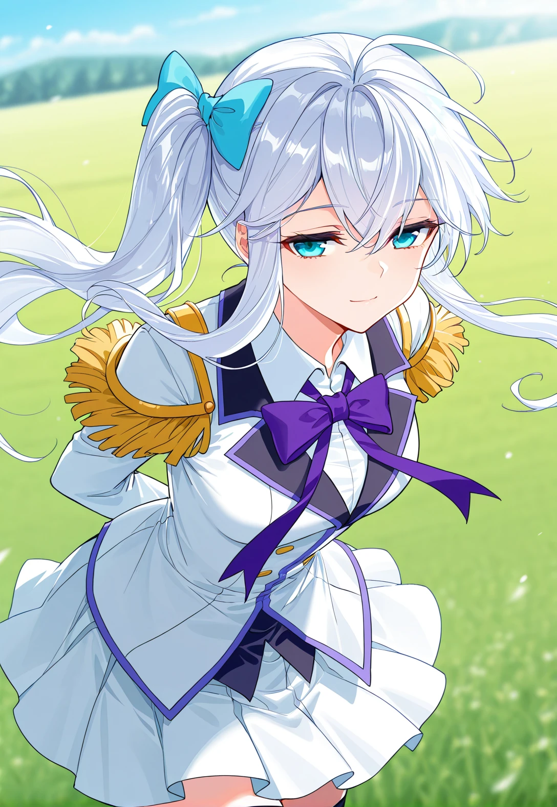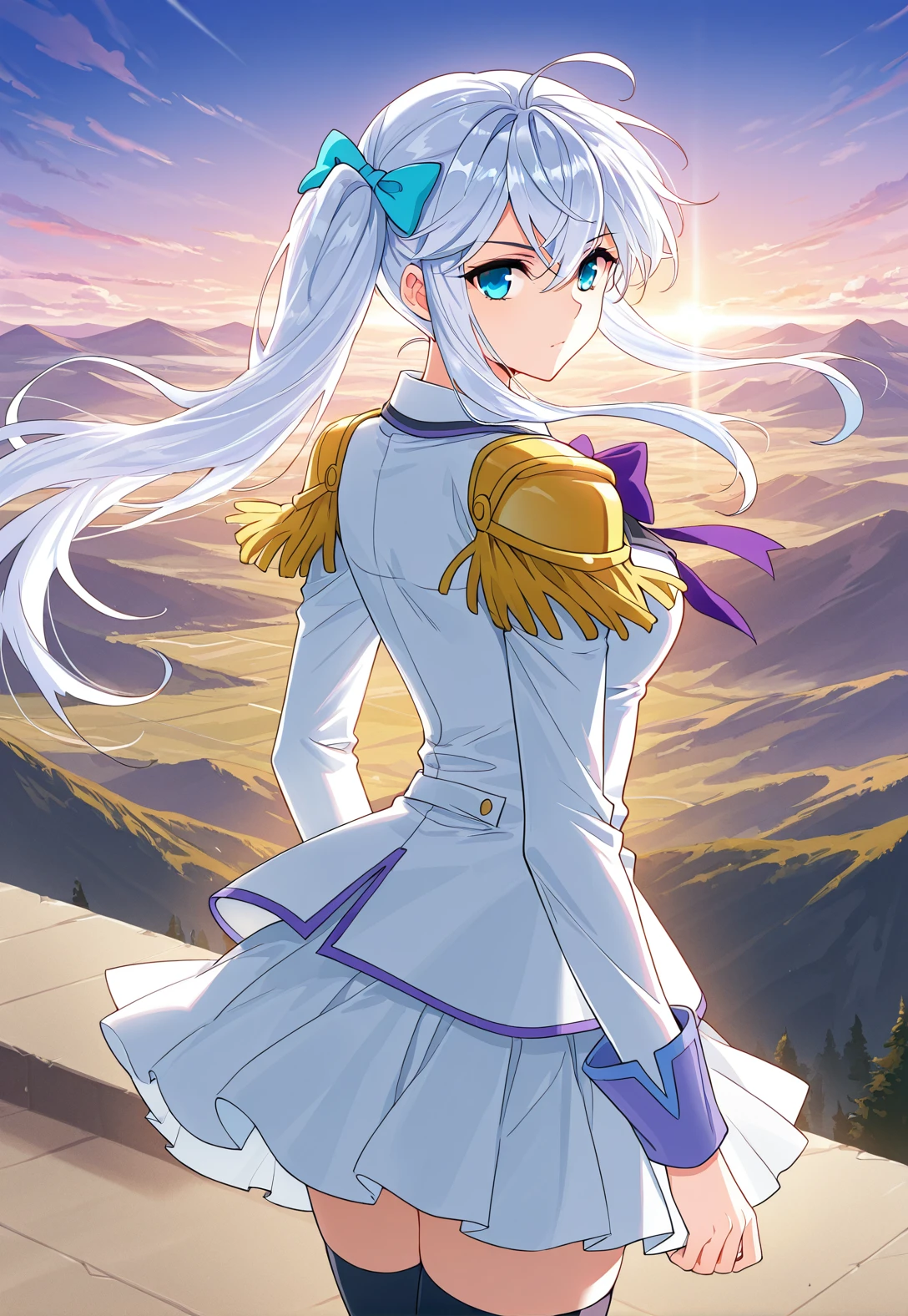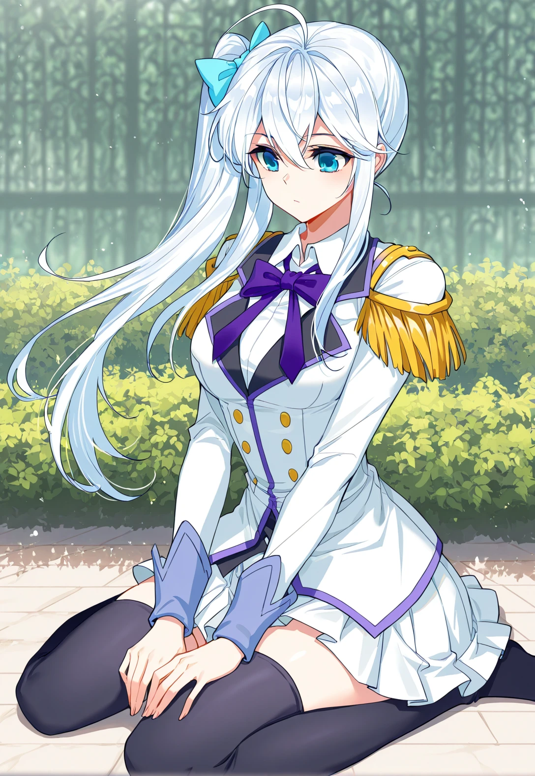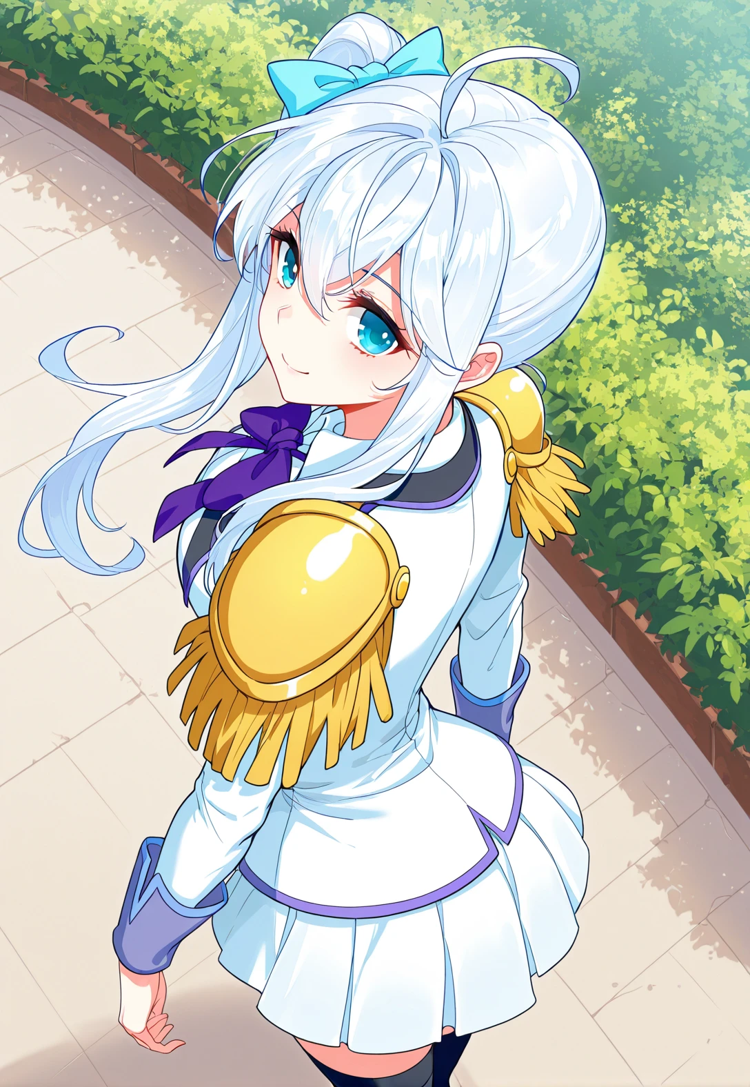 Meng_outfit, white uniform, purple trim, purple neck bow, pleated skirt, long sleeves, white shirt collar, golden shoulder epaulettes, epaulette uniform, thigh-highs, black thigh-highs, white shoes,