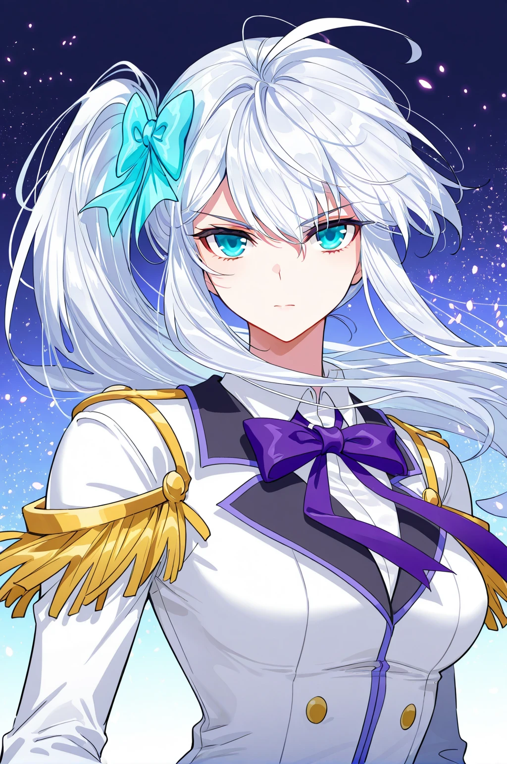 Meng, 1 girl, solo, blue eyes, long hair, white hair, blue-tinted hair, hair between eyes, ahoge, side ponytail, hair bow, blue ribbon, side hair ornament,