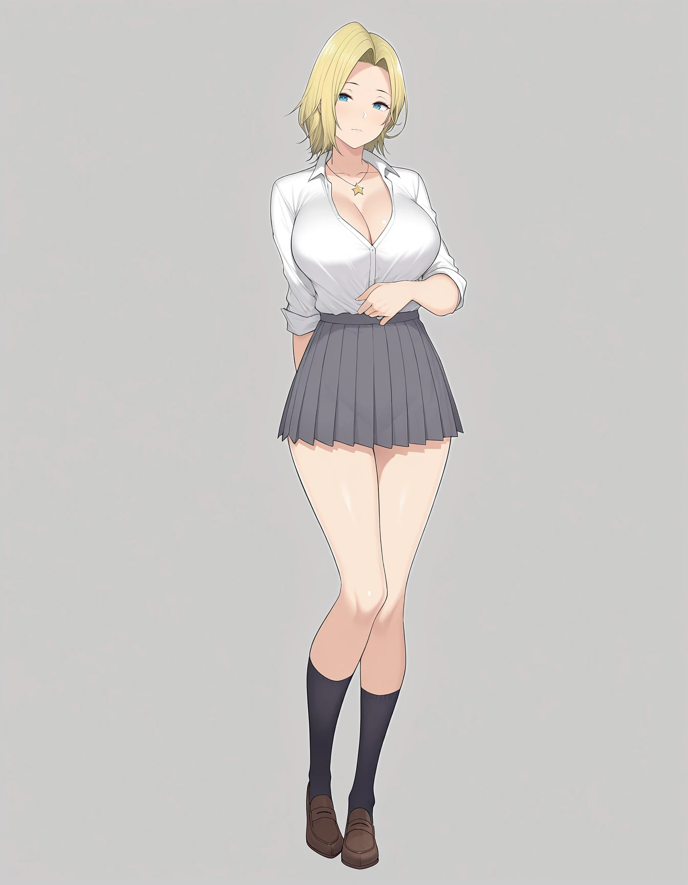 mai_icdgc,mai_reinaic,mature_female,short_hair,blonde_hair,blue_eyes,large_,star_necklace,school_uniform,white_shirt,grey_pleated_skirt,black_sockes,loafers,cleavage