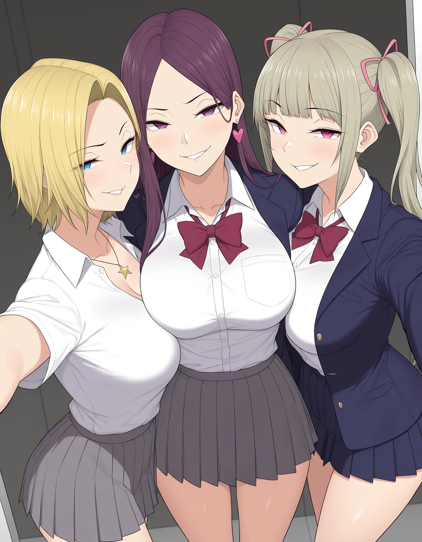 mai_icdgc,mai_reinaic,mature_female,short_hair,blonde_hair,blue_eyes,large_breasts,star_necklace,school_uniform,white_shirt,grey_pleated_skirt,black_sockes,loafers,cleavage