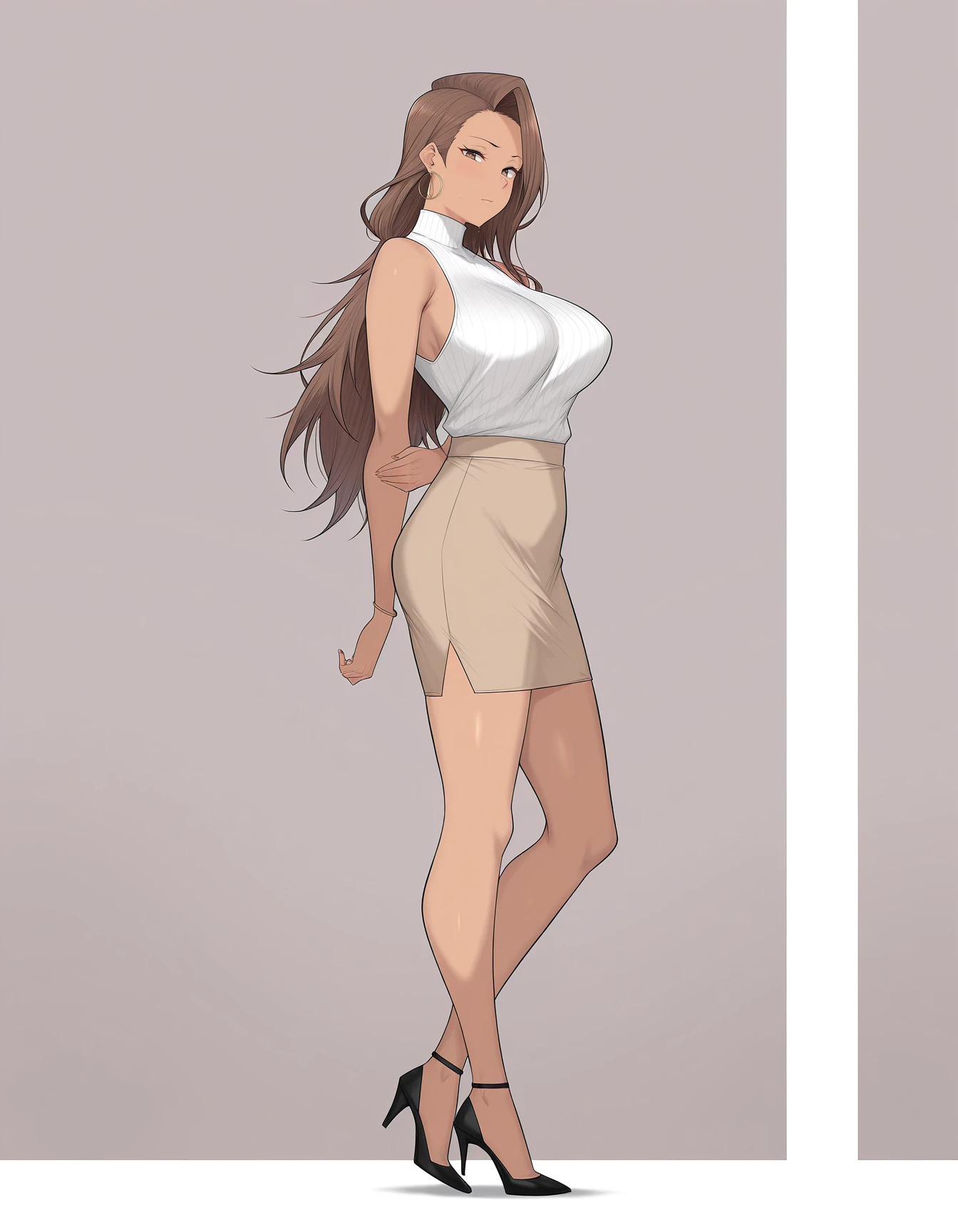 mai_icdgc,mai_risaic,mature_female,long_hair,brown_hair,brown_eyes,large_breasts,hoop_earrings,white_sleeveless_turtleneck,brown_pencil_skirt,short_skirt,black_high_heels