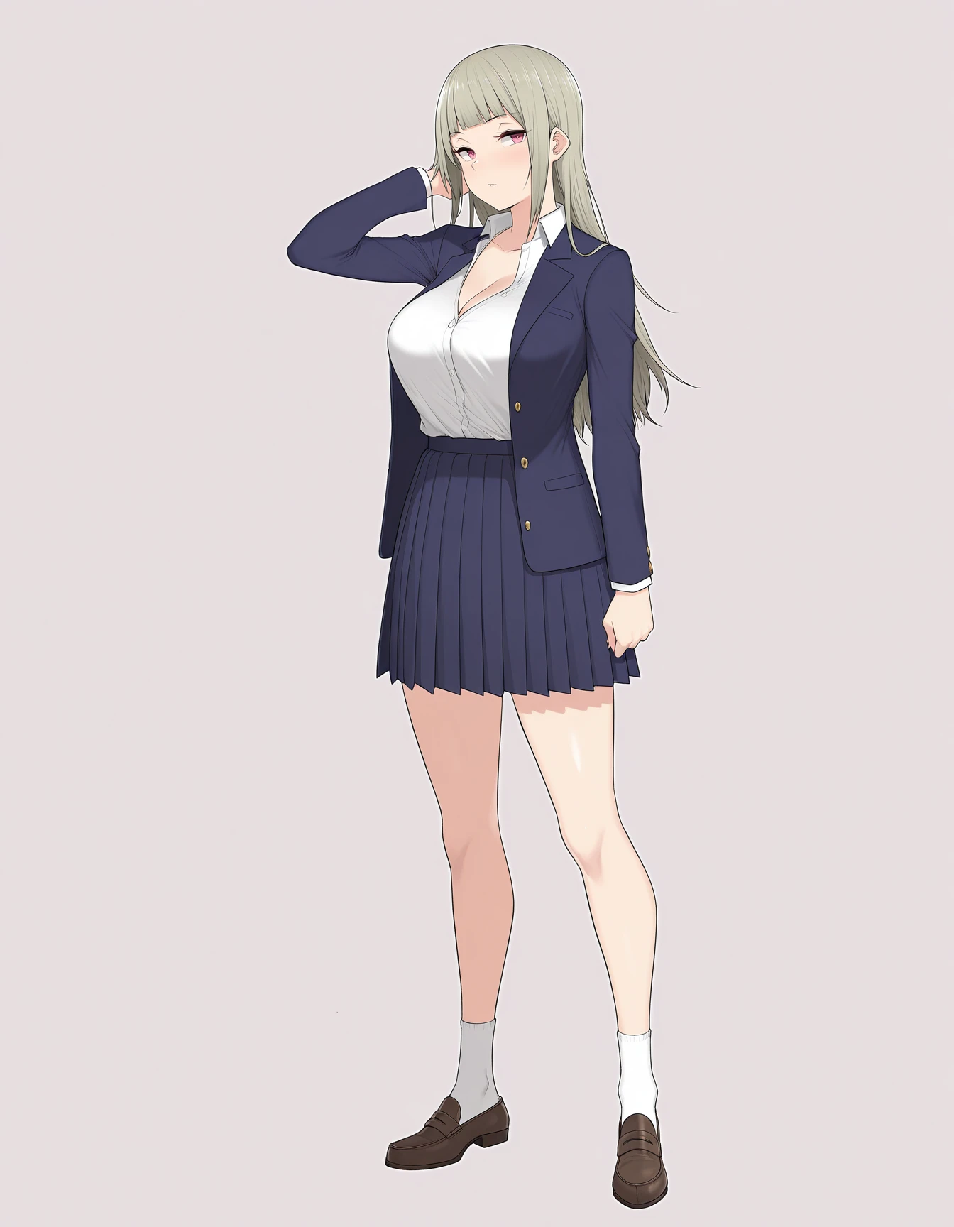 mai_icdgc,mai_ruriic,long_hair,grey_hair,pink_eyes,large_,school_uniform,white_shirt,blue_jacket,blue_pleated_skirt,white_sockes,loafers,cleavage