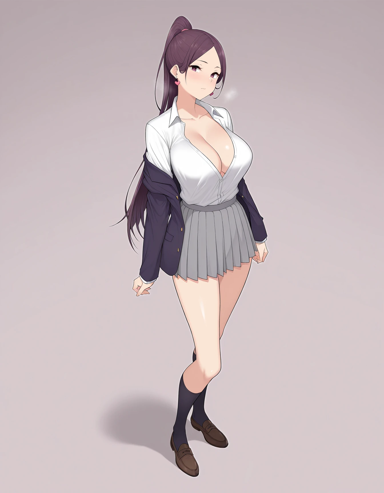 mai_icdgc,mai_yukinaic,long_hair,ponytail,purple_hair,purple_eyes,large_breasts,heart_earrings,school_uniform,white_shirt,grey_pleated_skirt,black_sockes,loafers,cleavage