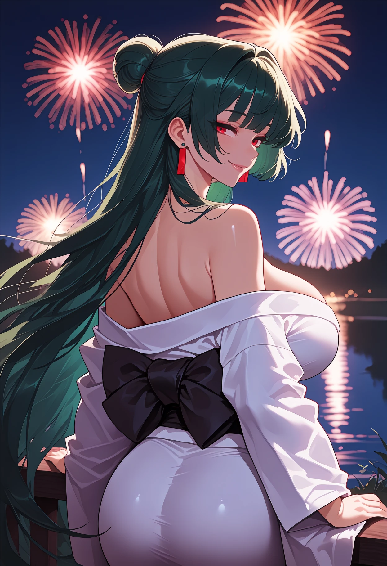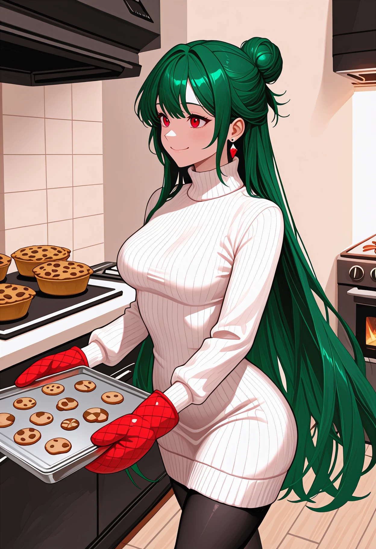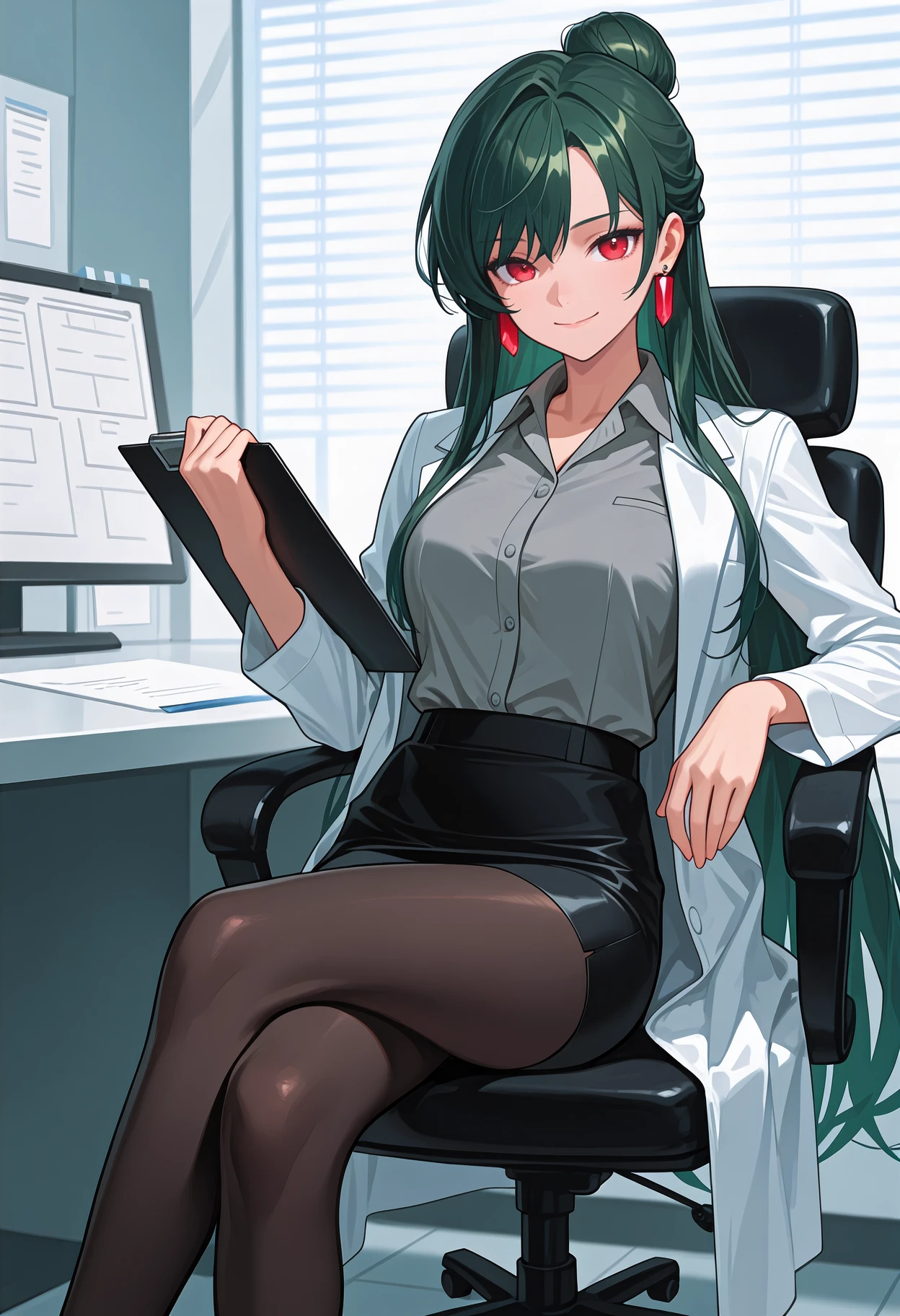 Appearance: very long hair, dark green hair, single hair bun, red eyes