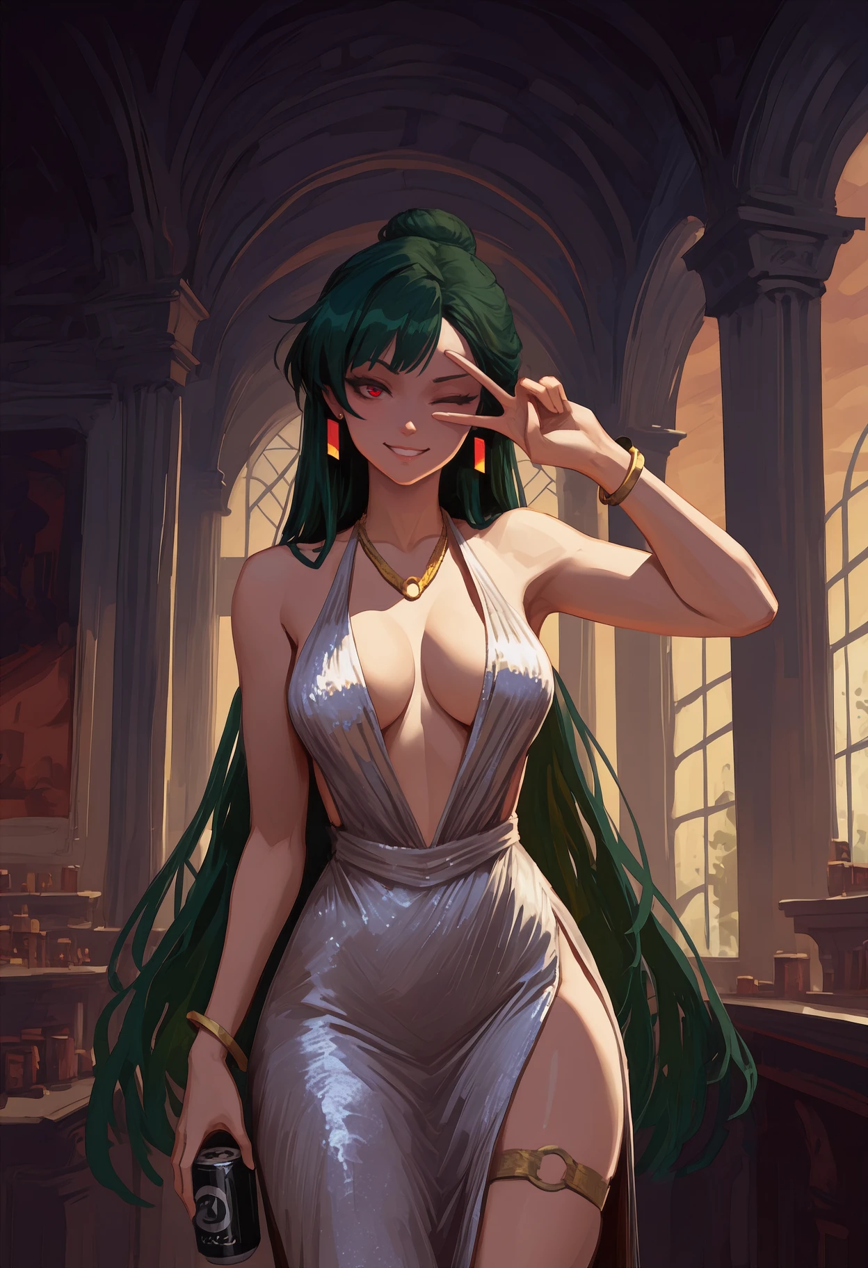 very long hair, dark green hair, single hair bun, red eyes