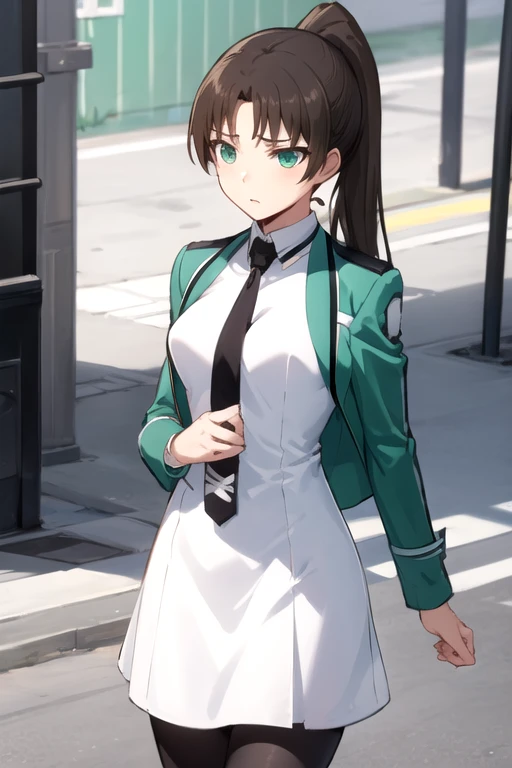 SayakaMibu, 1girl, solo, long hair, brown hair, black hair, long sleeves, white dress, green eyes, green jacket, high ponytail, grey pantyhose, black necktie, open jacket, see-through,