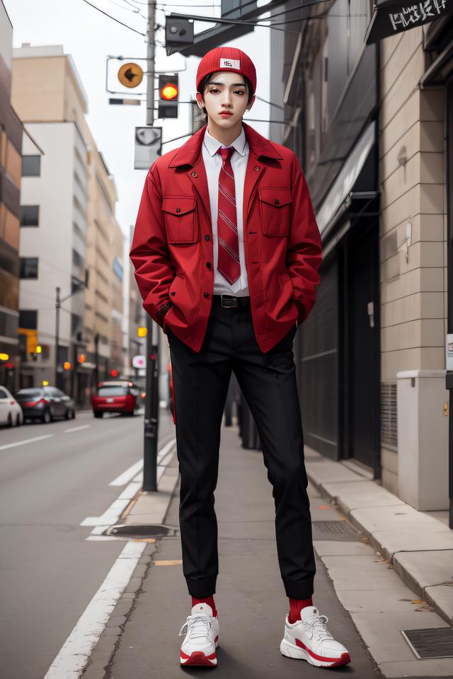 sblack hair, full body, solo focus, brown eyes, ((backwards red baseball cap)), white collared shirt, black sweater vest, plaid necktie, ((red jacket)), capri black pants, white socks showing, sneakers,