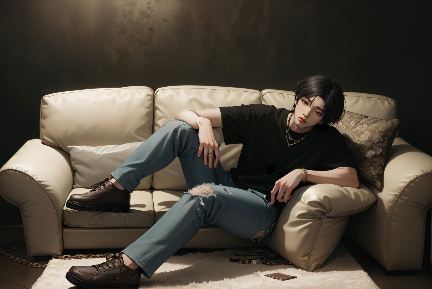 solo, short hair, black hair, short sleeves, bag, bracelet, torn clothes, brown footwear, denim, couch, jeans, realistic, print shirt, reclining, torn pants, torn jeans,