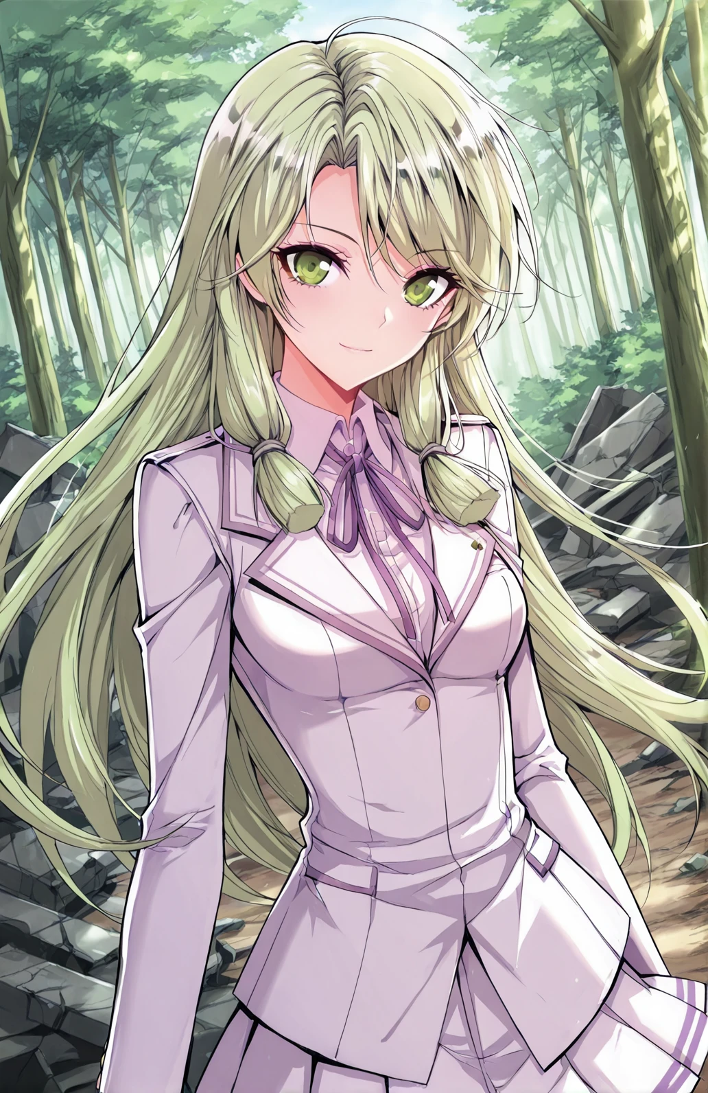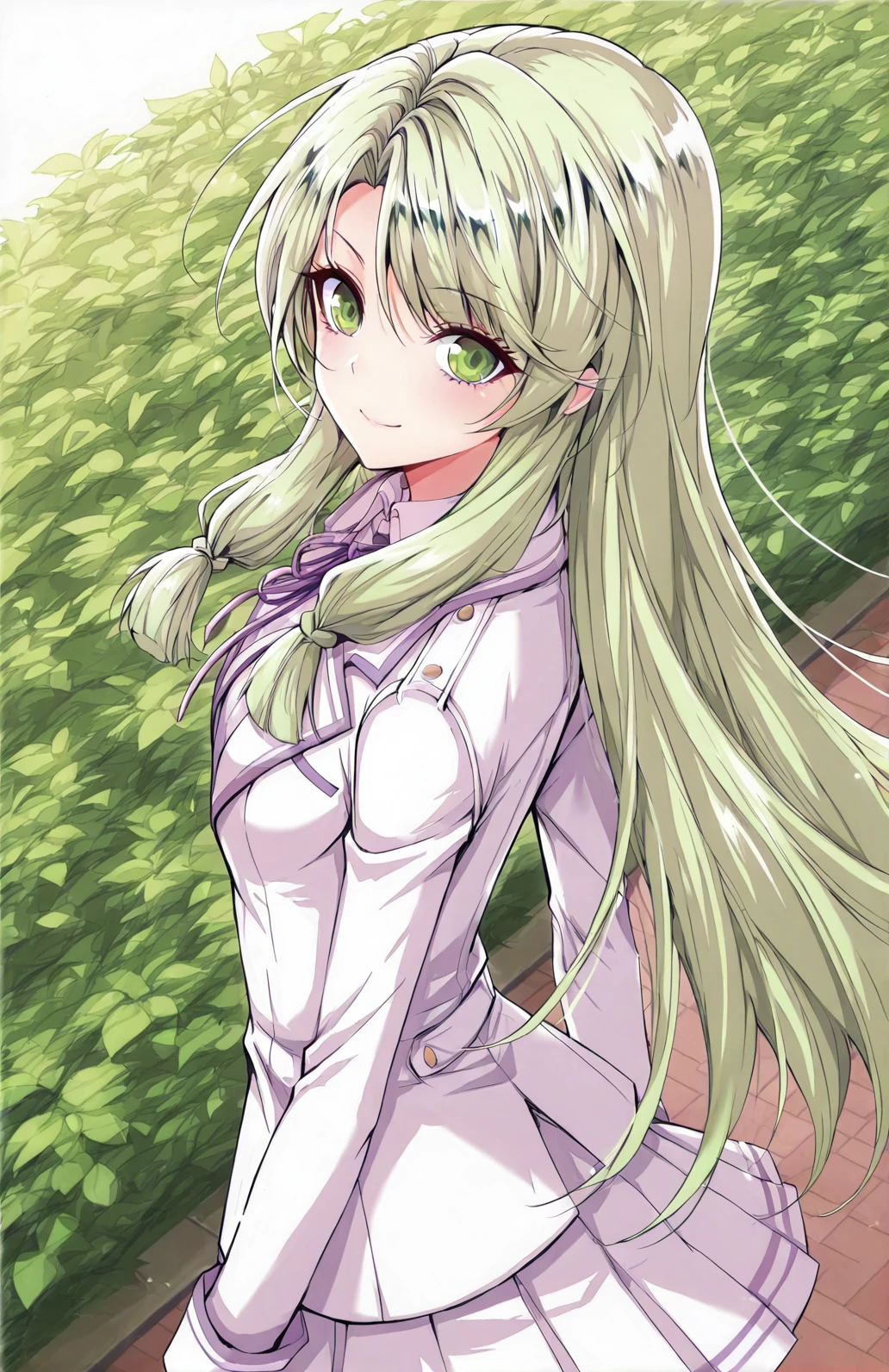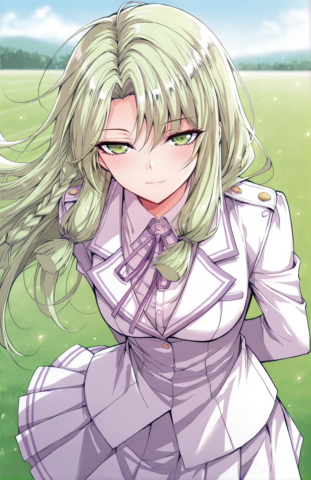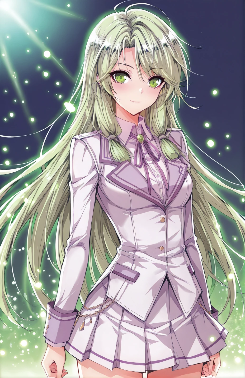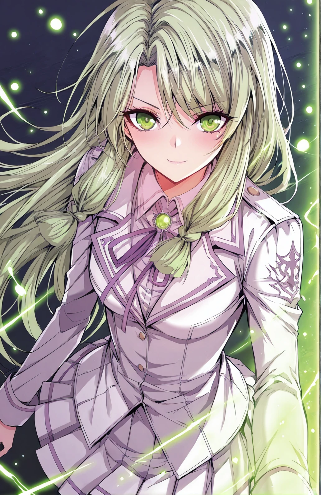 Yuner, 1 girl, solo, green eyes, long hair, light green hair, gradient green tips, side swept bangs, braid strands, loose side braid, tied sidelocks,