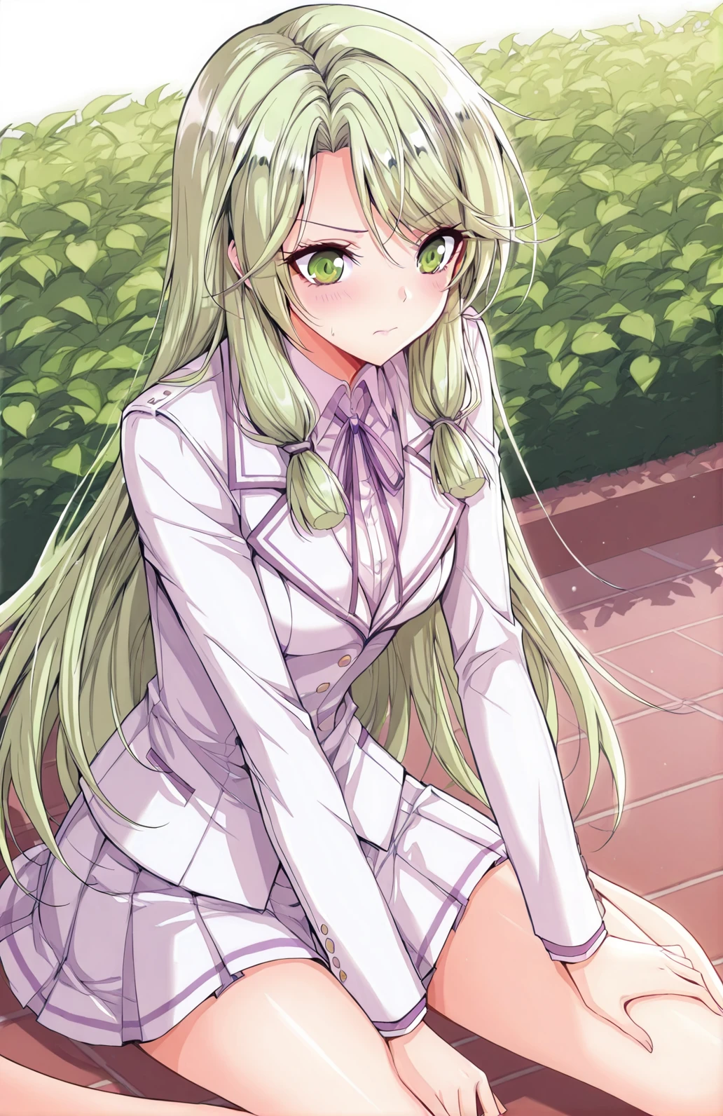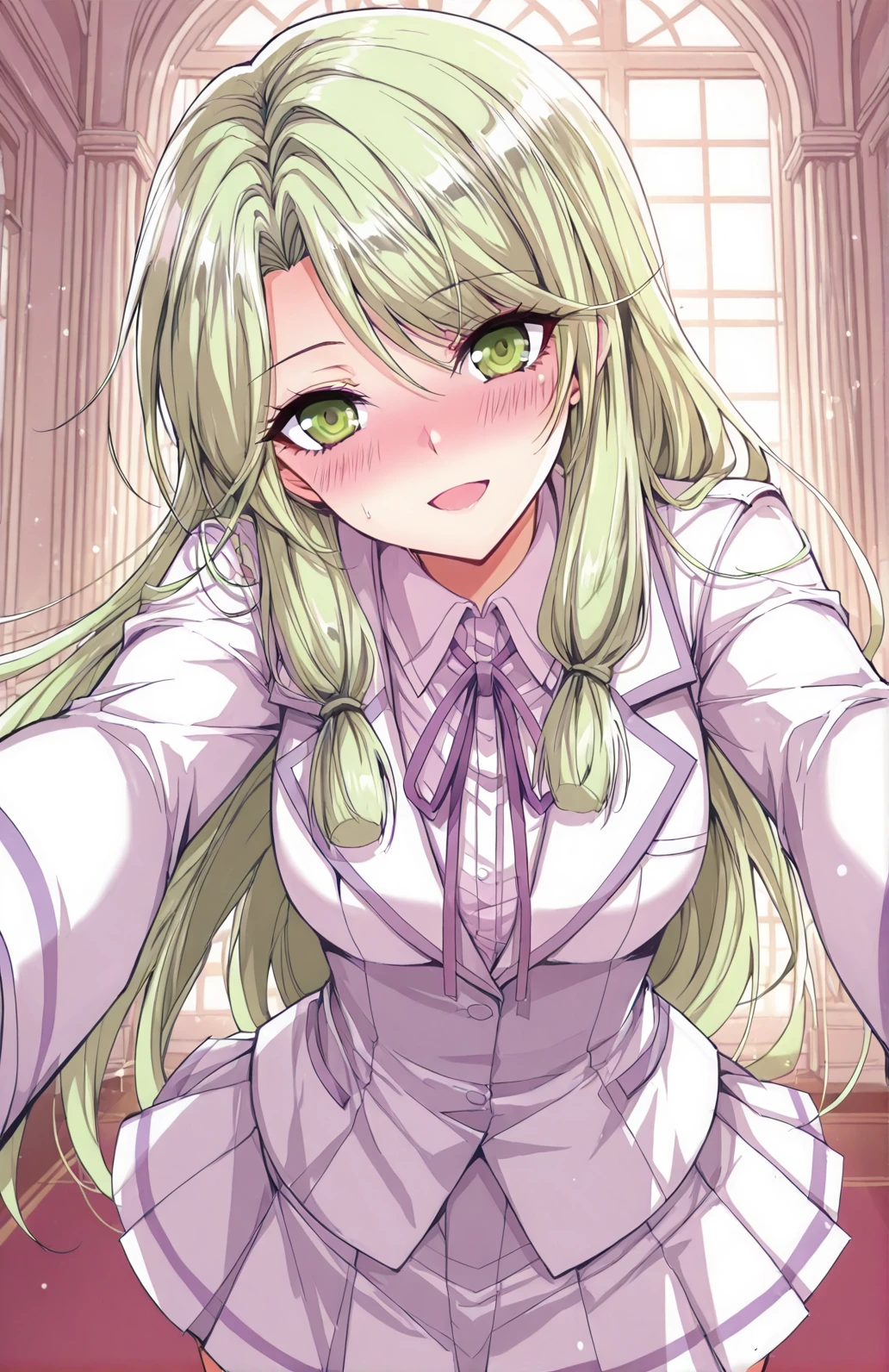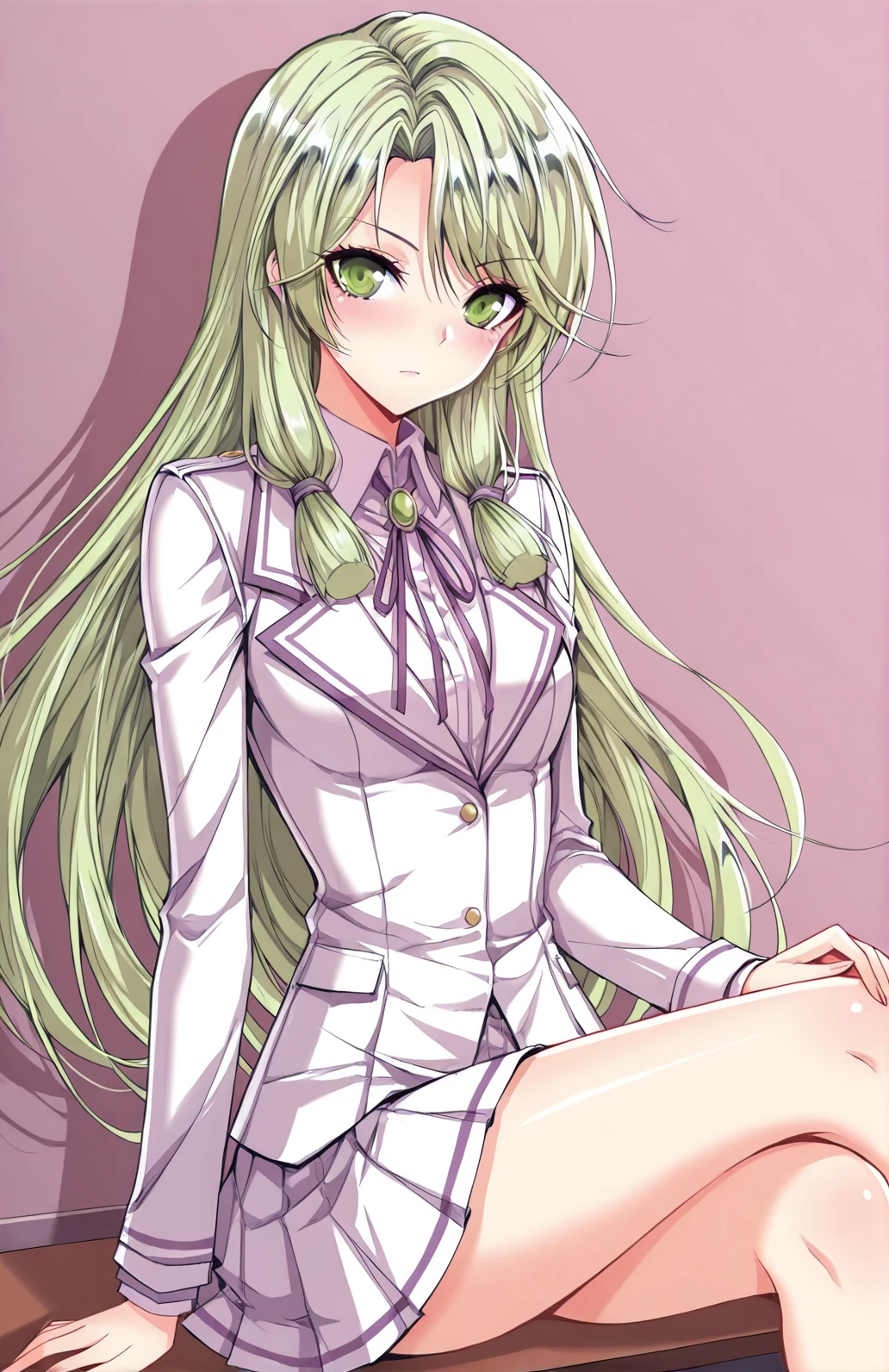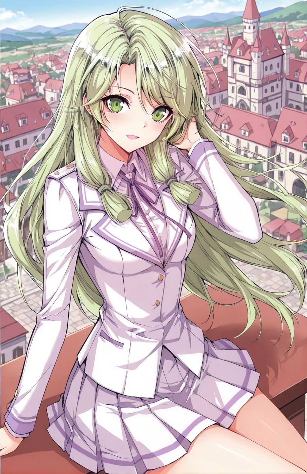 Yuner_outfit, school uniform, white jacket, fitted jacket, purple accents, lapel collar, purple ribbon bow, pleated skirt, short skirt, white skirt, white shirt, long sleeves