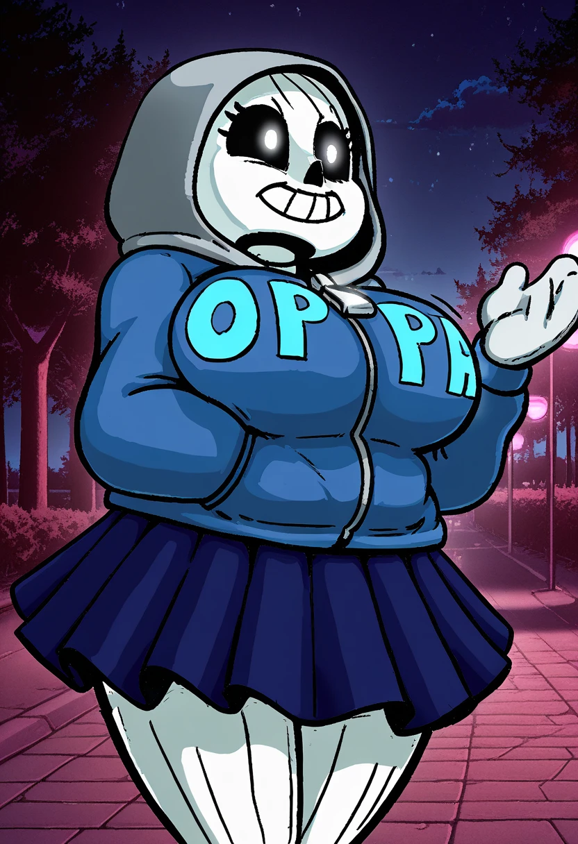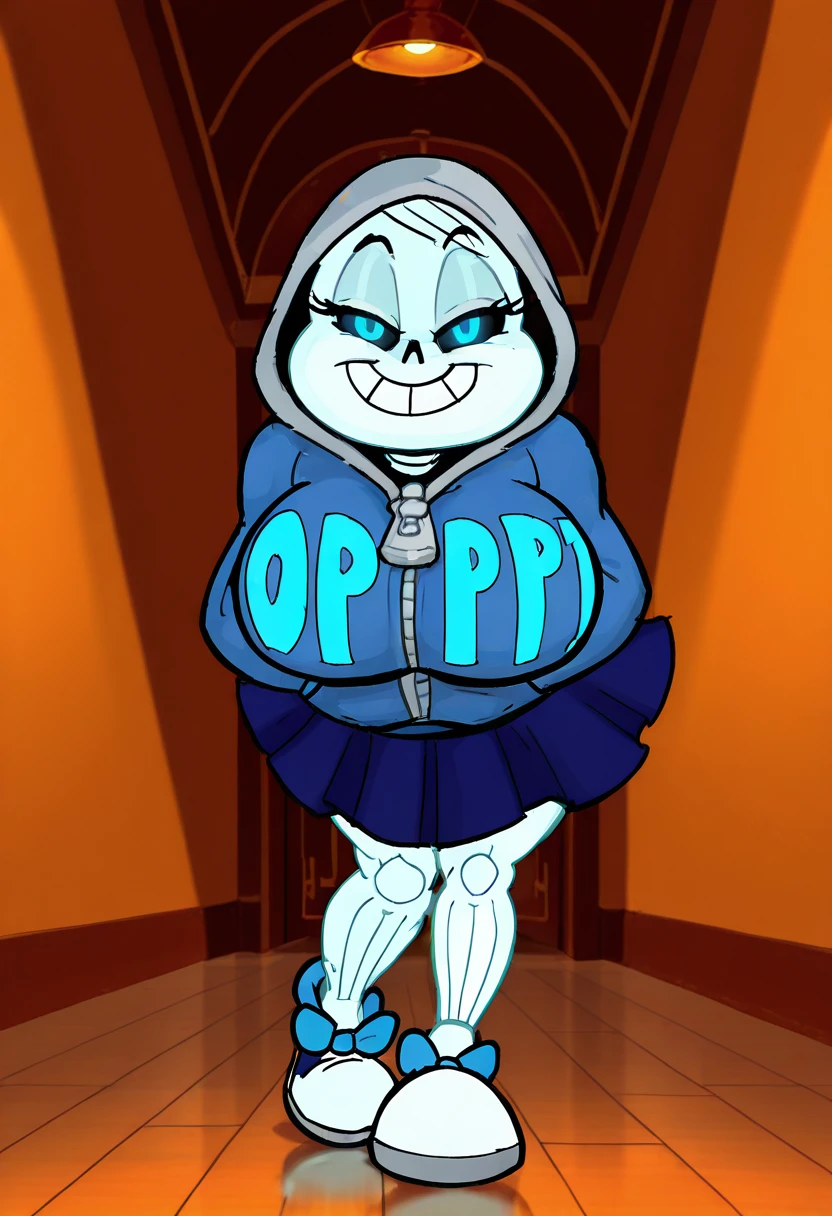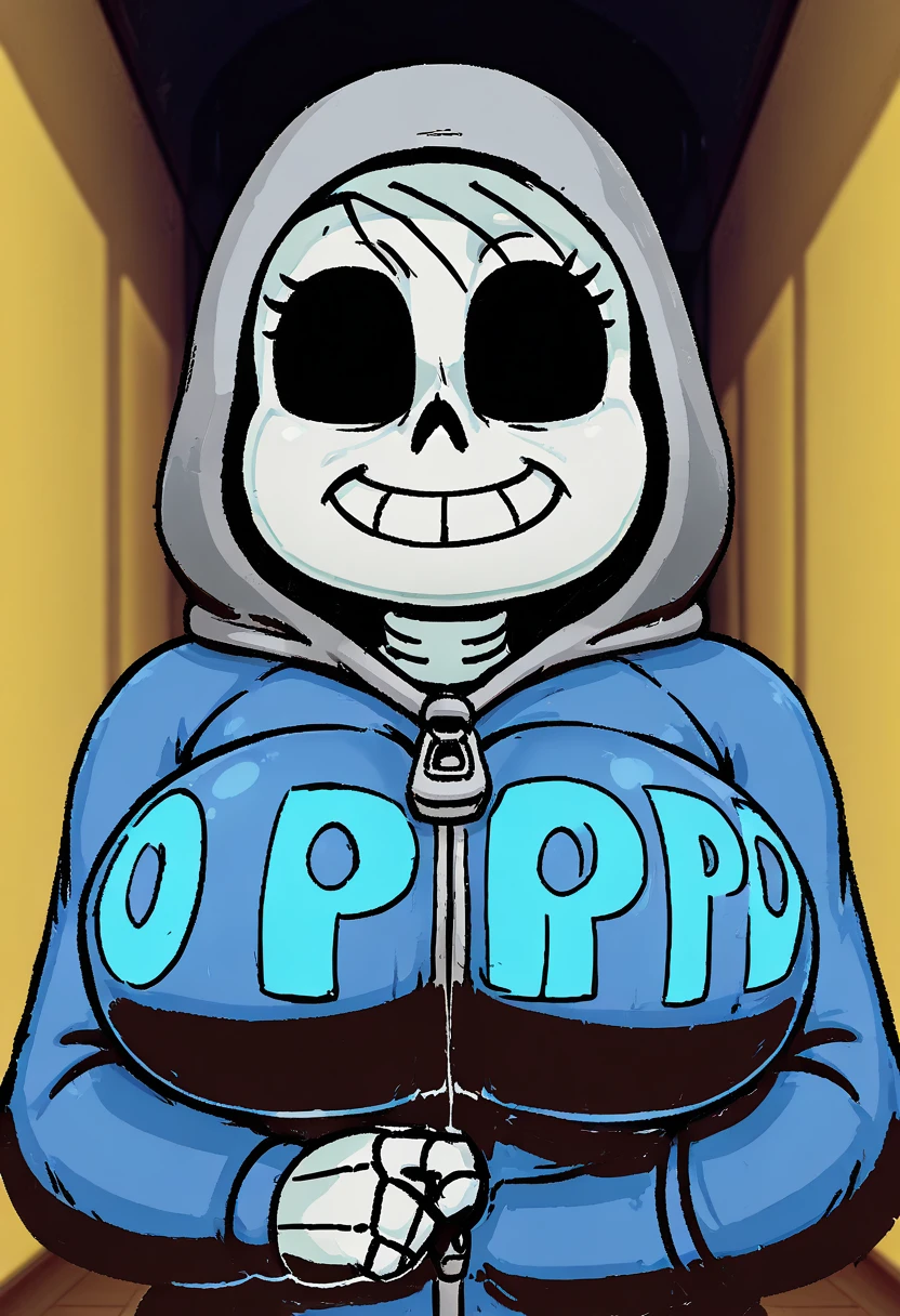 hertcommic1,expressive cartoon features, skeleton head,Cartoon Skull head, white eyes, blue eyes, hair strands ,3–5 short curved hair tufts , Blue hoodie, gray hood, hood up, zip-up hoodie, giant zipper, bold Oppai letters on hoodie, gray snow gloves,