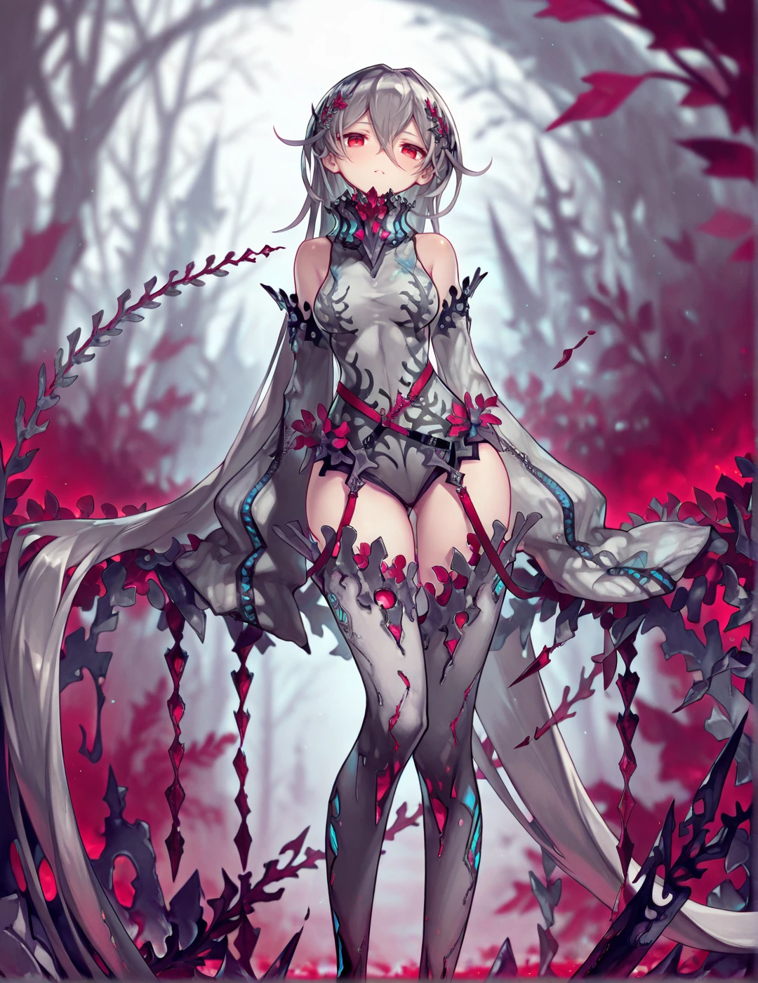 laevateinne, 1girl, solo, absurdly long hair, grey hair, grey leotard, red eyes, thighhighs, detached sleeves, bare shoulders, sleeves past wrists, turtleneck, medium breasts, grey thighhighs, thigh boots