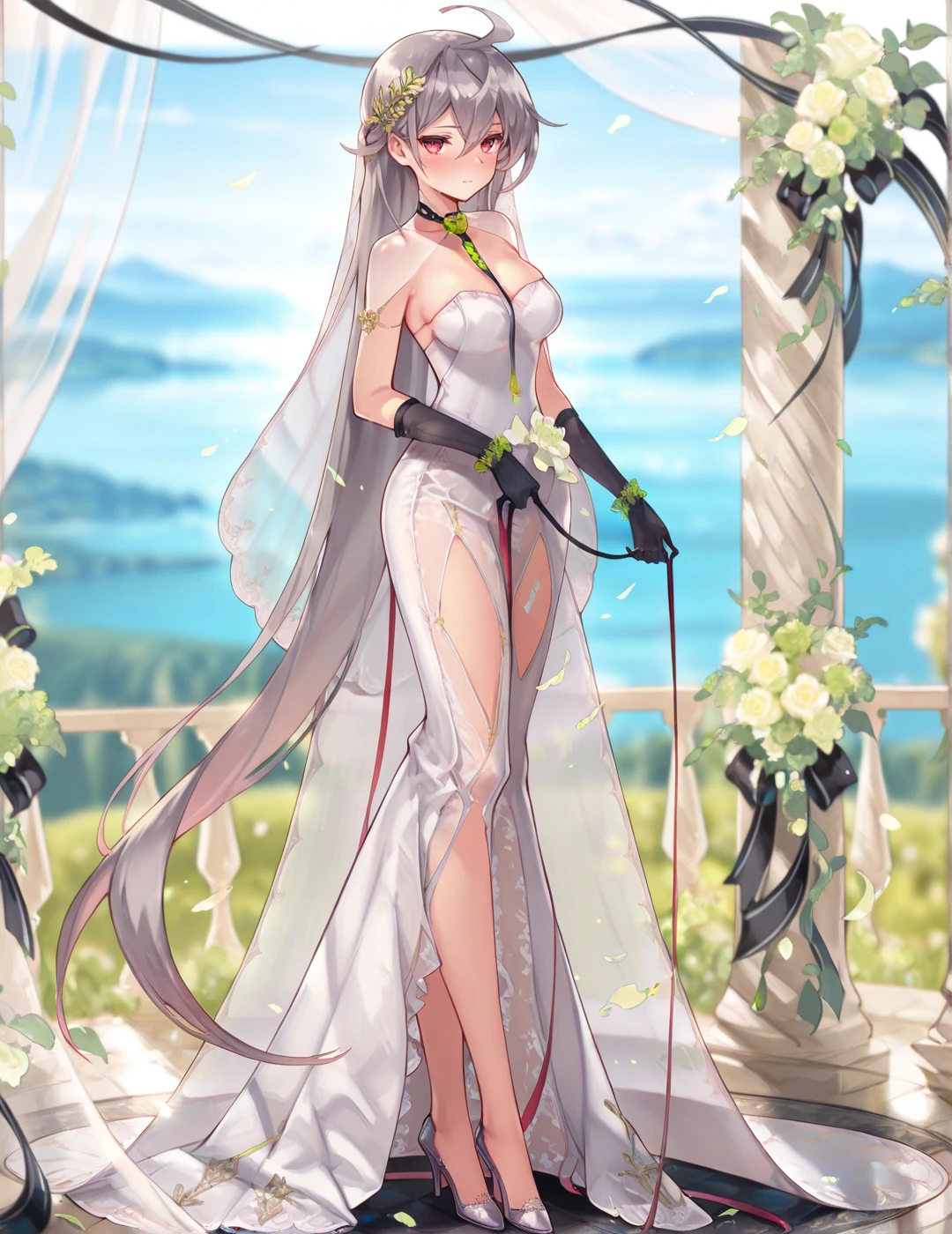 laevateinnd, 1girl, very long hair, white dress, grey hair, ahoge, black gloves, wedding dress, veil, leash, hair ornament, solo, strapless, high heels