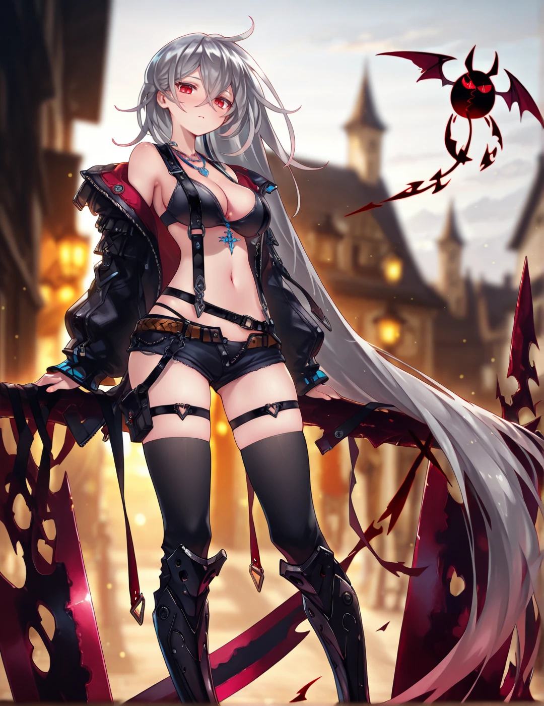 laevateinnb, 1girl, very long hair, suspenders, navel, grey hair, red eyes, cleavage, belt, open fly, black jacket, short shorts, black thigh-highs, gradient hair, multicolored hair, black bikini top, high leg panties, black boots, armored boots