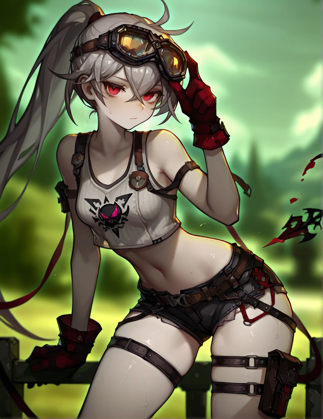 laevateinnm, 1girl, red gloves, solo, gloves, goggles on head, red eyes, ponytail, short shorts, crop top, grey hair, tank top, long hair, thigh strap, shirt