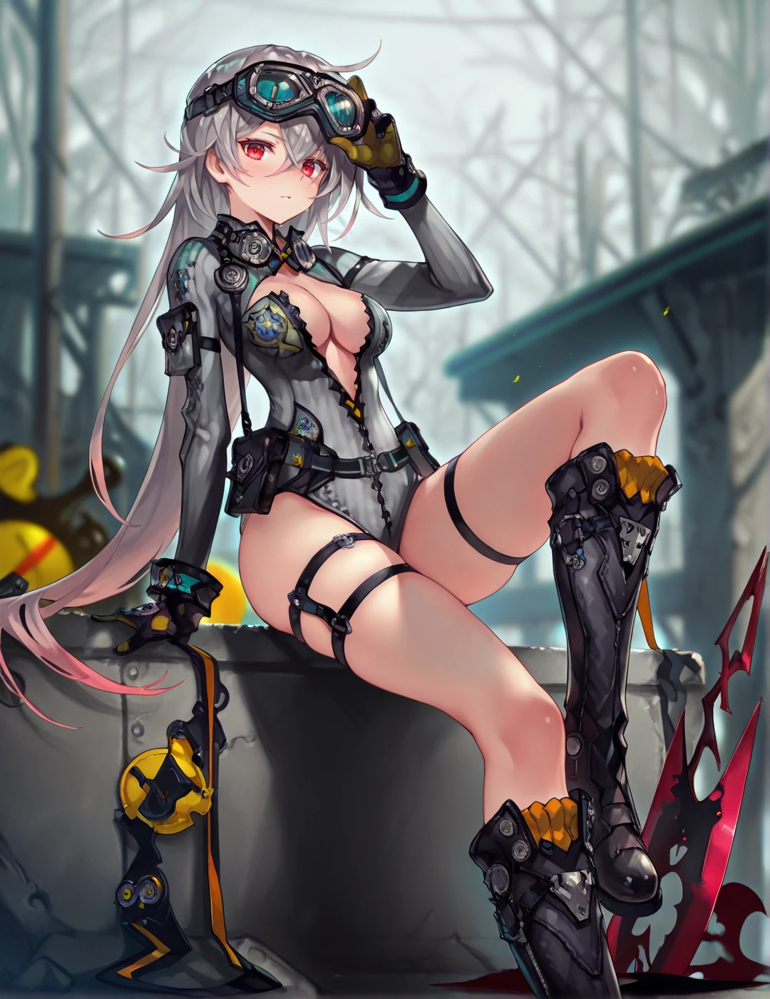 laevateinnc, 1girl, long hair, boots, goggles on head, red eyes, grey hair, knee boots, medium breasts, cleavage, center opening, grey leotard, thigh strap, gloves, gradient hair, solo