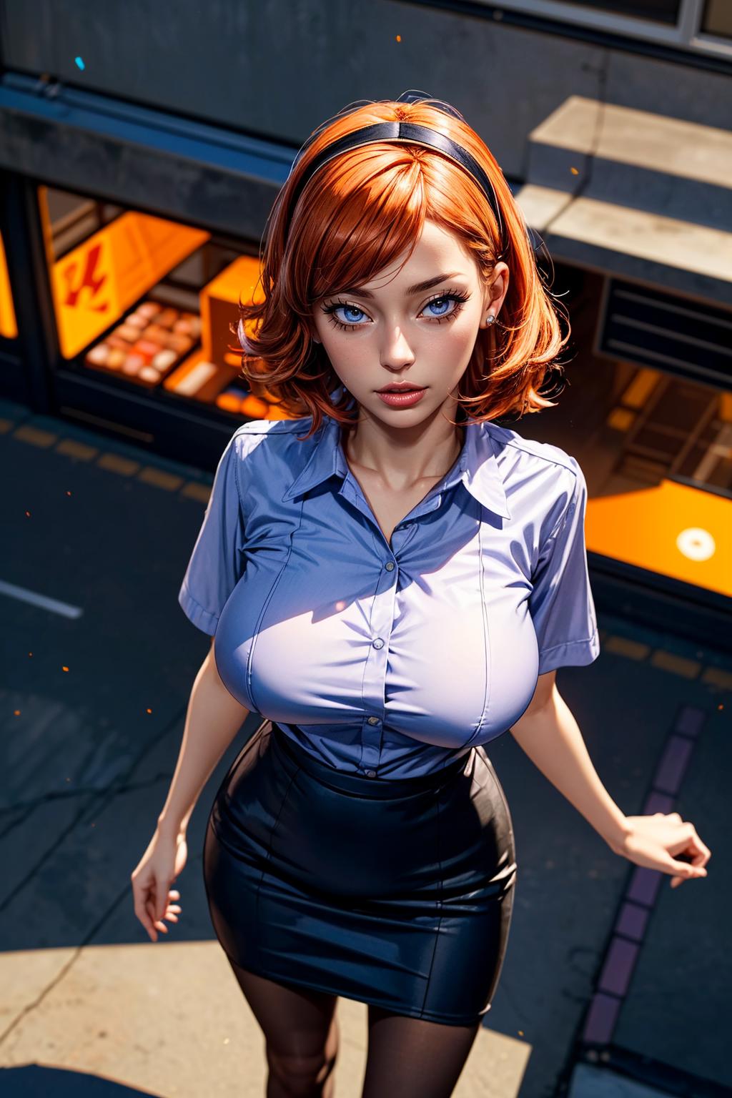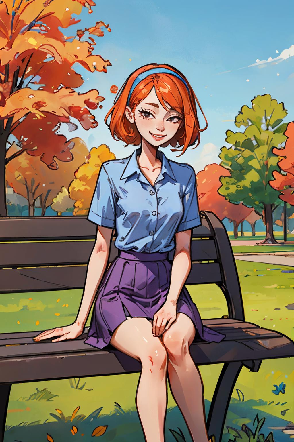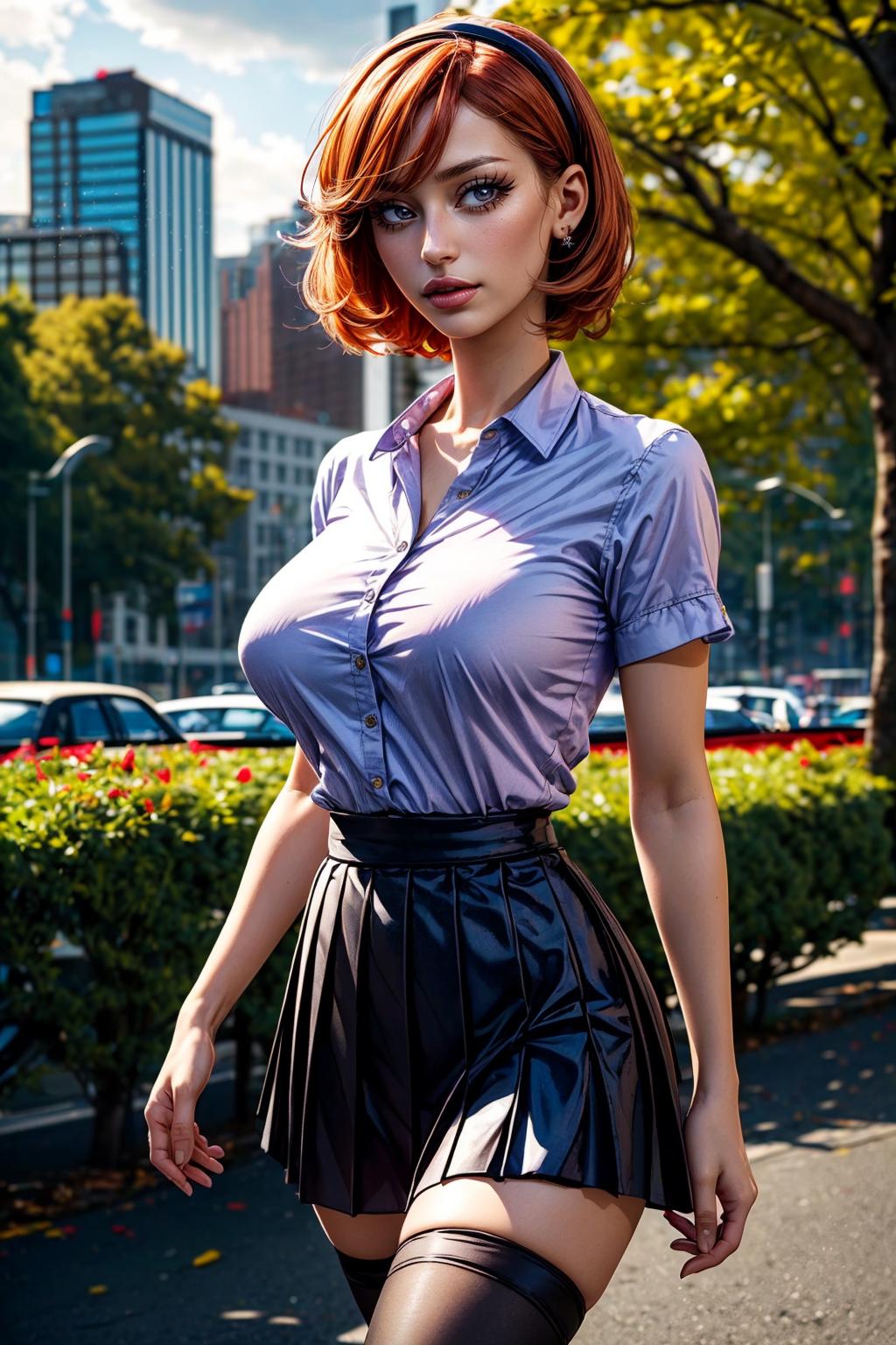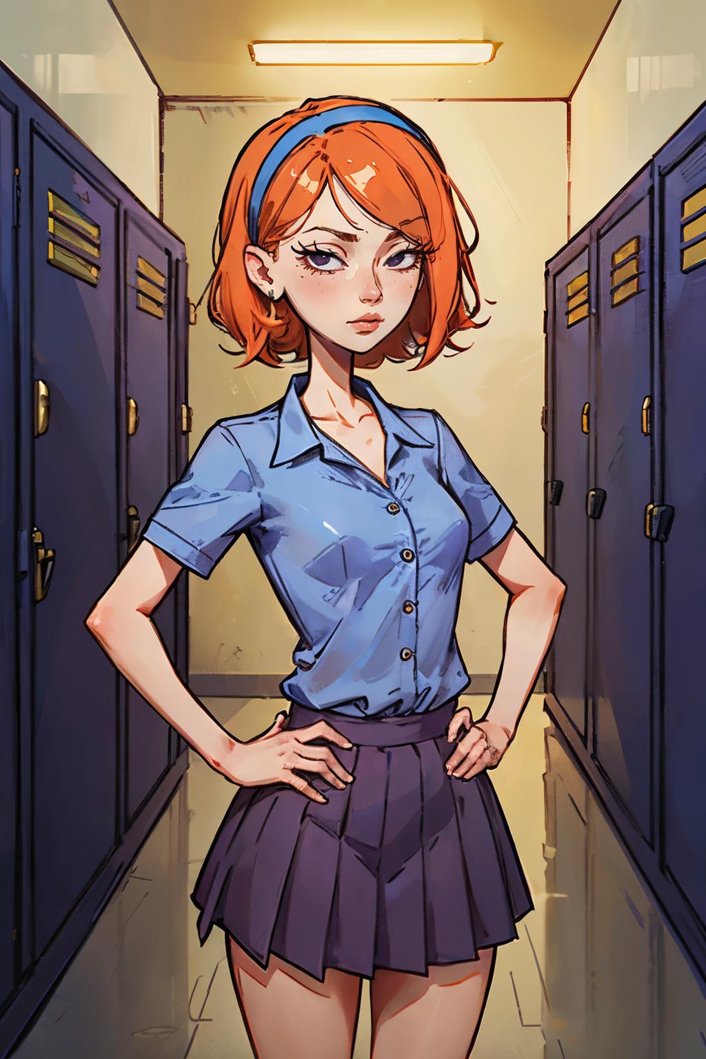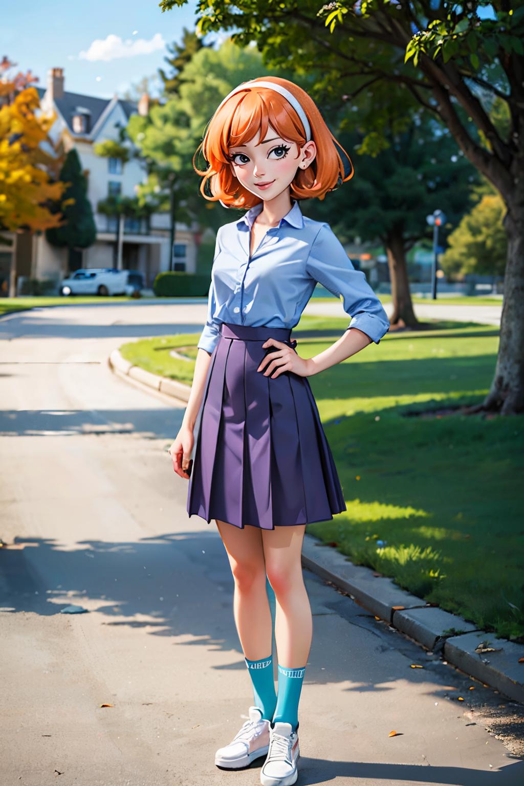 ✦ The main trigger words is 1girl, full body, hairband, long hair, orange hair, pleated skirt, purple skirt, shirt, skirt, socks, small black pupils, mini pupils,