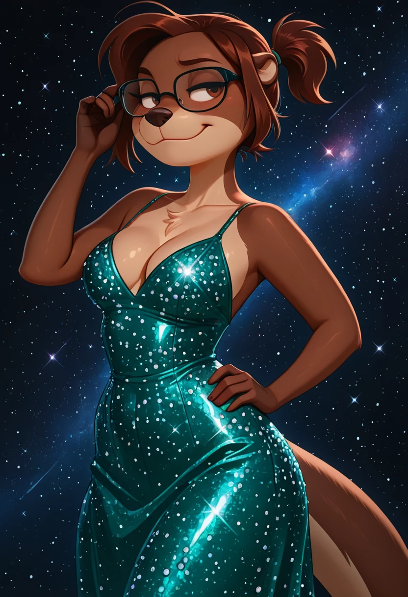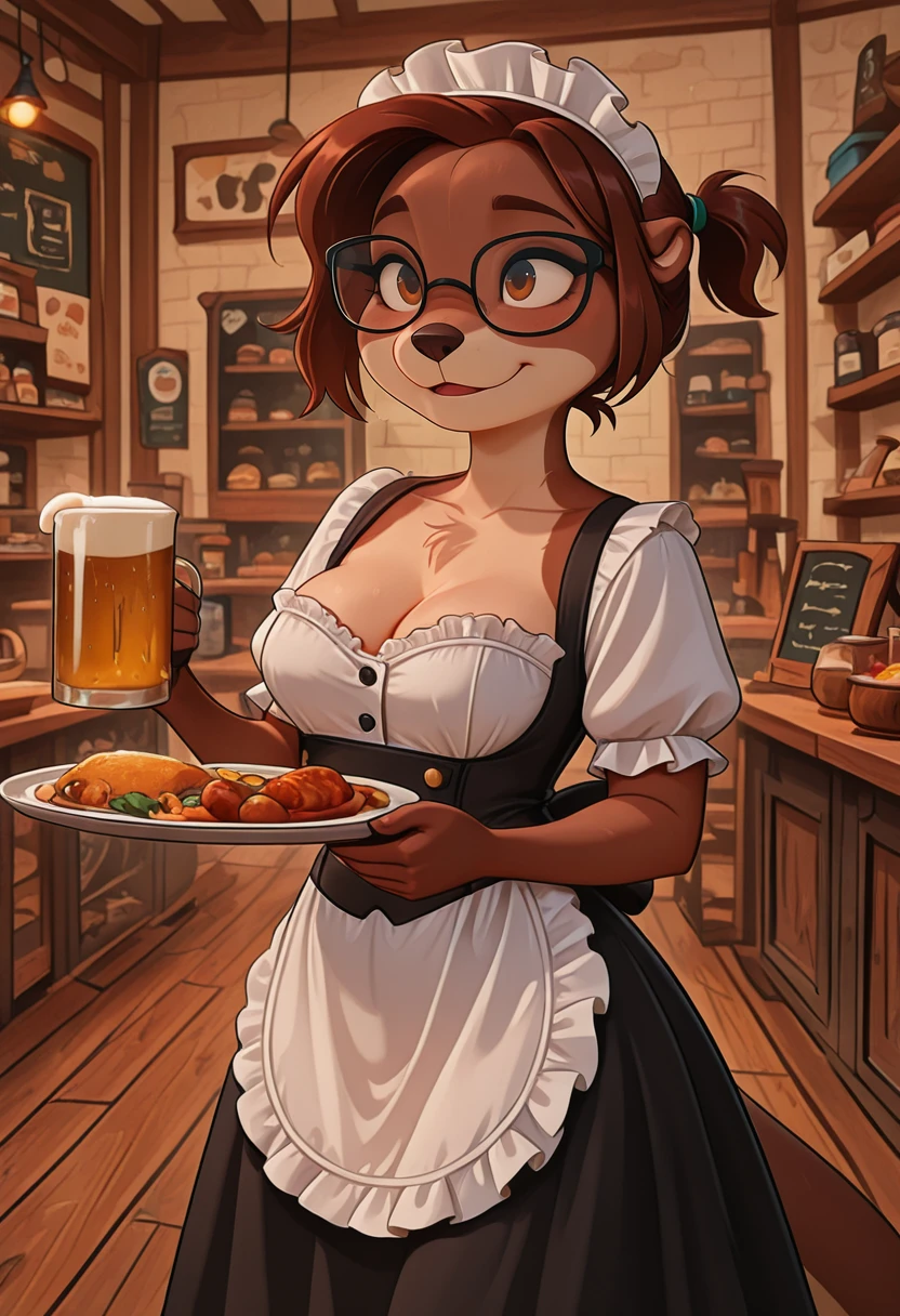 Create Sonia, a female furry otter with brown fur and a short ponytail in the back and glasses (if desired).