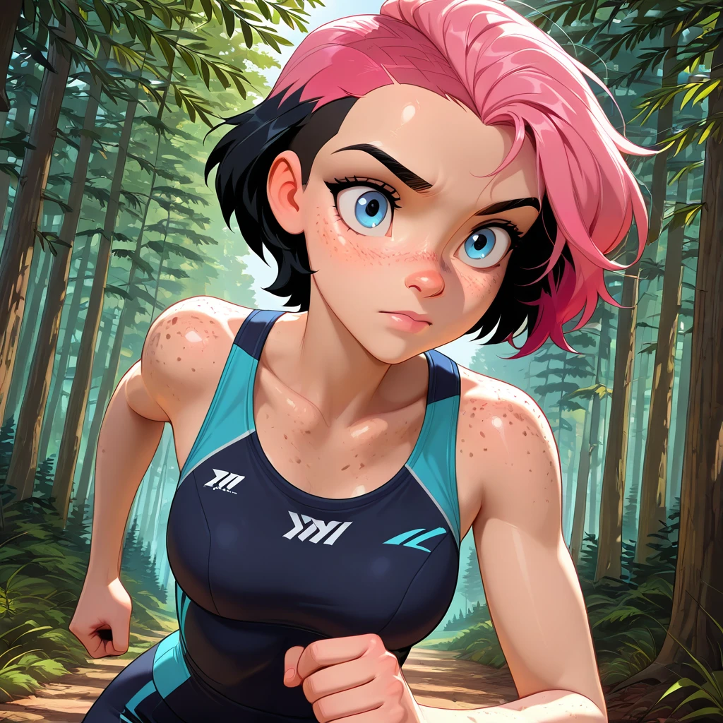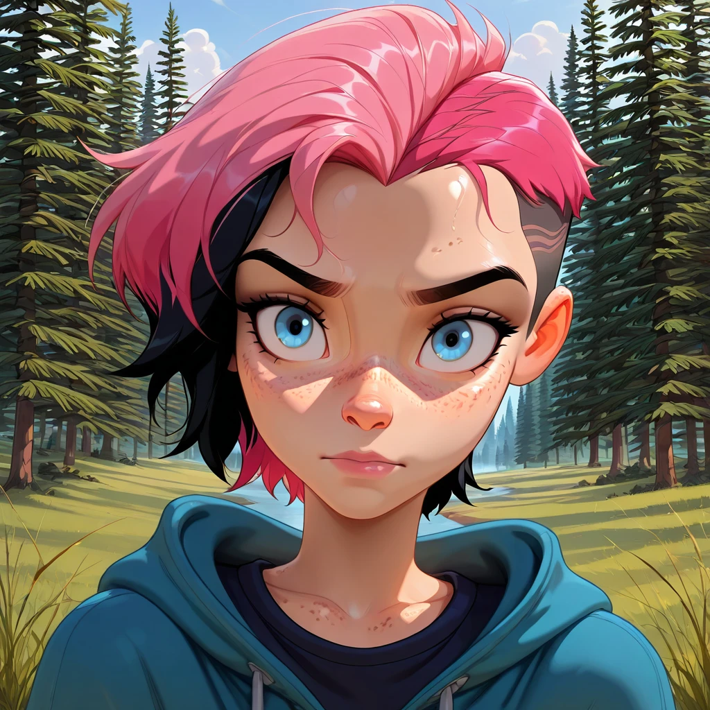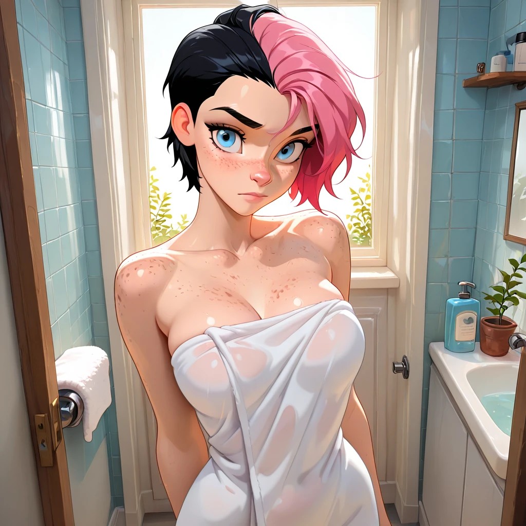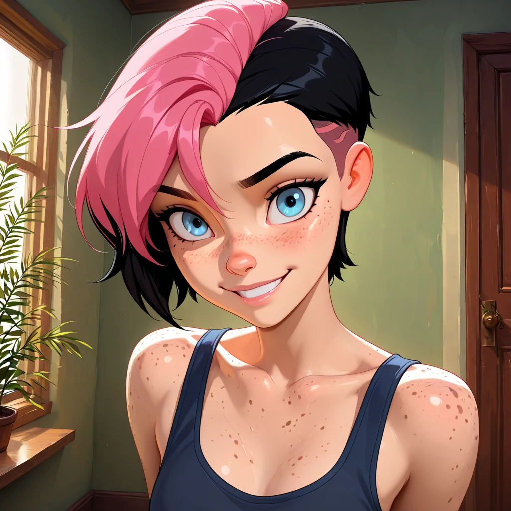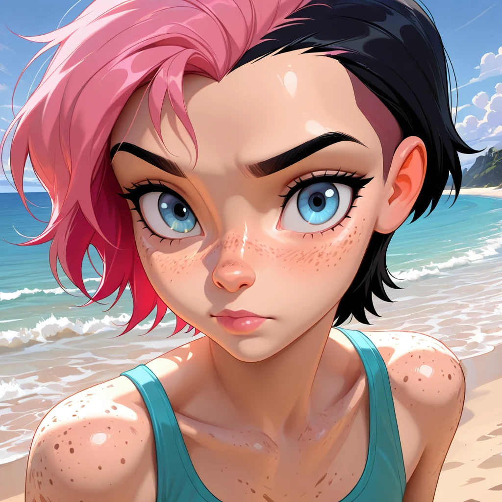 Willow_OC, 1girl, 1girl, freckles, short hair, sidecut, pink hair, black hair, multicolored hair, bright blue eyes, light skin