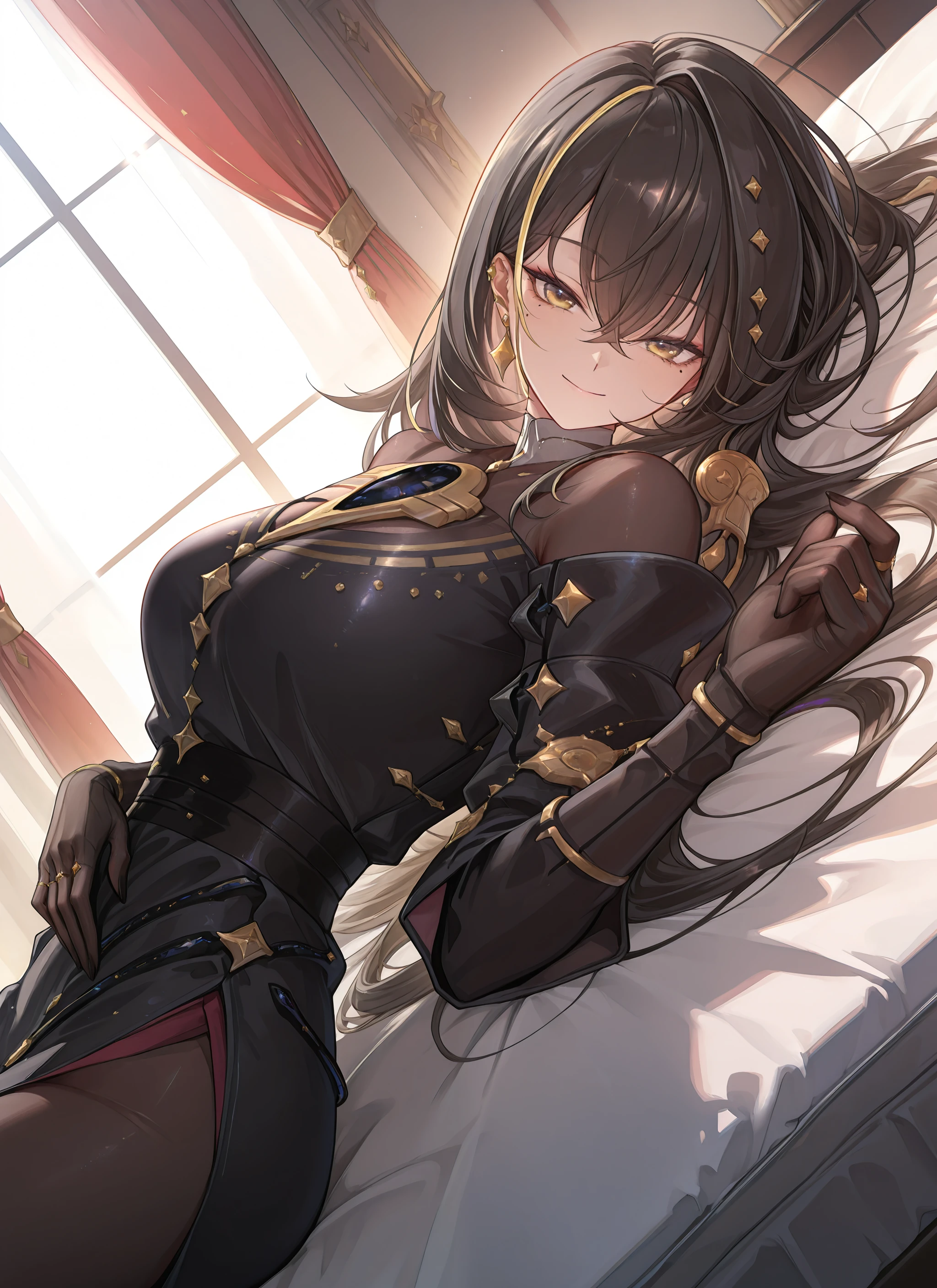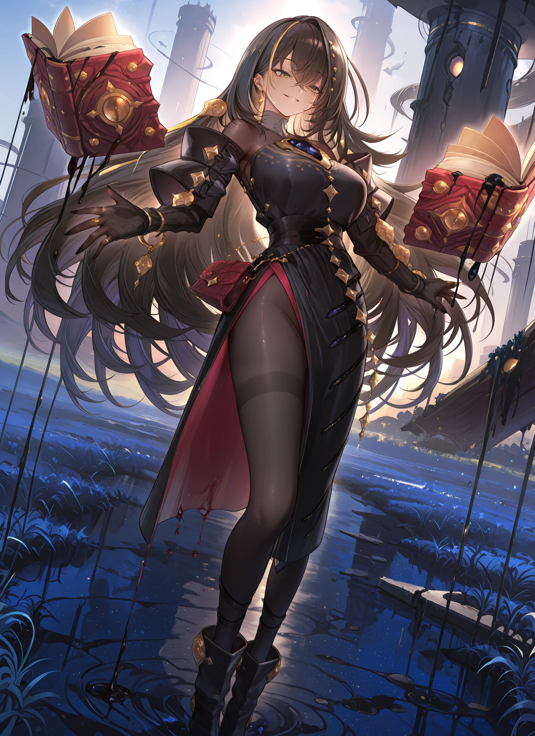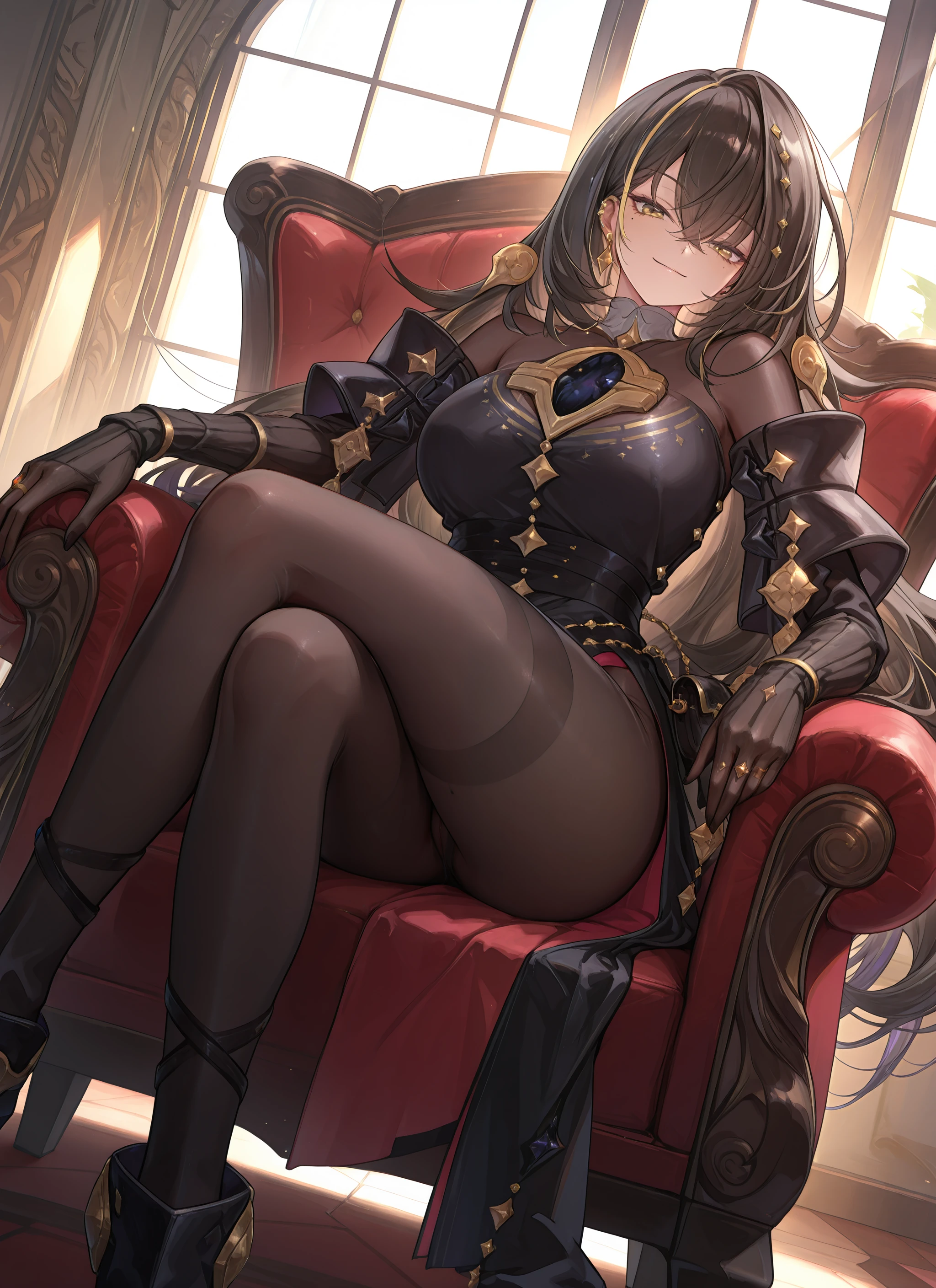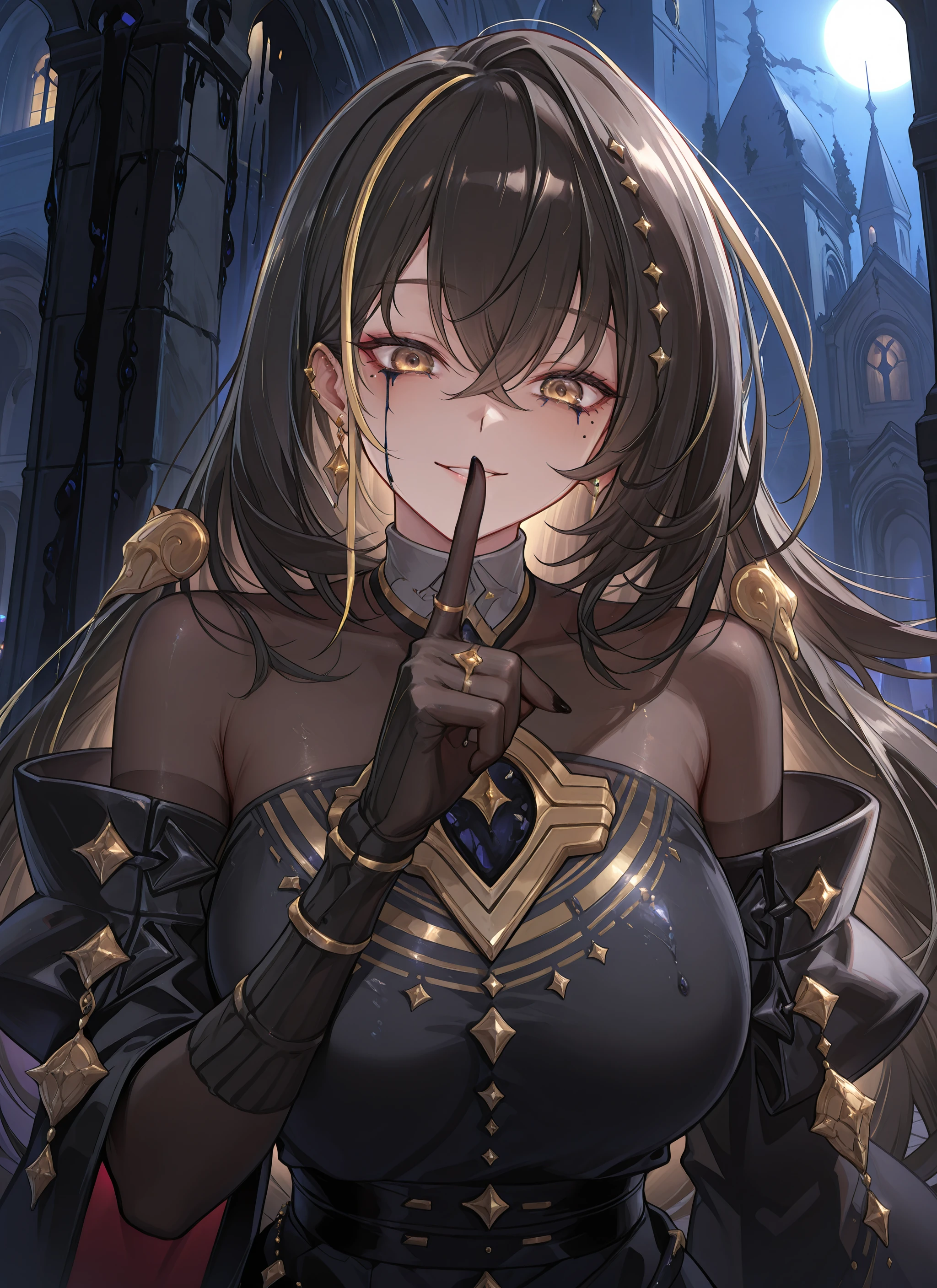 kandima, long hair, black hair, multicolored hair, hair ornament, yellow eyes, mole under eye, earrings, jewelry, black dress, black gloves, detached sleeves, bodystocking, black pantyhose, high heel boots, large breasts, ringDescription
