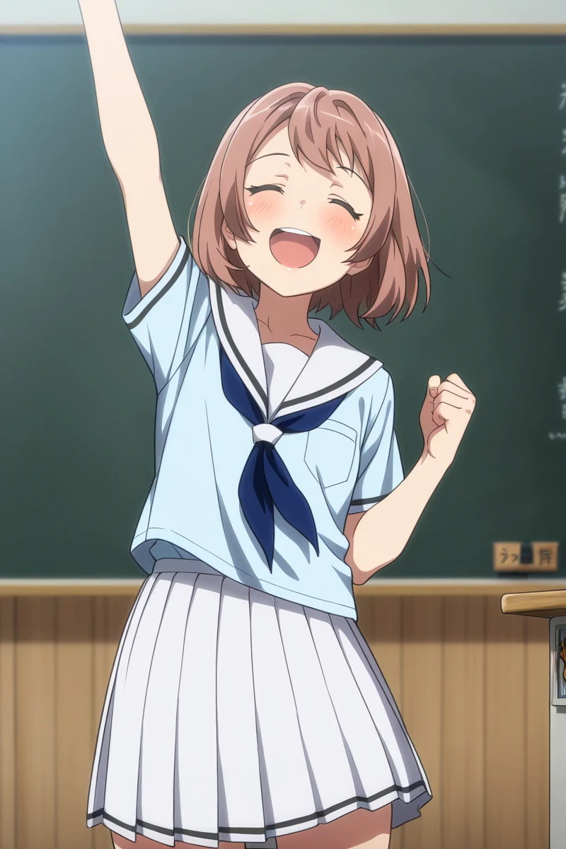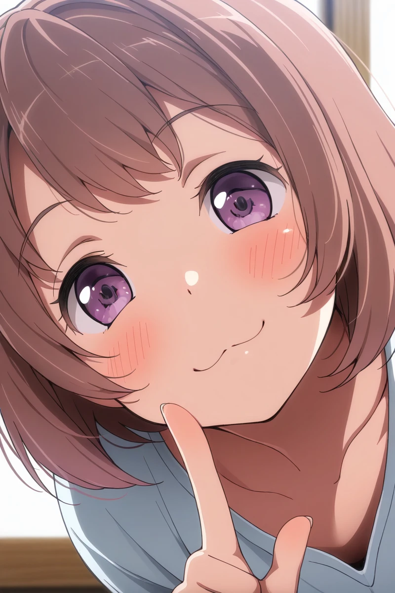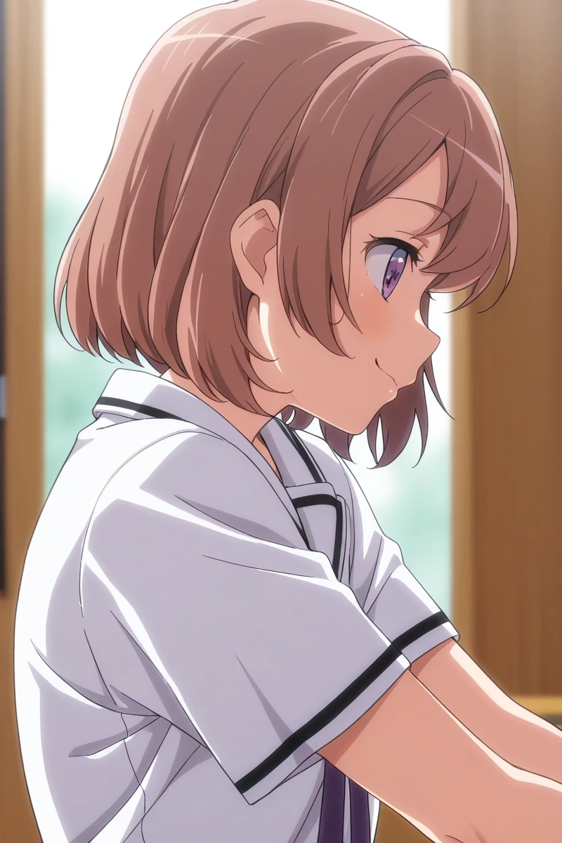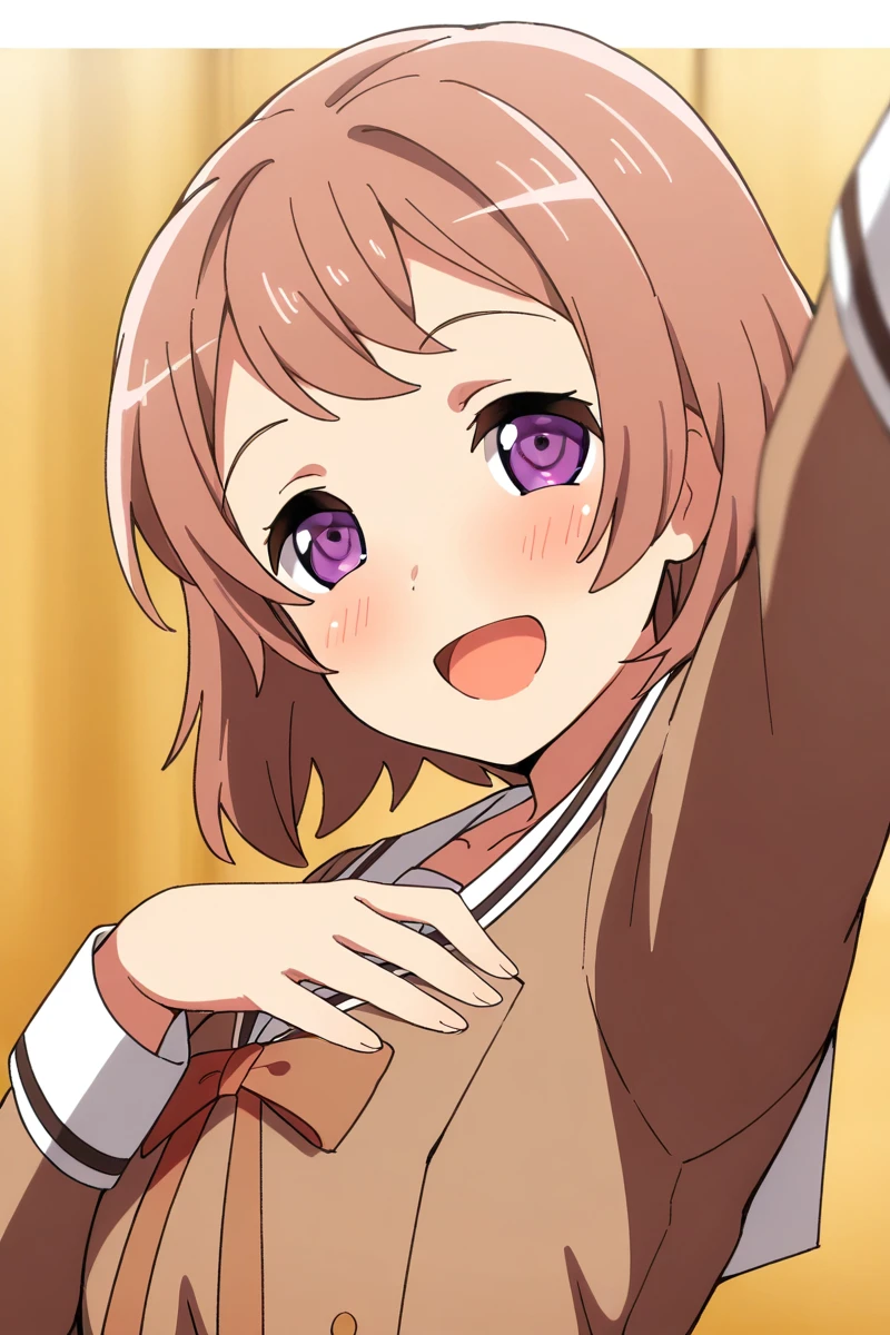nijikkihinako, 1girl, solo, smile, school uniform, dress, looking at viewer, brown hair, short hair, red ribbon, hanasakigawa school uniform, sailor dress, blush, ribbon, purple eyes, double-breasted, long sleeves, pleated dress, buttonsDescription