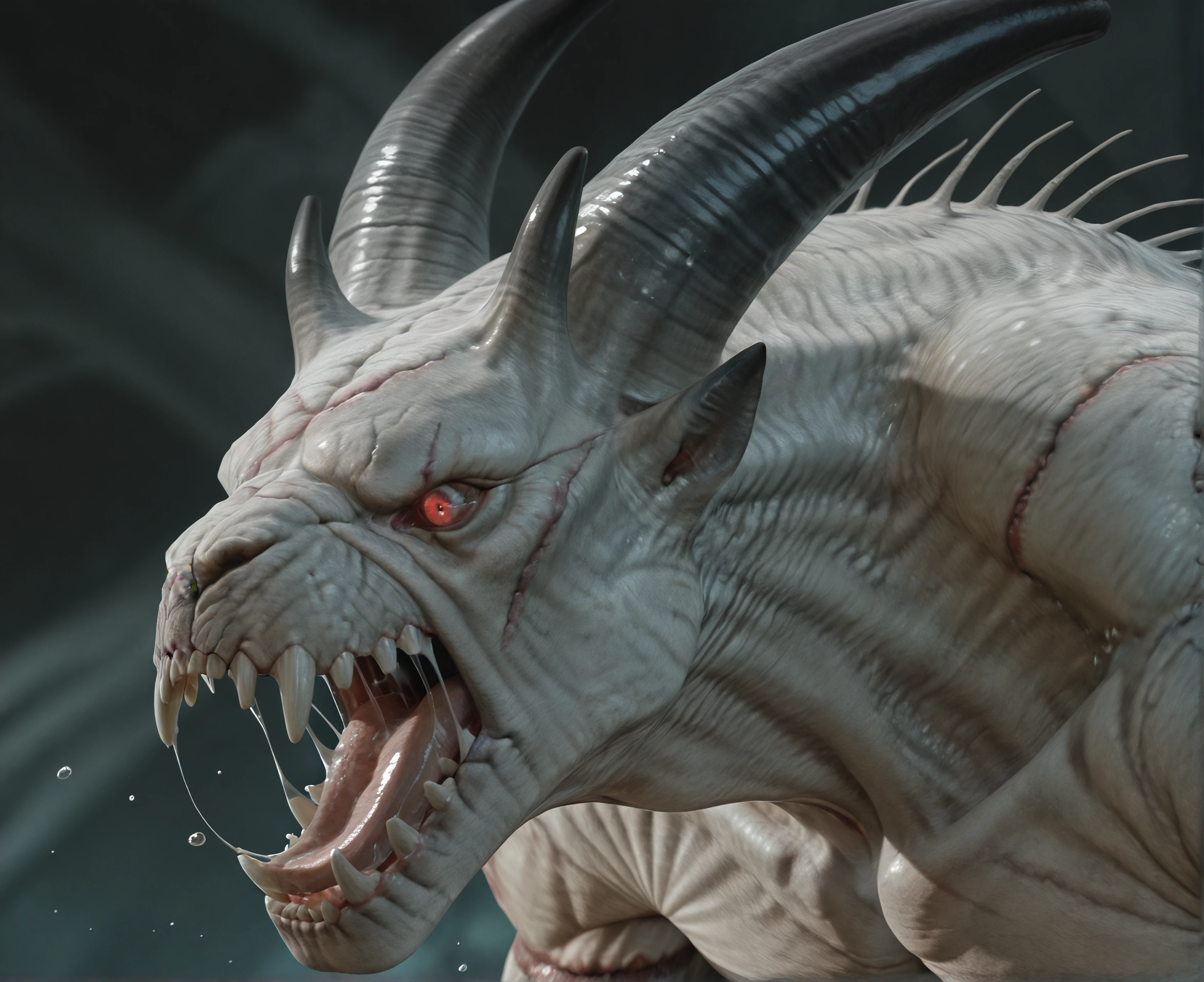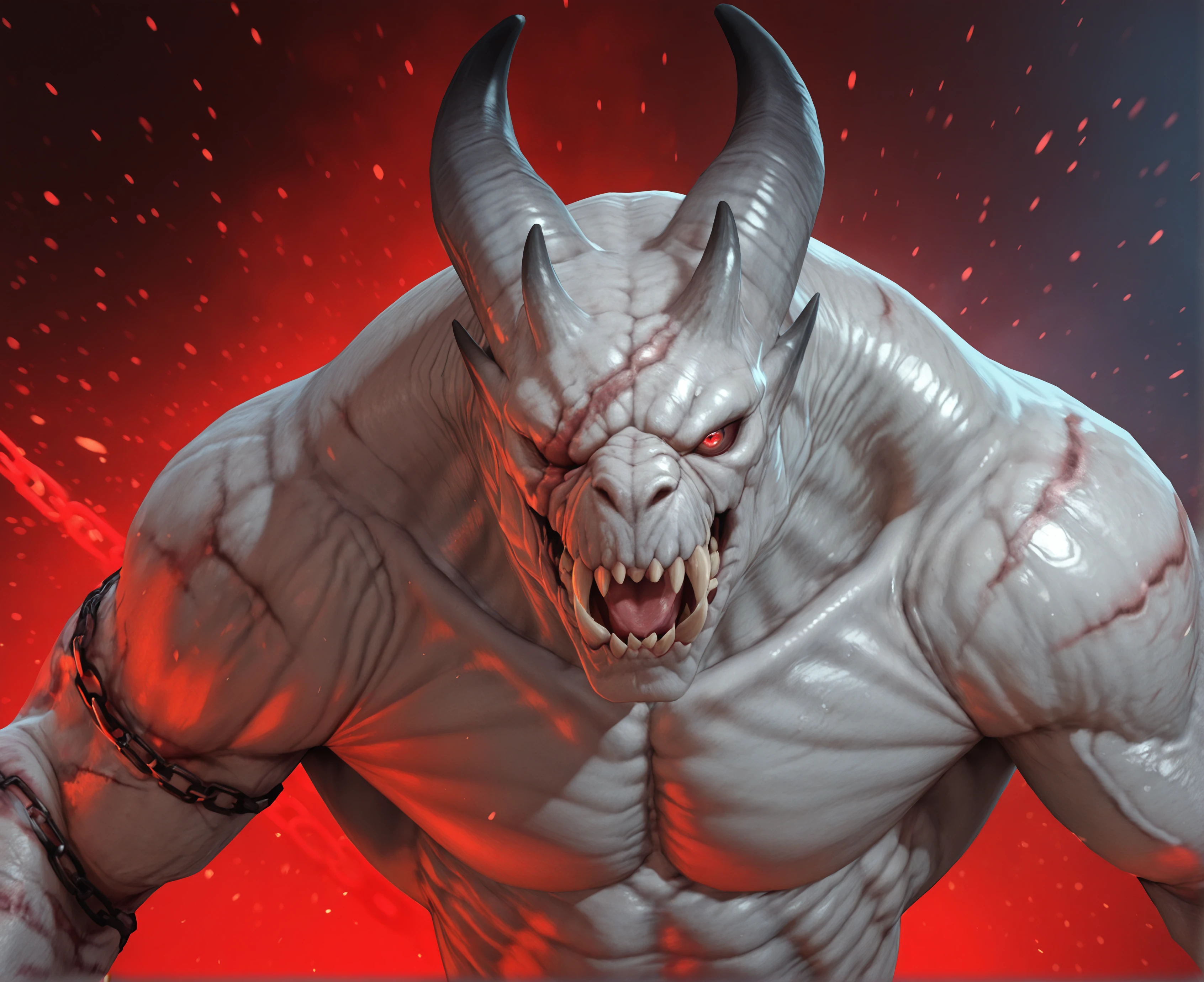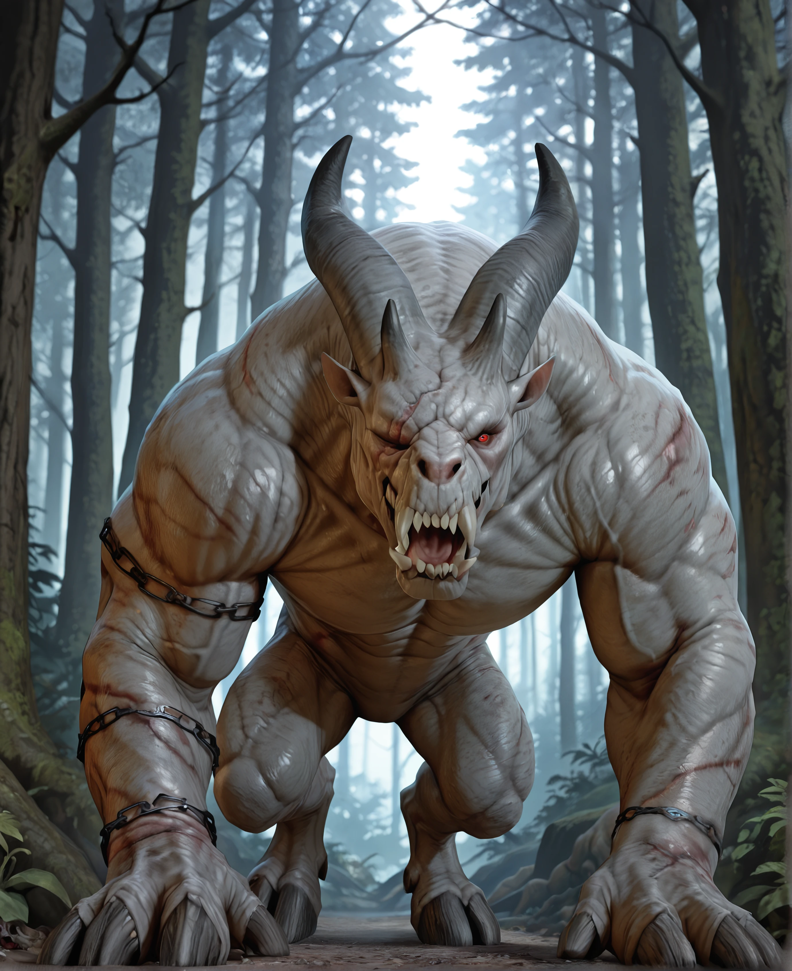 Tags: ash3n blight, monster, creature, horns, muscular, sharp teeth, hunched, thick neck, broad shoulders, wide ?????, scars, missing eye, hooves, digitigrade, chains, chains embedded in arms, ...