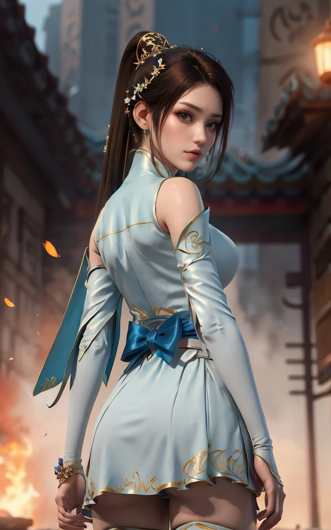1girl, hair ornament, ponytail, brown hair, long hair, jewelry, earrings, hair bun, medium breasts, brown eyes, bow, single hair bun, lips,