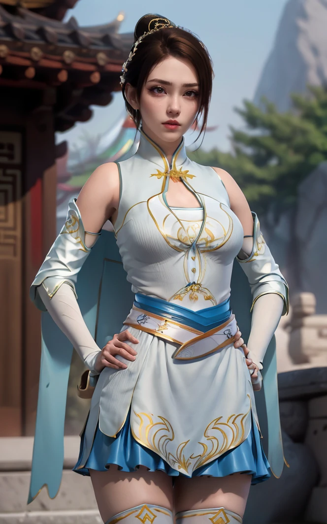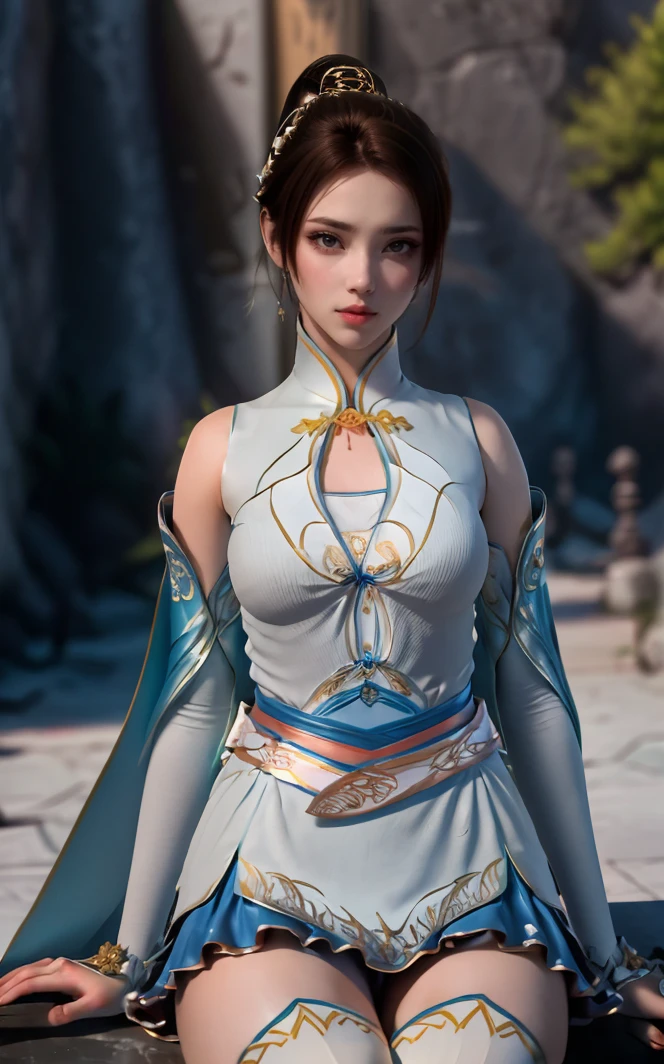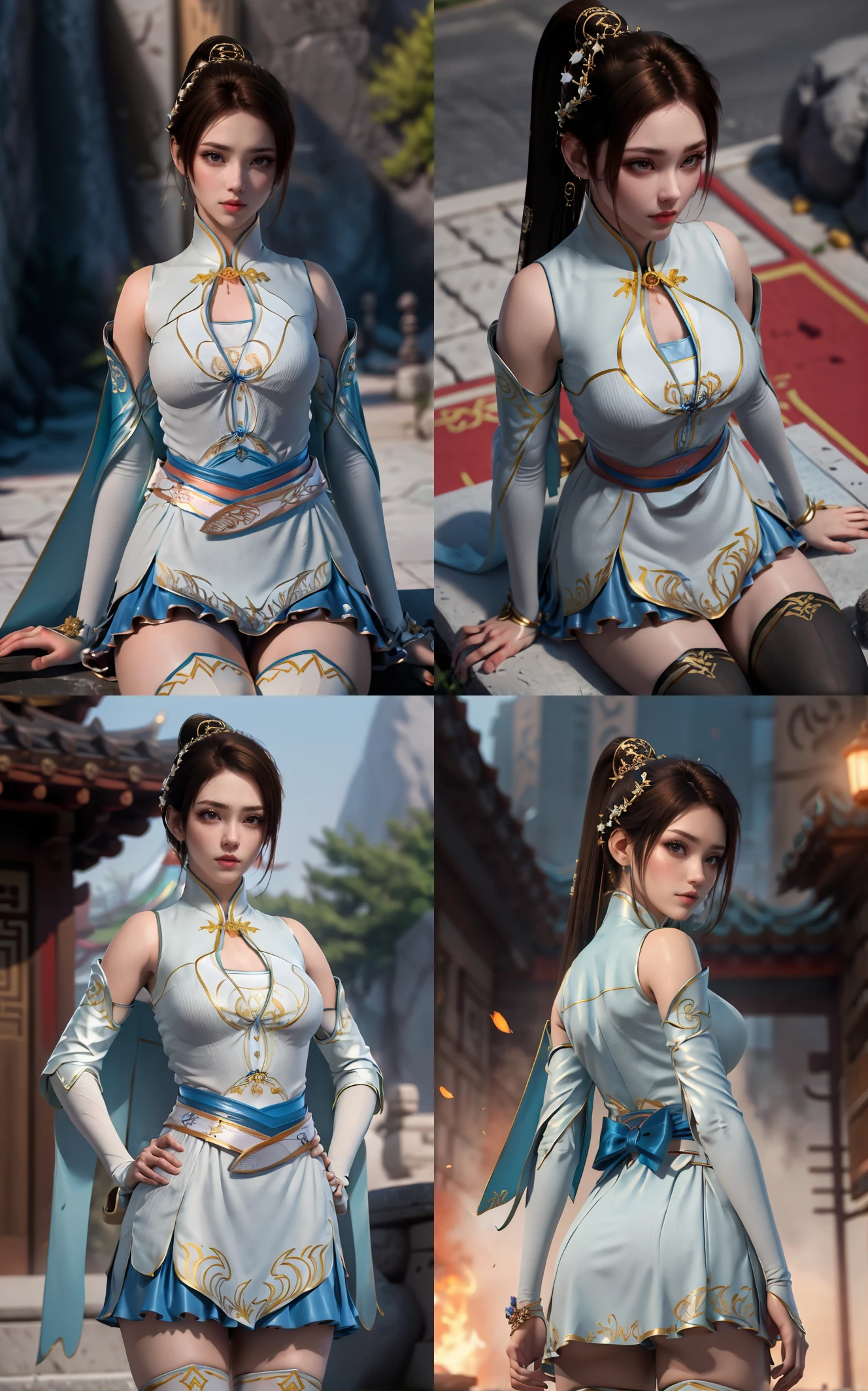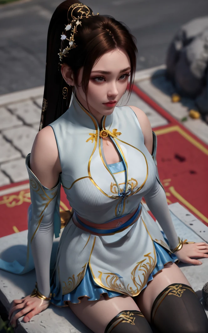 chinese clothes, blue dress, clothing cutout, detached sleeves, china dress, cleavage cutout, dress, thighhighs, bare shoulders, sash, cape, white dress, zettai ryouiki, elbow gloves, short dress,