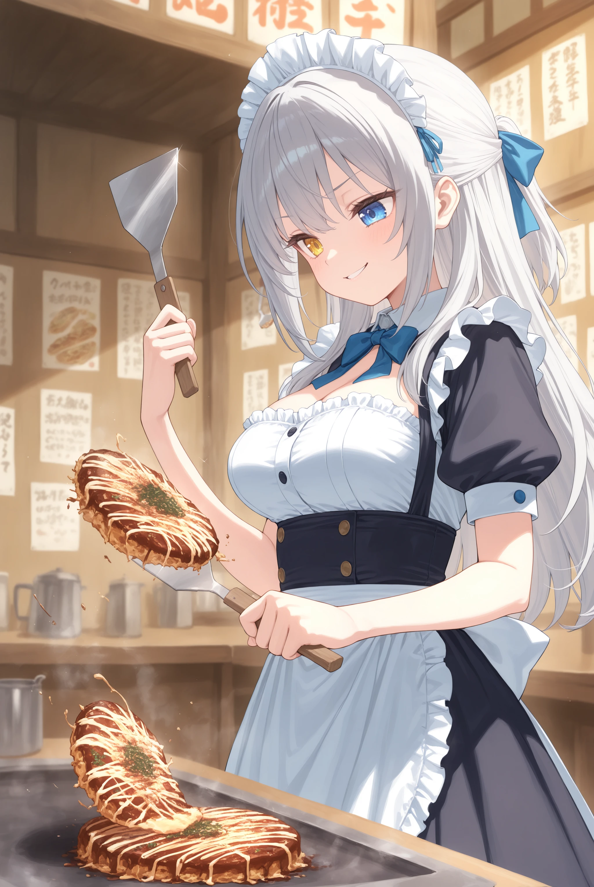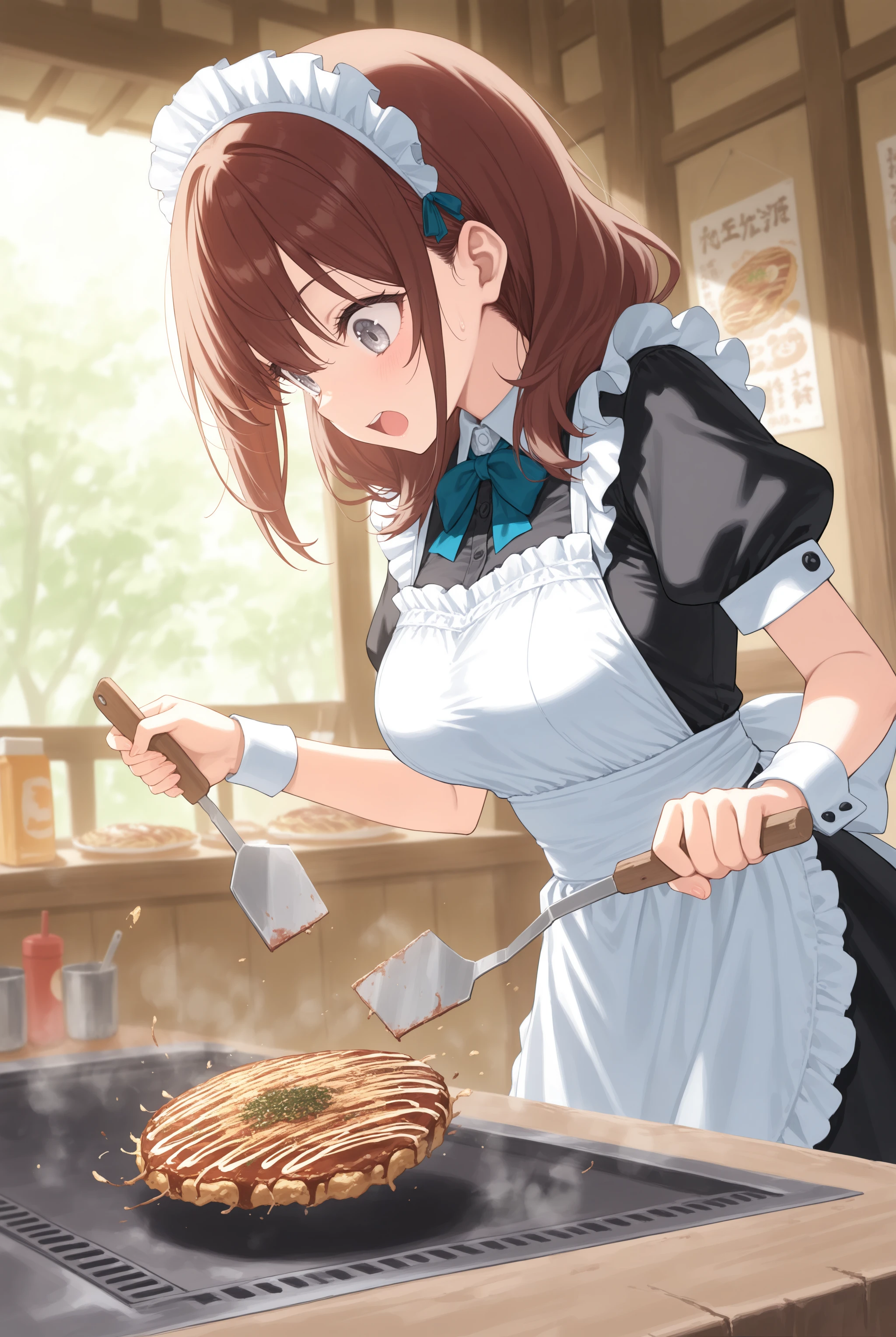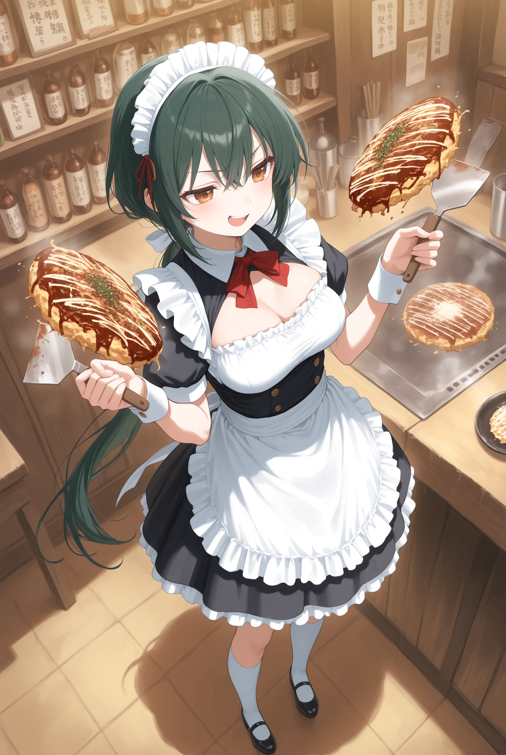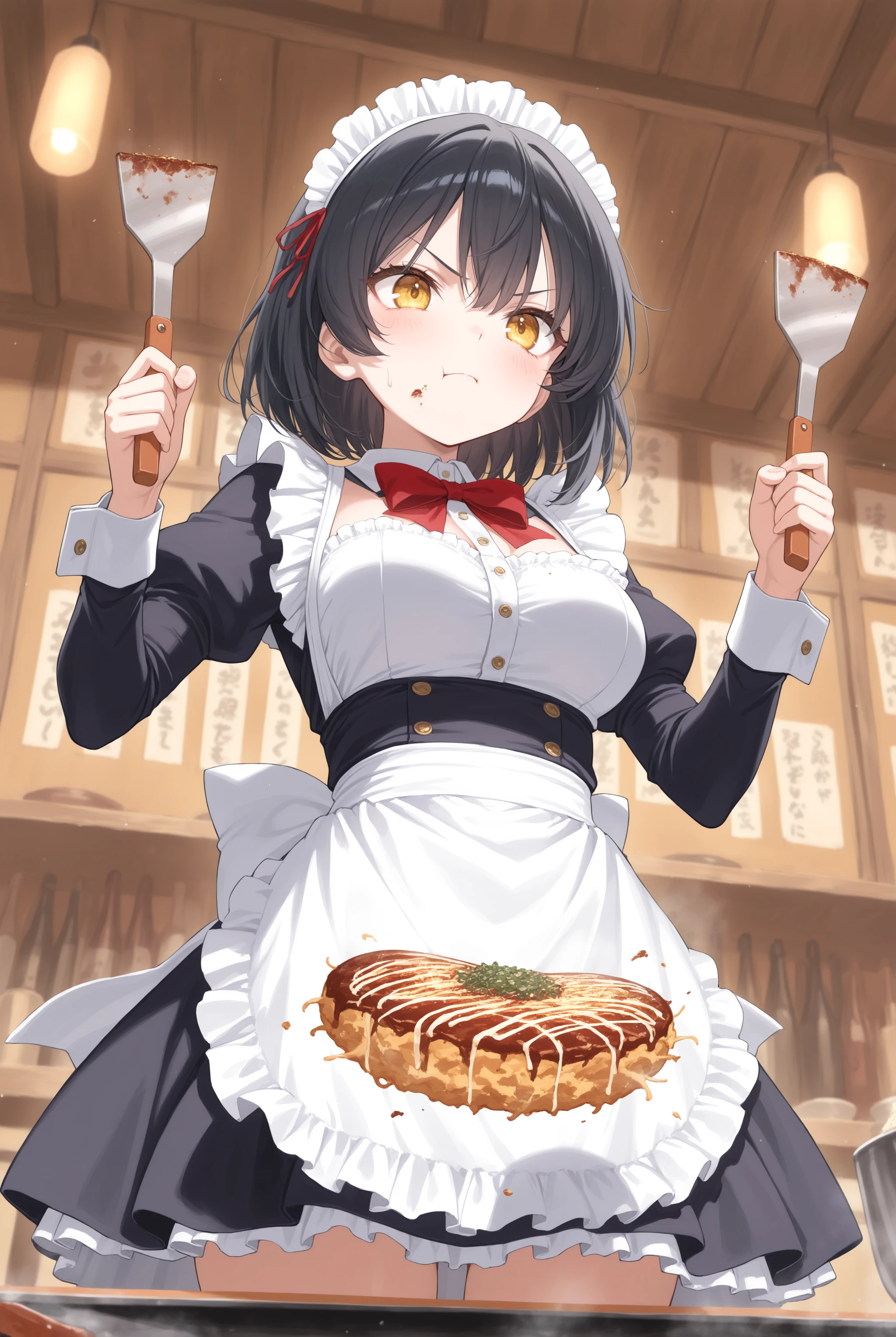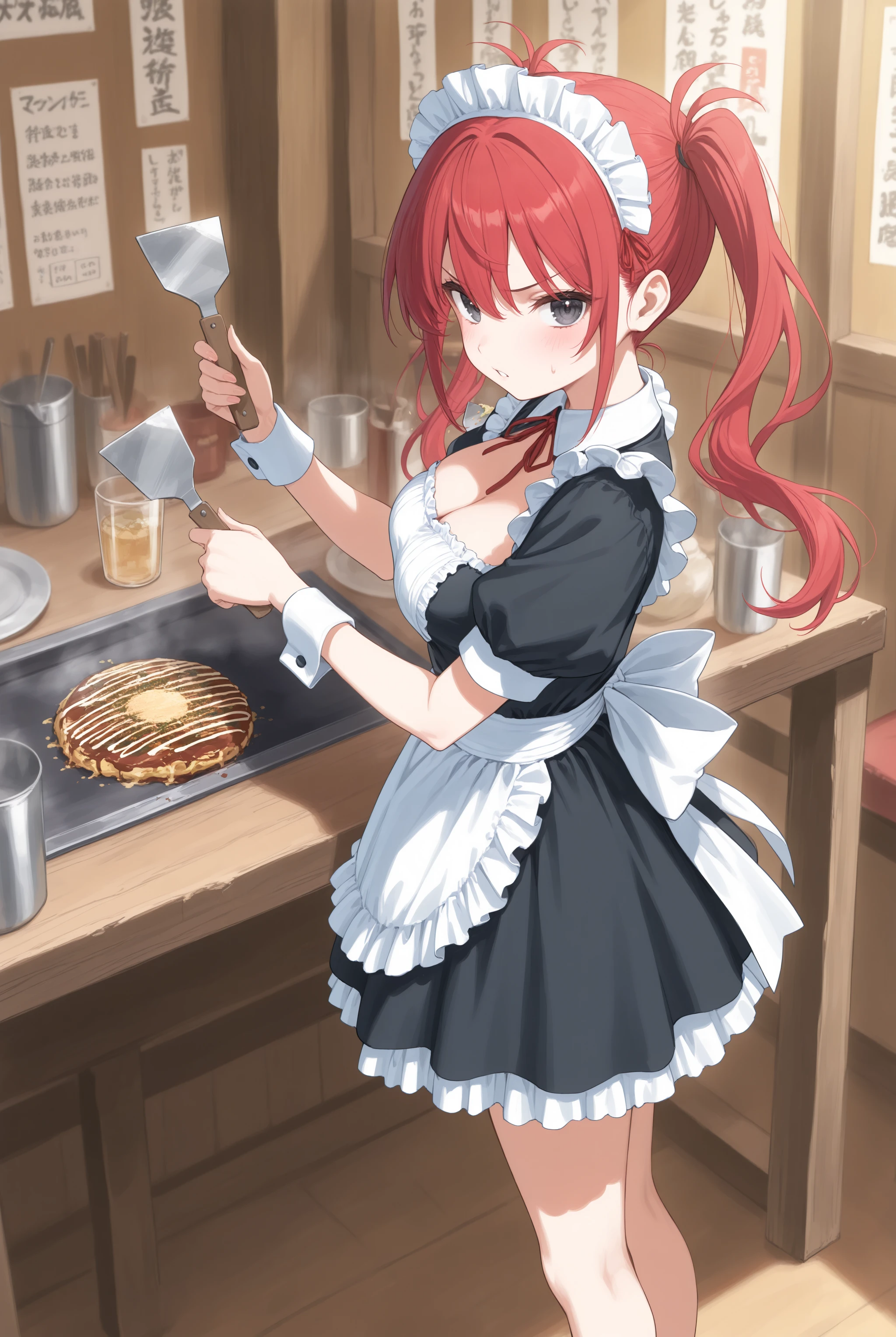 トリガーだけでも画面内に出現はしますが food, spatula, holding, food stand, looking at food, standing, cooking, restaurant, table, hands up, dual wielding 辺りから必要な物を入れて下さい。spatulaもただのフライ返しから金属のヘラに形を矯正しています。