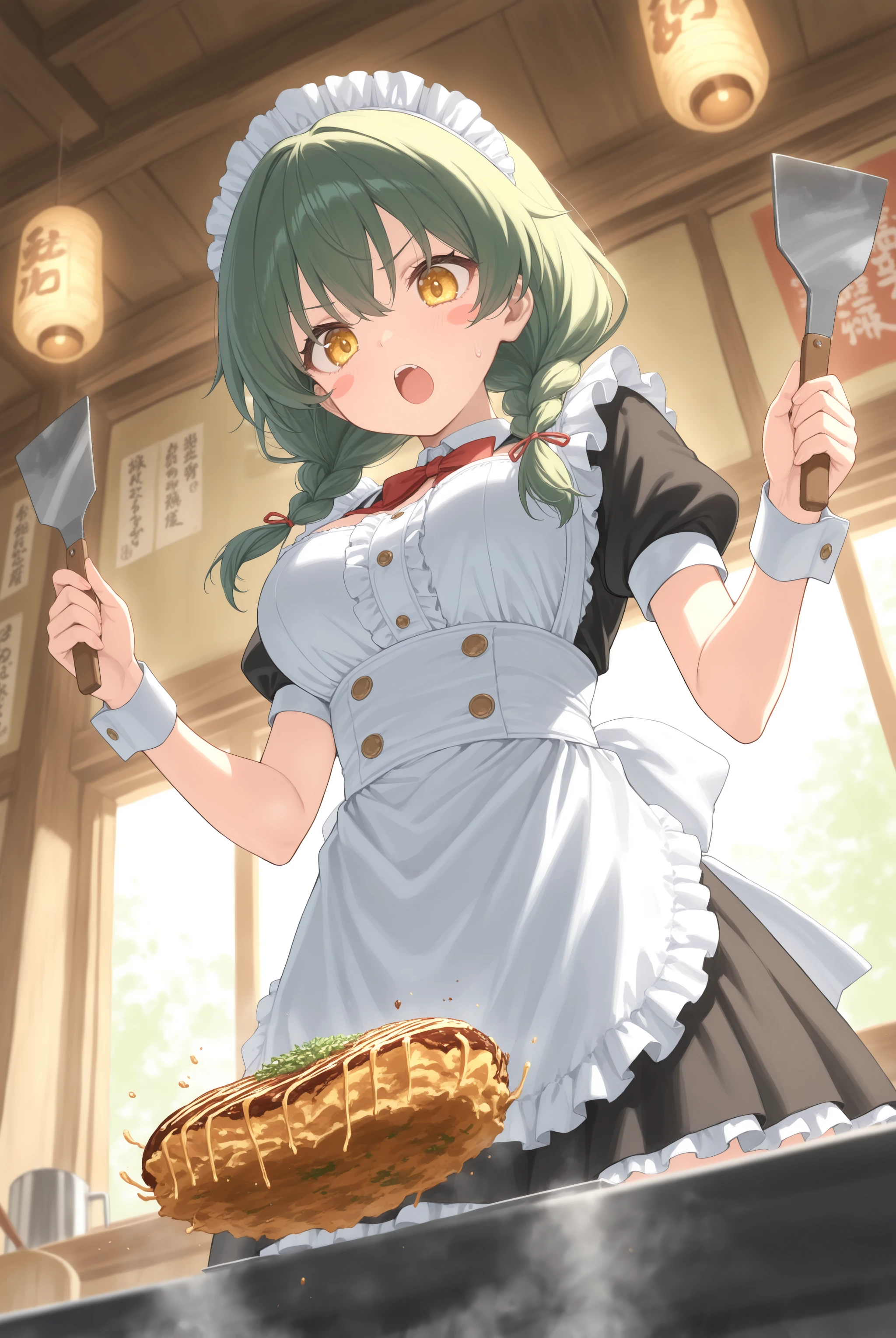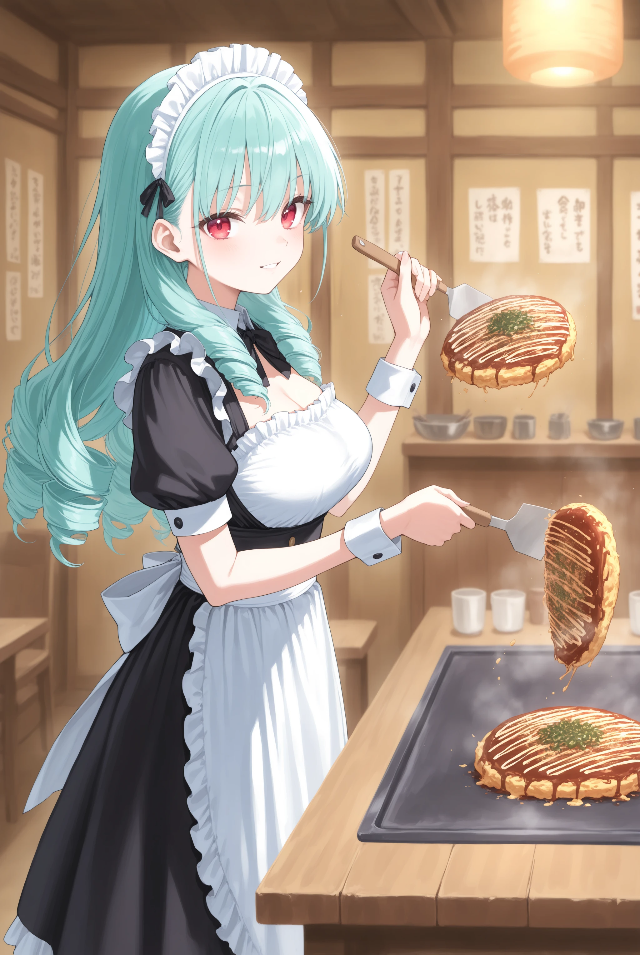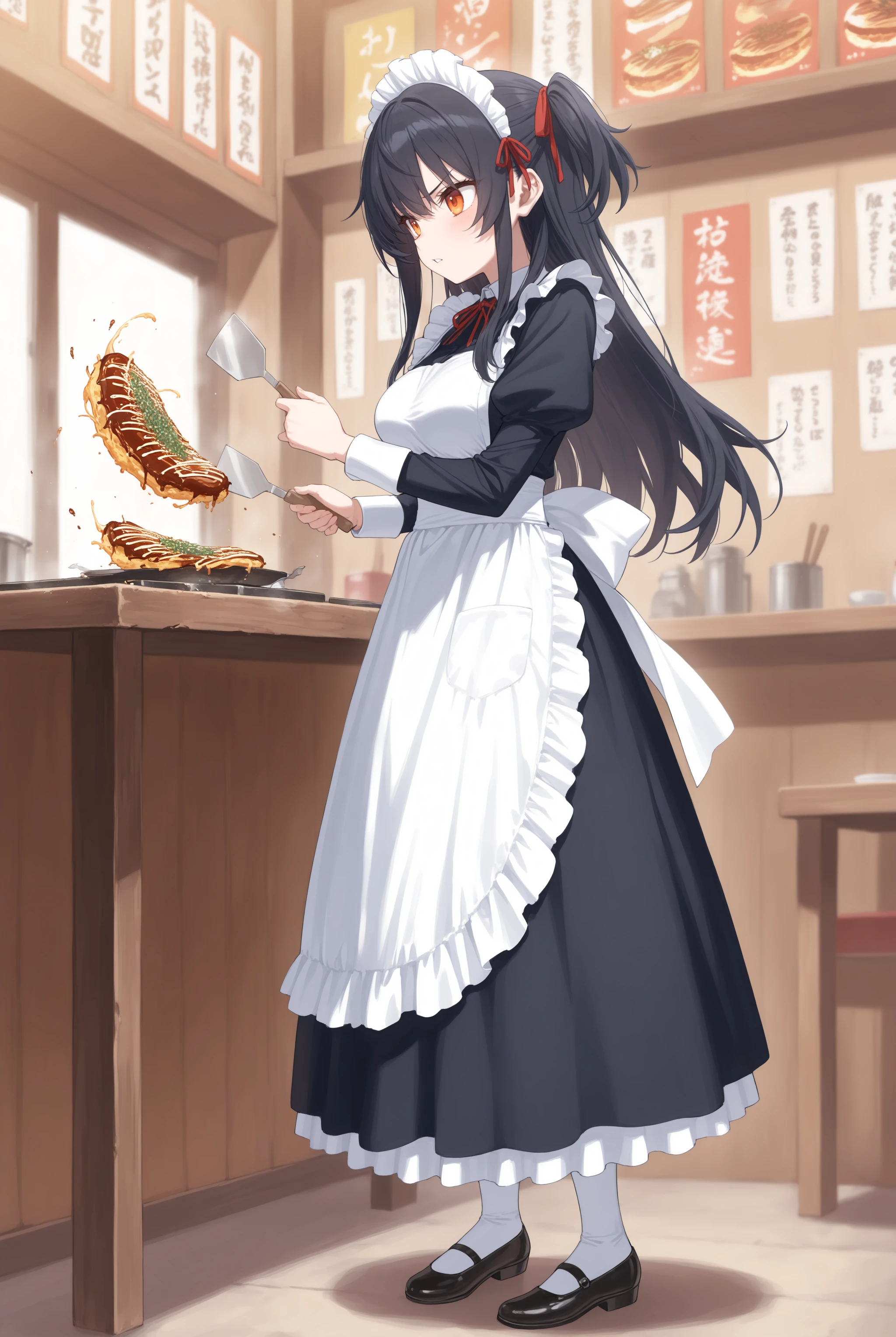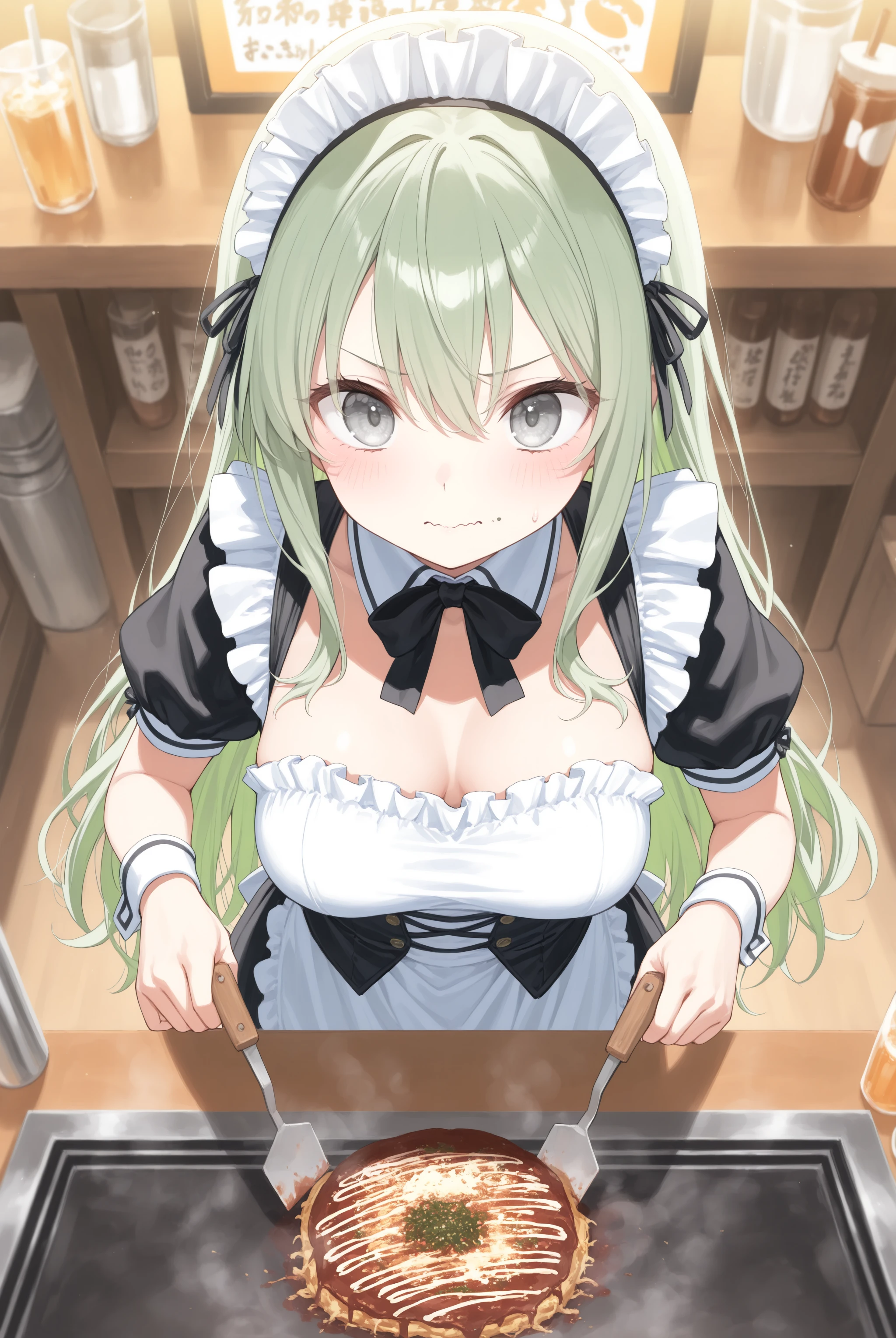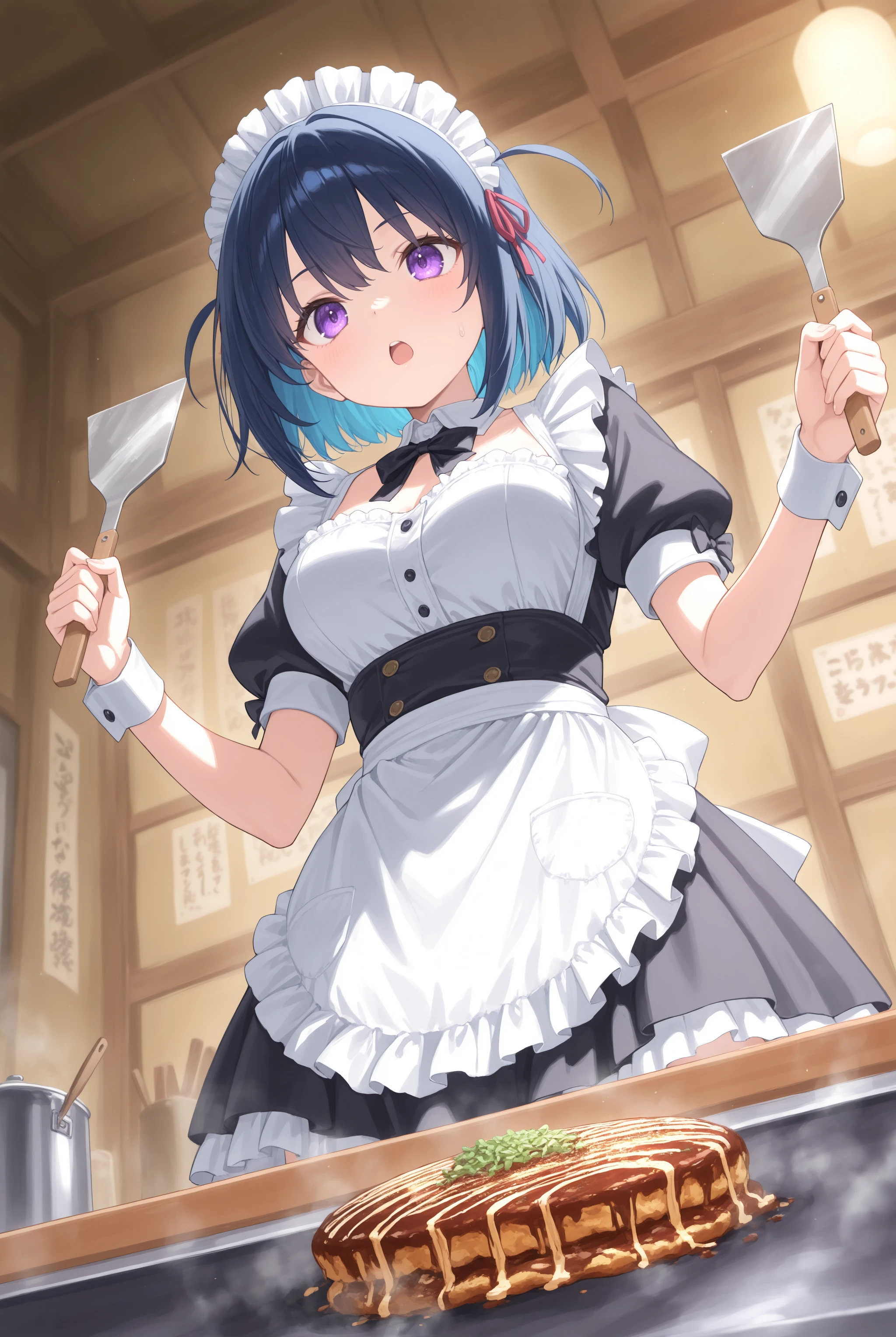 トリガーだけでも画面内に出現はしますが food, spatula, holding, food stand, looking at food, standing, cooking, restaurant, table, hands up, dual wielding 辺りから必要な物を入れて下さい。spatulaもただのフライ返しから金属のヘラに形を矯正しています。