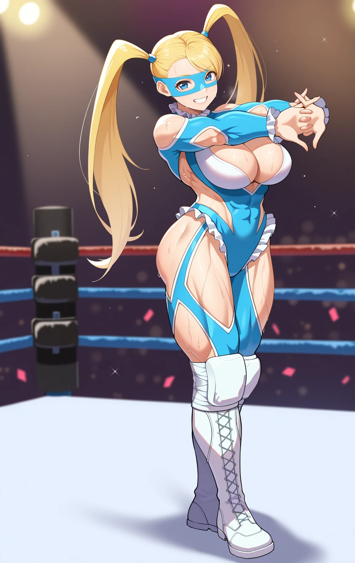 rm1kasf, blue eyes, blonde hair, twintails, hair tie, long hair, hair pulled back, swept bangs, domino mask, frilled collar, revealing clothes, blue leotard, frilled leotard, wrestling outfit, covered navel, elbow cutout, cleavage cutout, shoulder cutout, frilled sleeves, muscular female, thick thighs, knee boots, white footwear, lace-up boots,