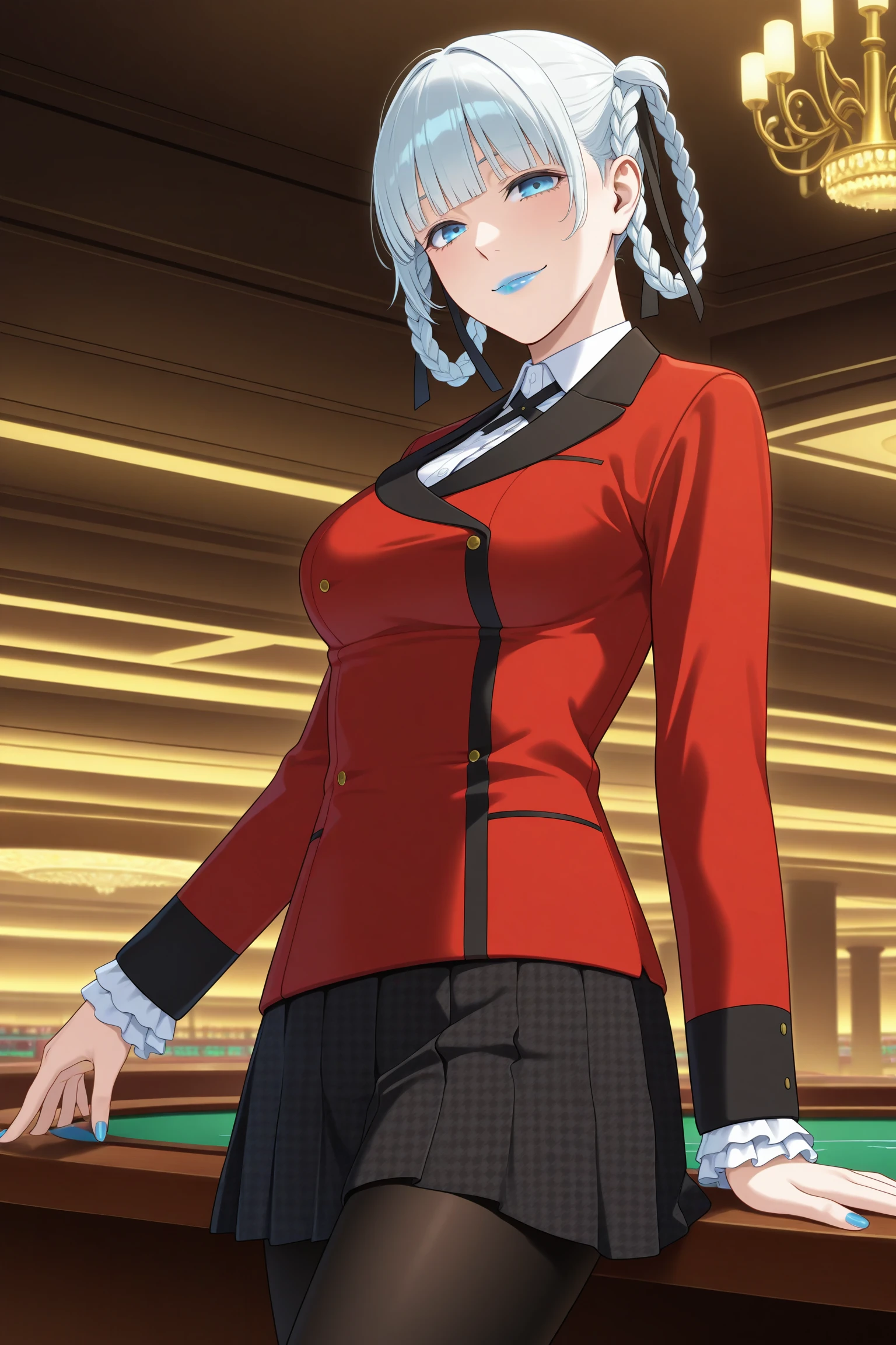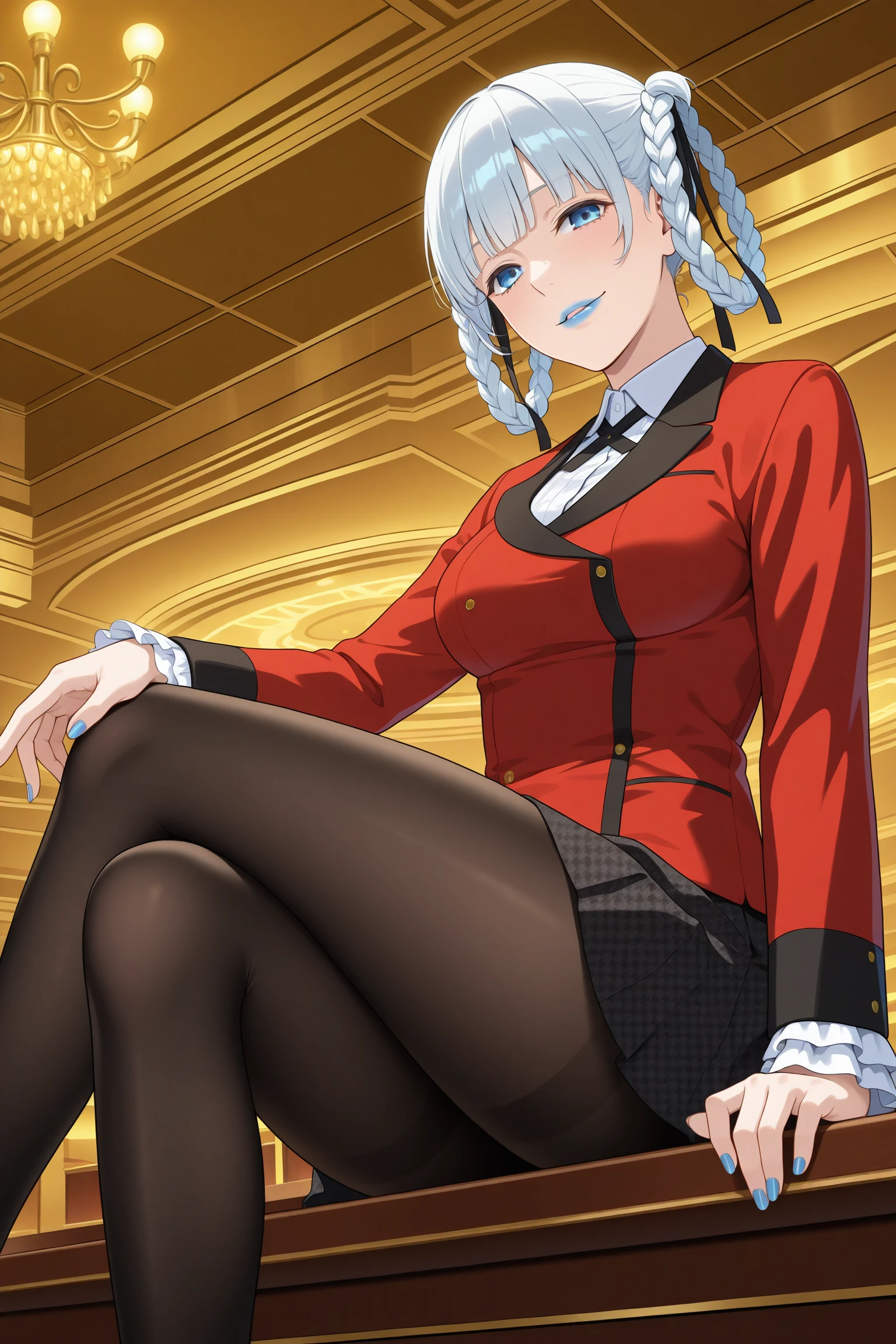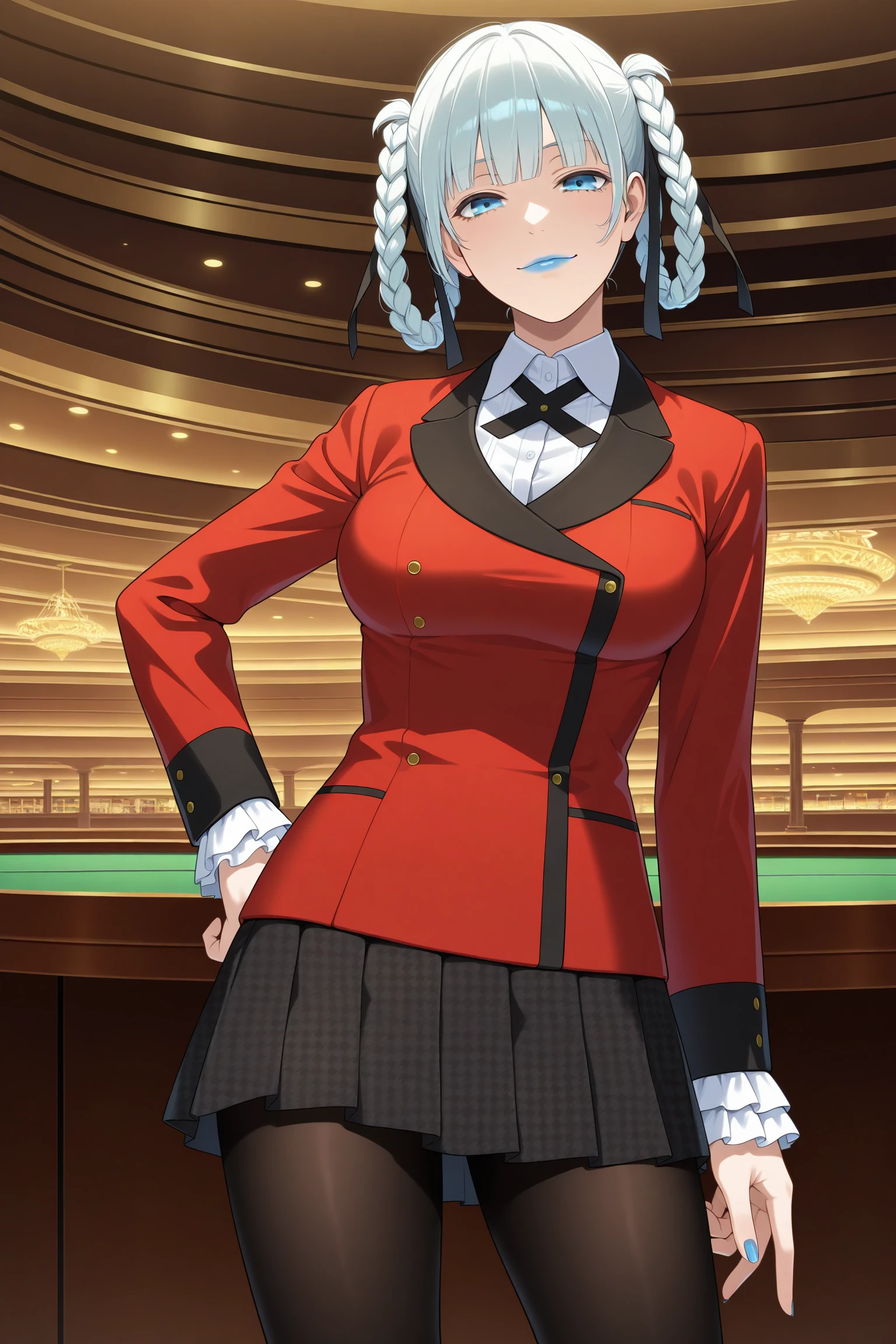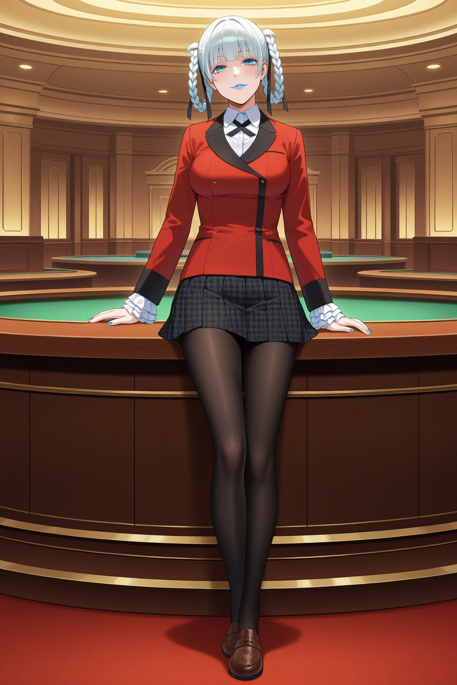 momobami kirari, short hair, white hair, blunt bangs, twin braids, braided hair rings, hair ribbon, blue eyes, blue lips, long sleeves, blue nails, nail poilsh, blazer, red jacket, suit jacket, white shirt, collared shirt, frilled sleeves, black neck ribbon, black skirt, plaid skirt, pleated skirt, black pantyhose, loafersDescription