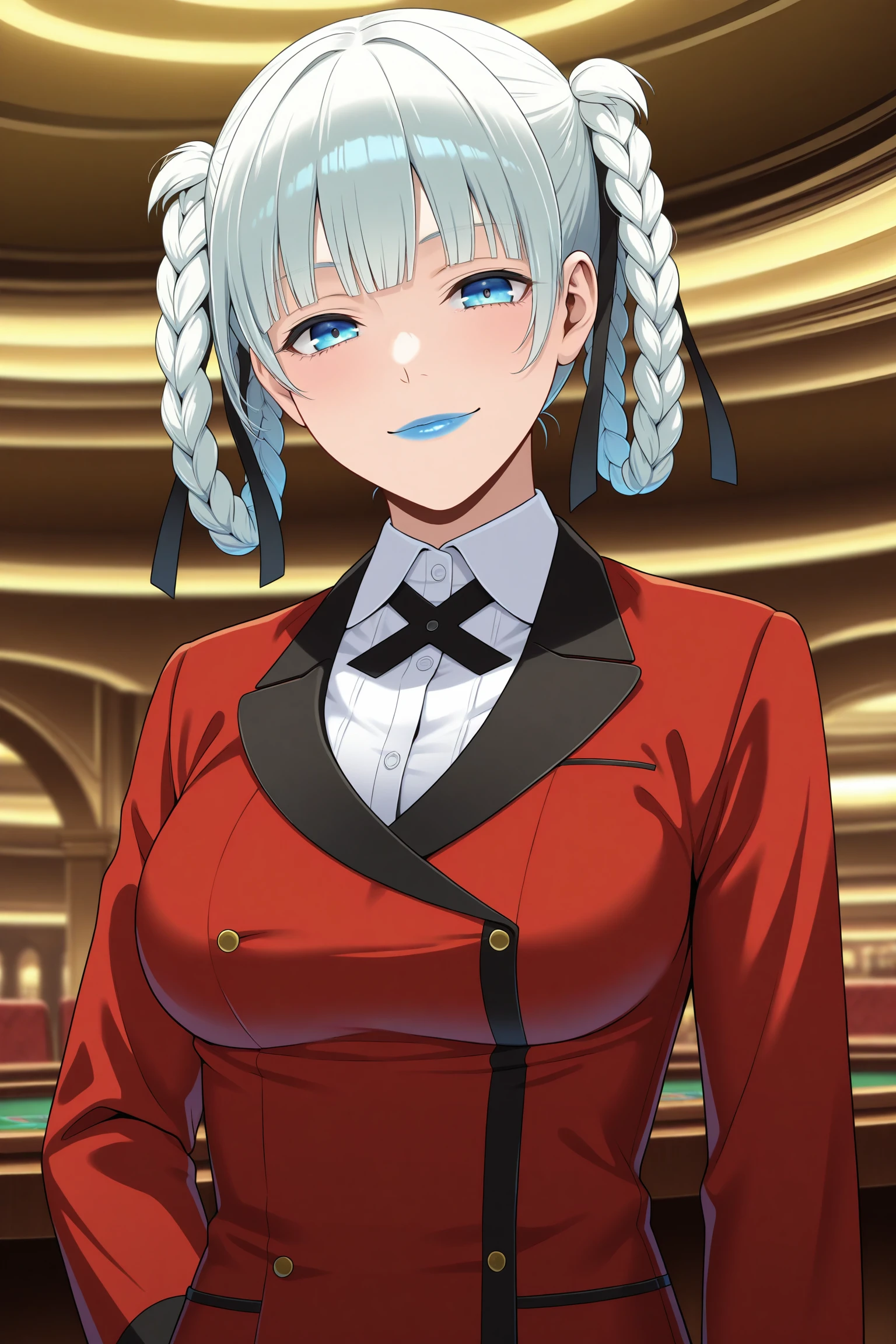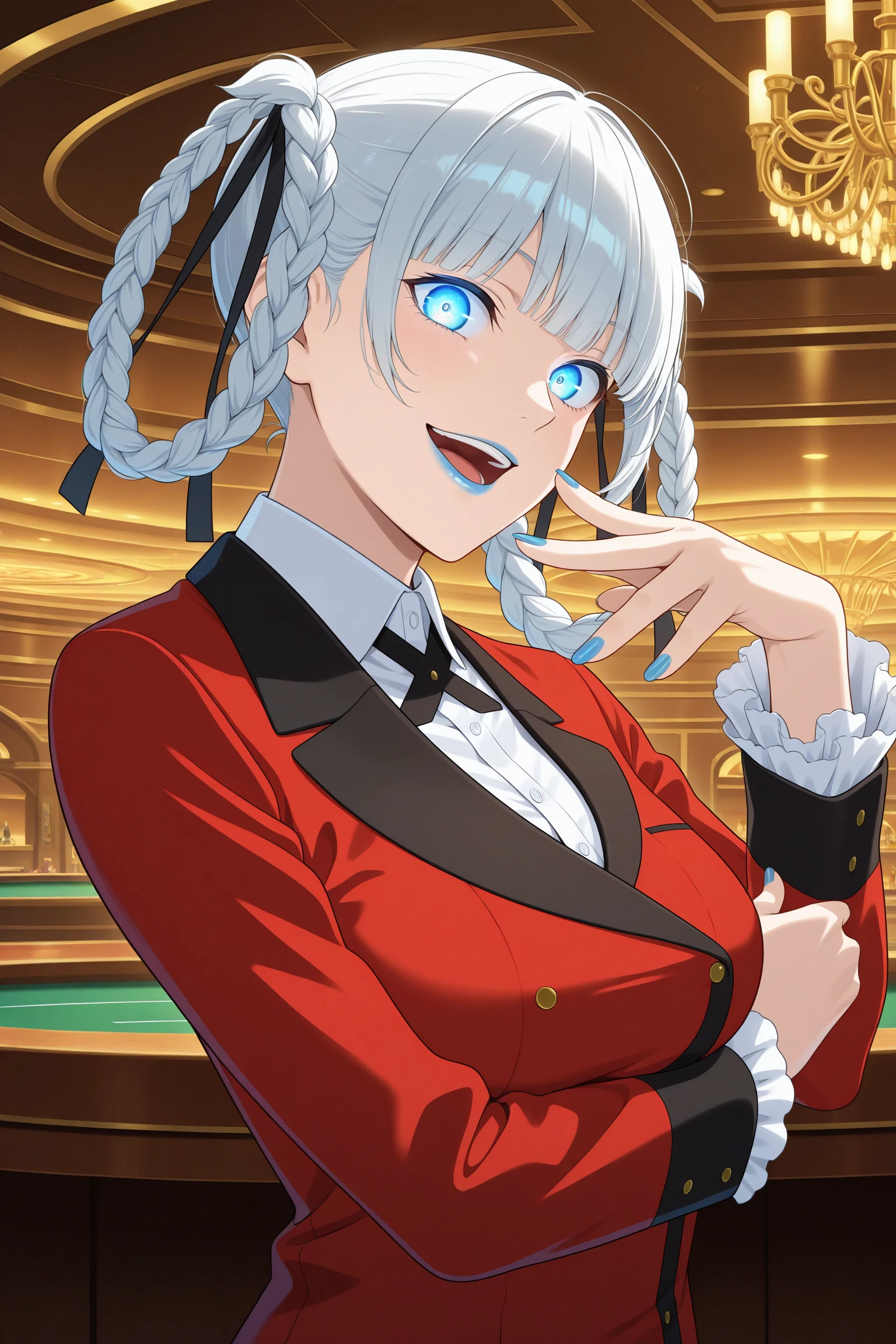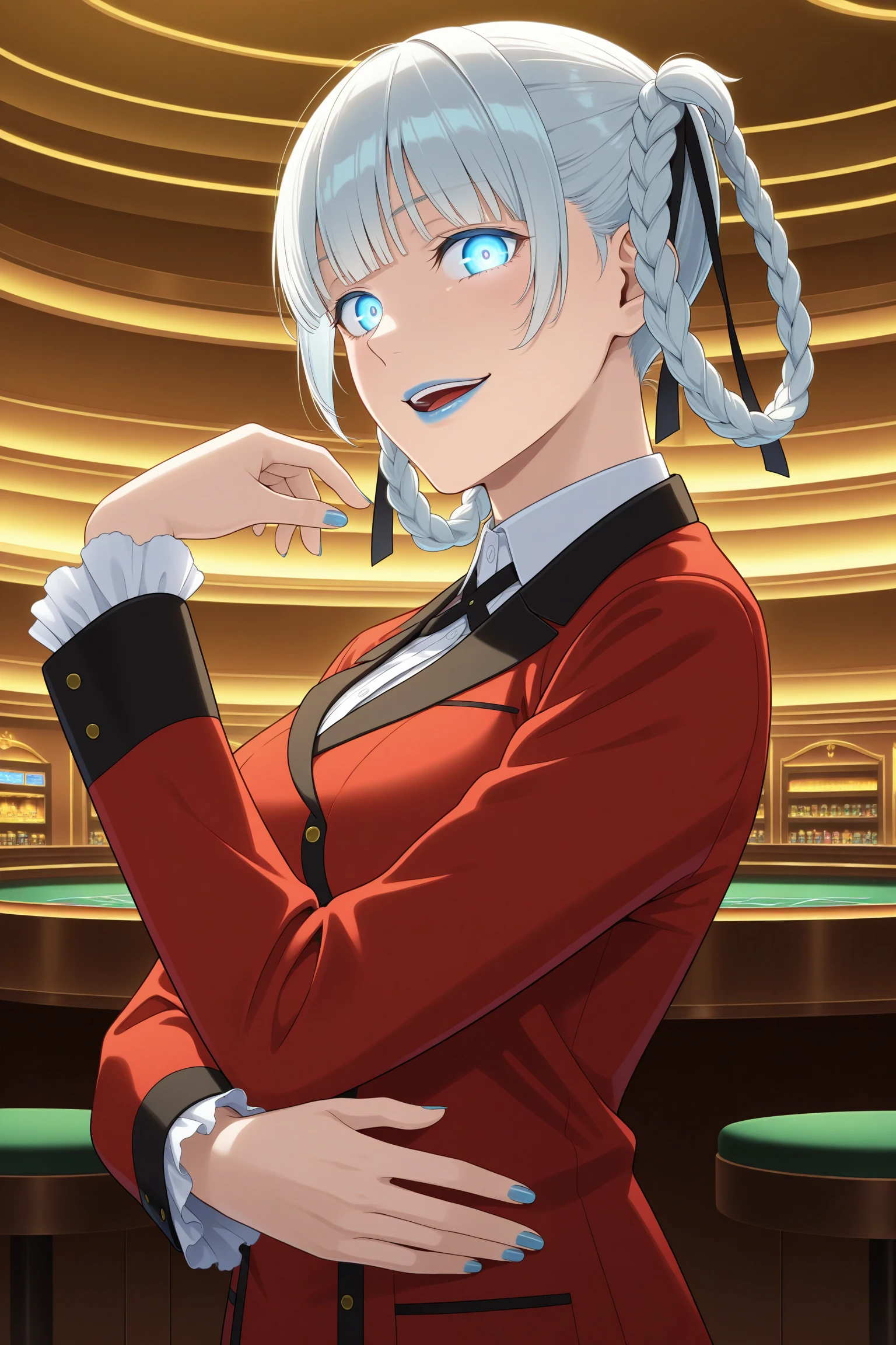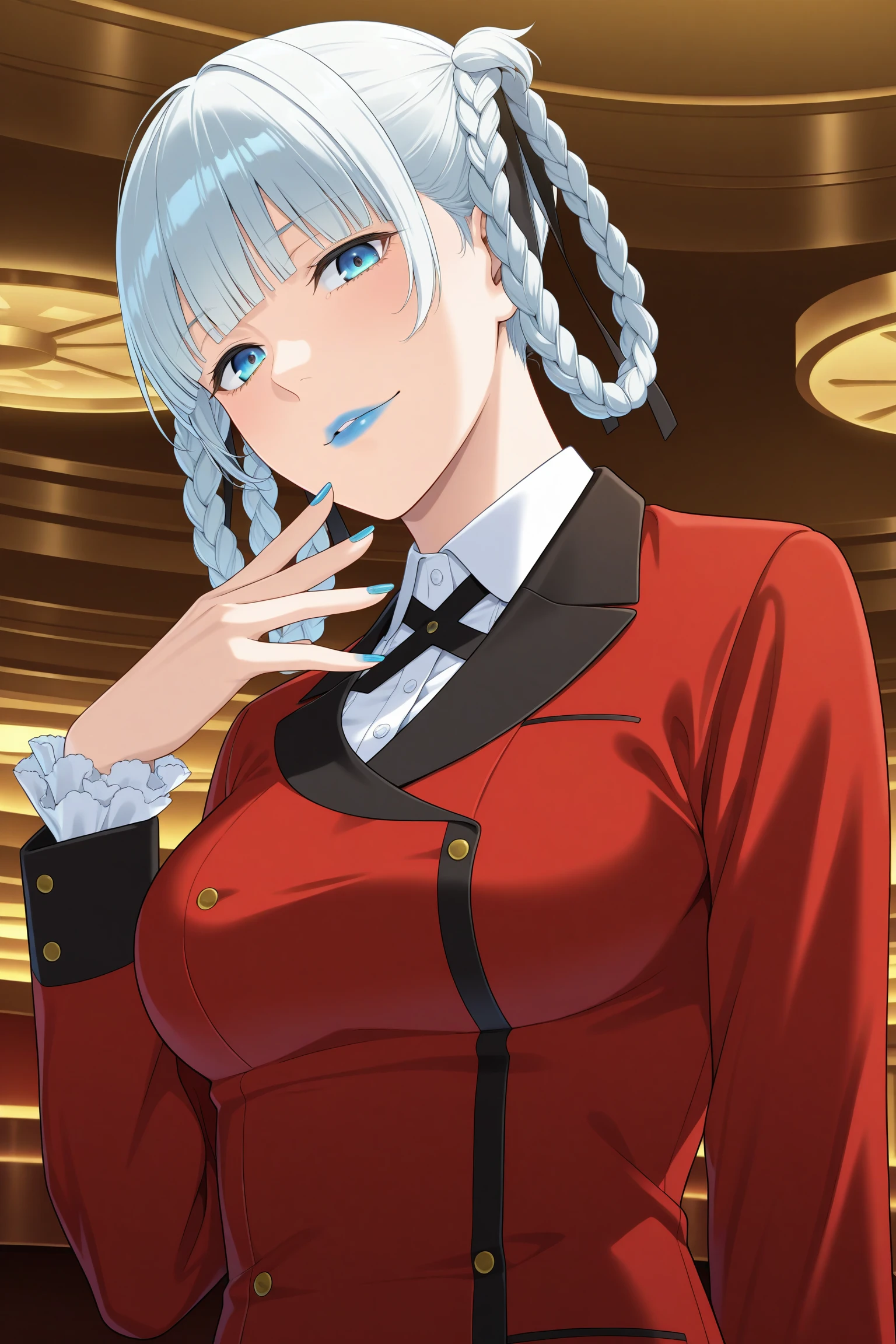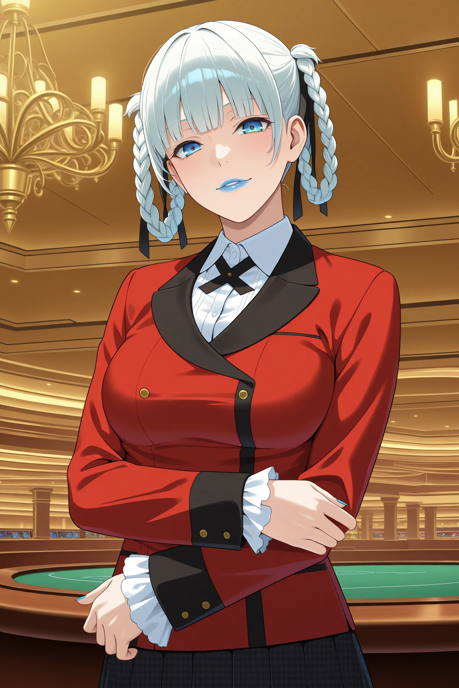 momobami kirari, short hair, white hair, blunt bangs, twin braids, braided hair rings, hair ribbon, blue eyes, blue lips, long sleeves, blue nails, nail poilsh, blazer, red jacket, suit jacket, white shirt, collared shirt, frilled sleeves, black neck ribbon, black skirt, plaid skirt, pleated skirt, black pantyhose, loafersDescription