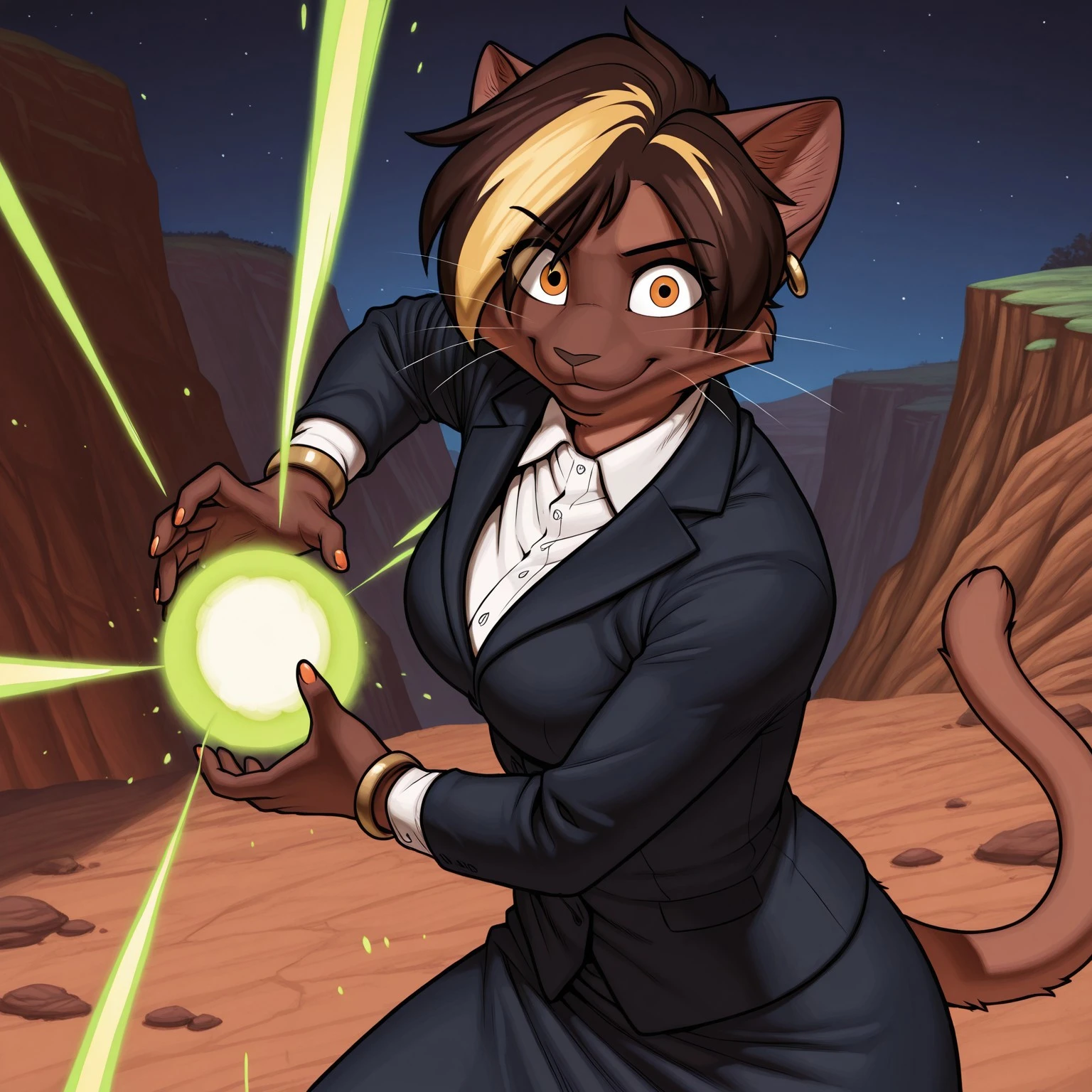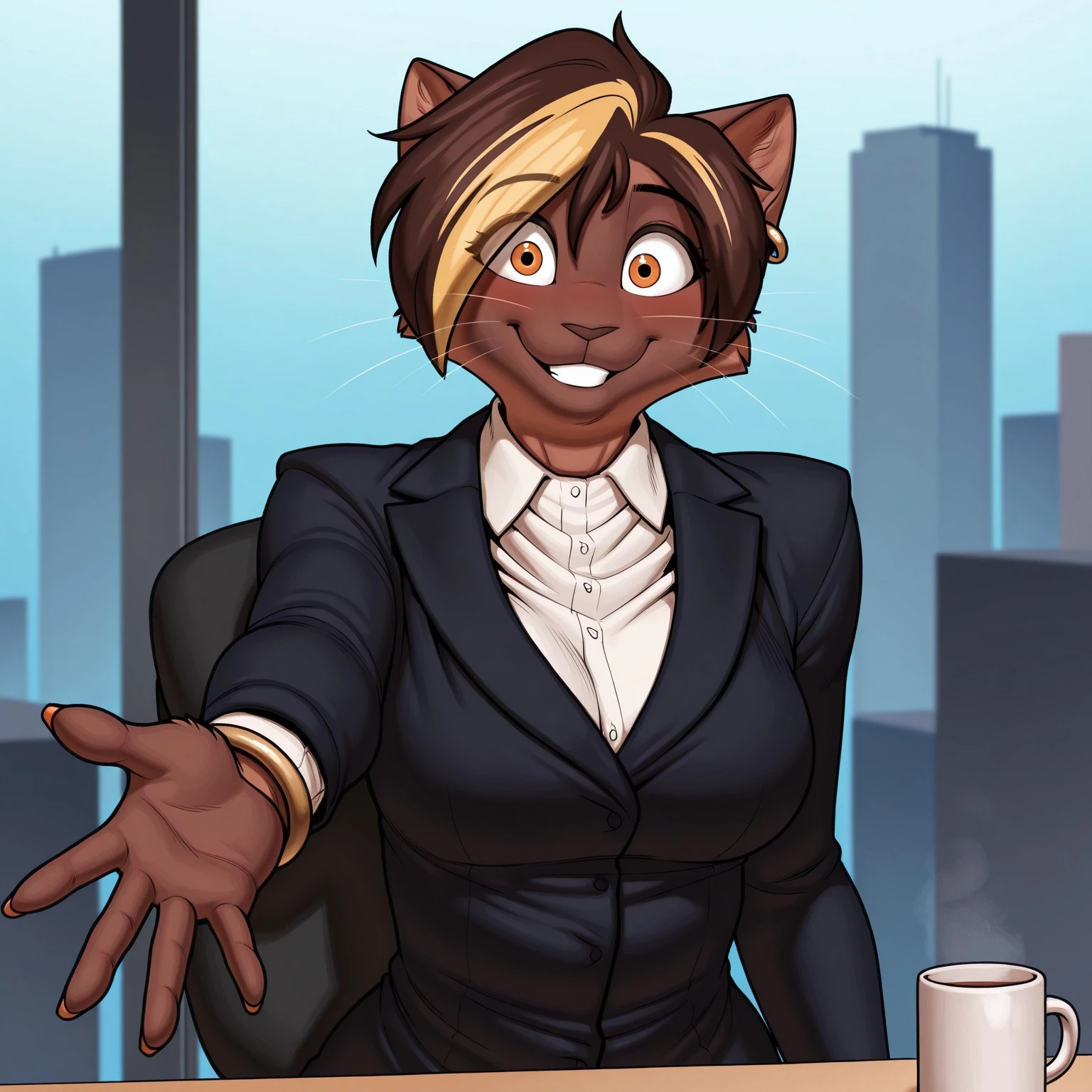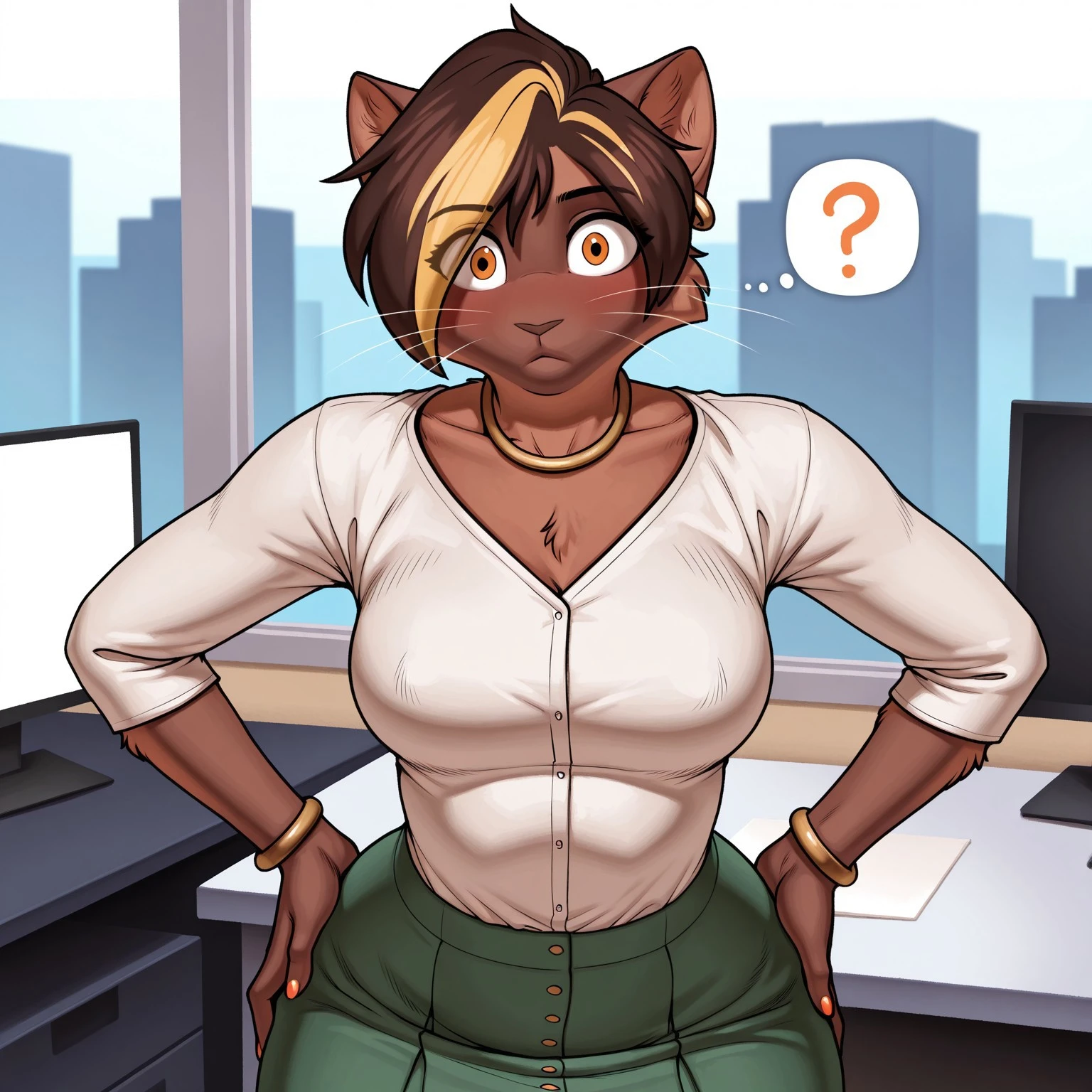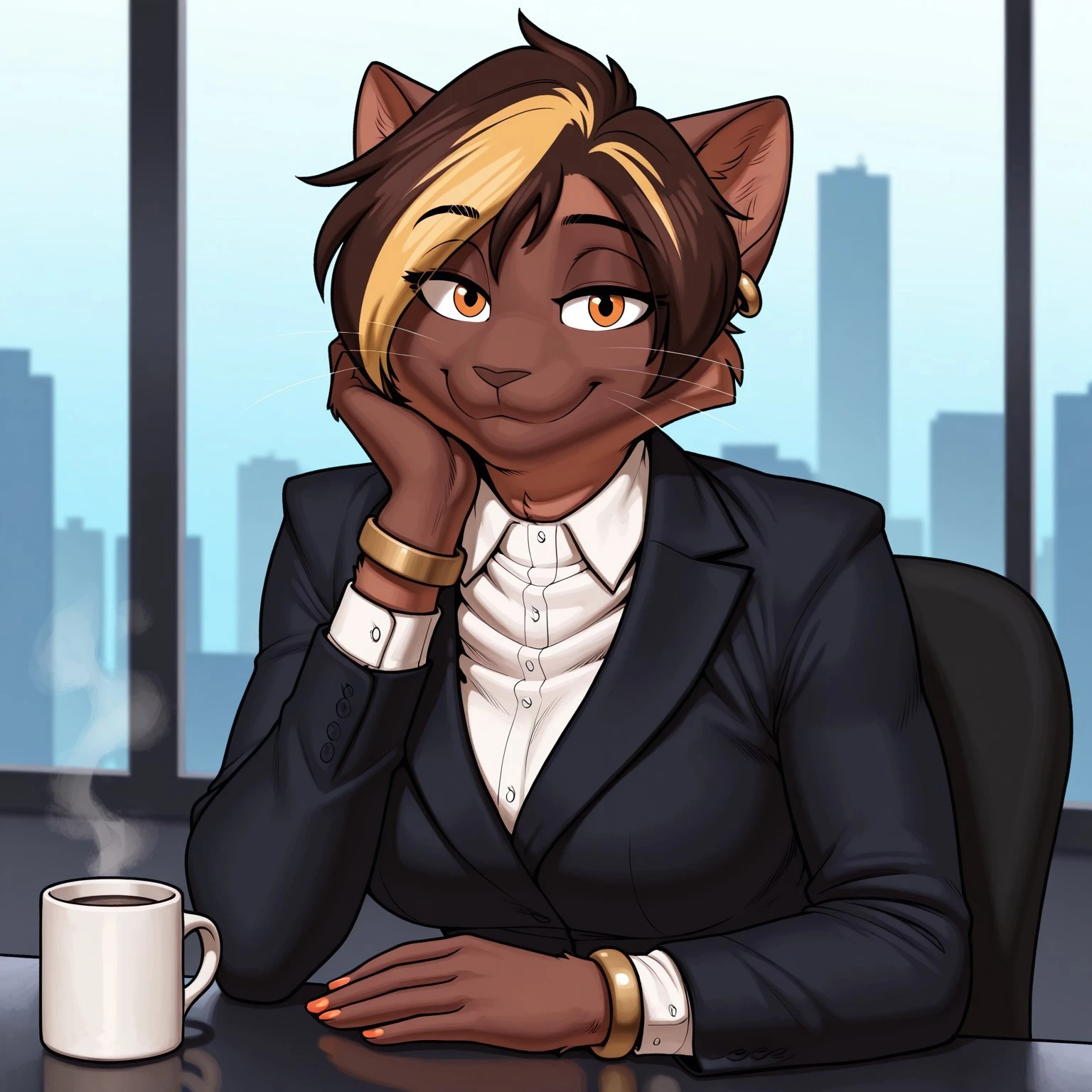 Positive Prompts: VanessaMH, female furry, furry, anthro, feline, cat, brown hair, blonde hair streak, black eyebrows, short hair, orange eyes, black pupils, brown body, brown fur, brown nose, whiskers, gold earring, medium breasts, brown tail, eyebrows visible through hair, eyes visible through hair