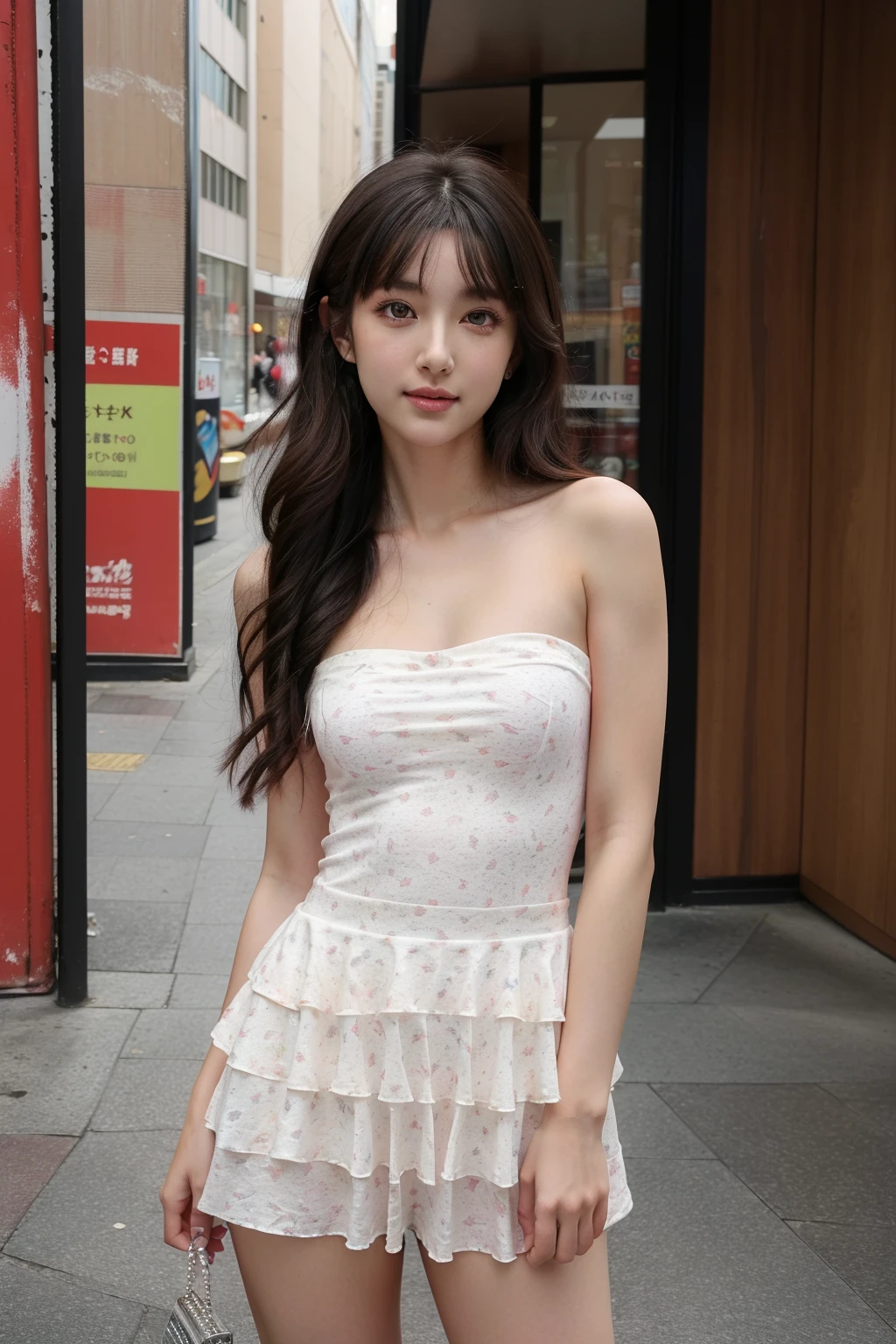 *Trigger Words:- bzcdress, white dress, floral print, strapless dress, frilled skirt, bare shoulders