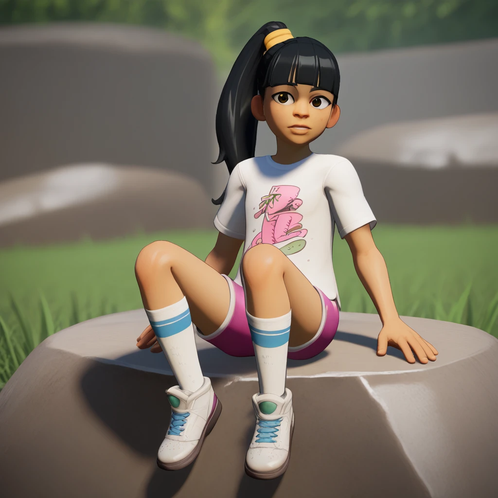 AllyHoops, 1girl, solo, black hair, brown eyes, ponytail, blunt bangs,