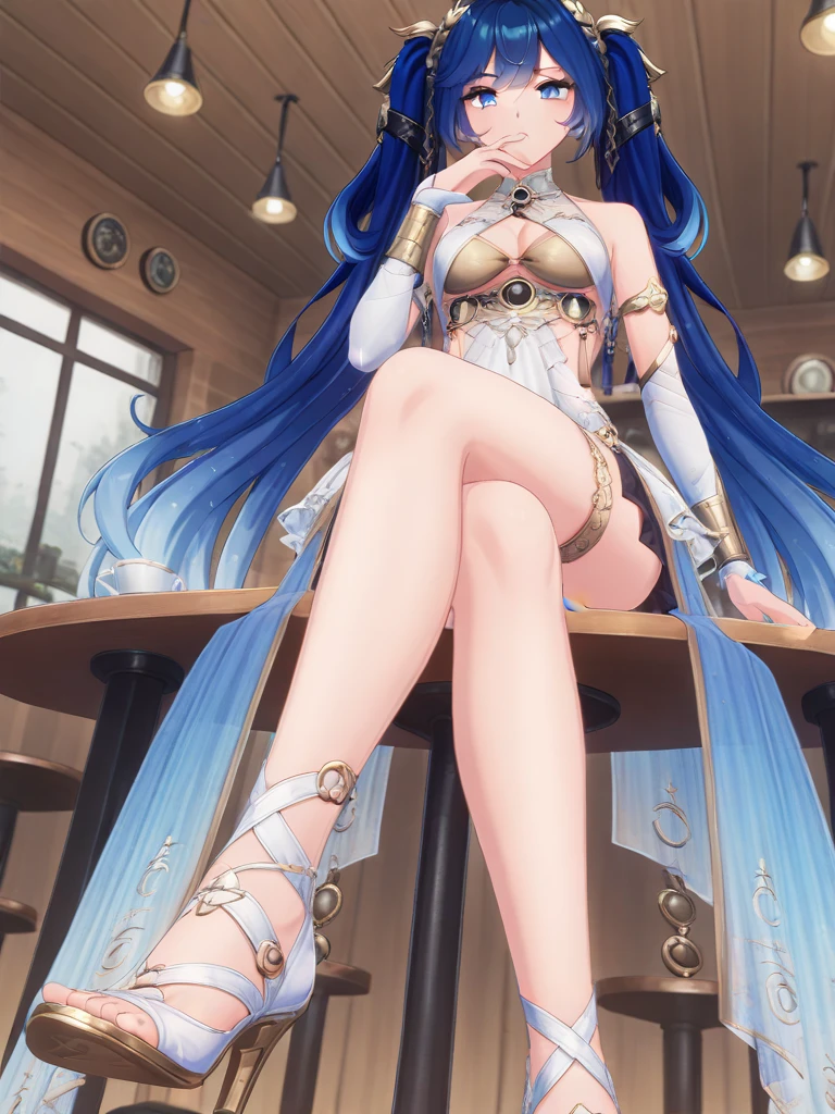 iuno,twintails,blue hair,hair ornament,detached collar,separate skirt,panties,midriff,detached sleeves,hemline,translucent,high heels,thigh strap,