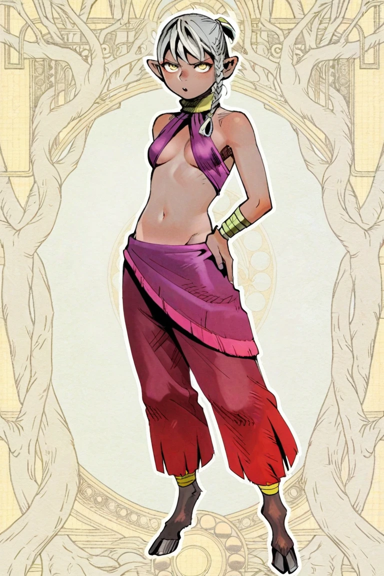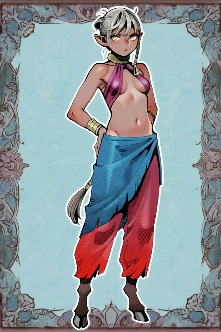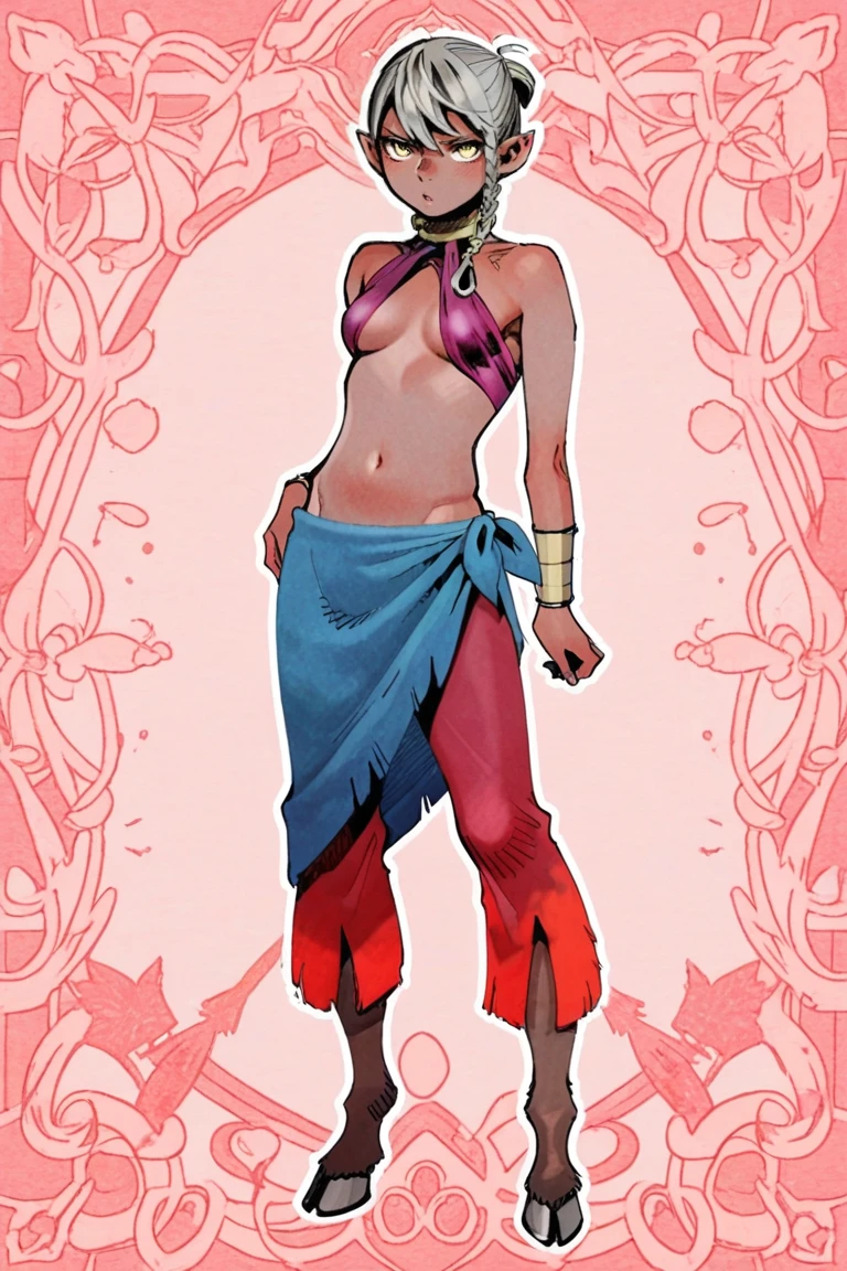 satyr_maiden,dark skin, grey hair,single braid,yellow eyes,small breasts,red criss-cross halter,navel,blue sarong,red pants,hooves,