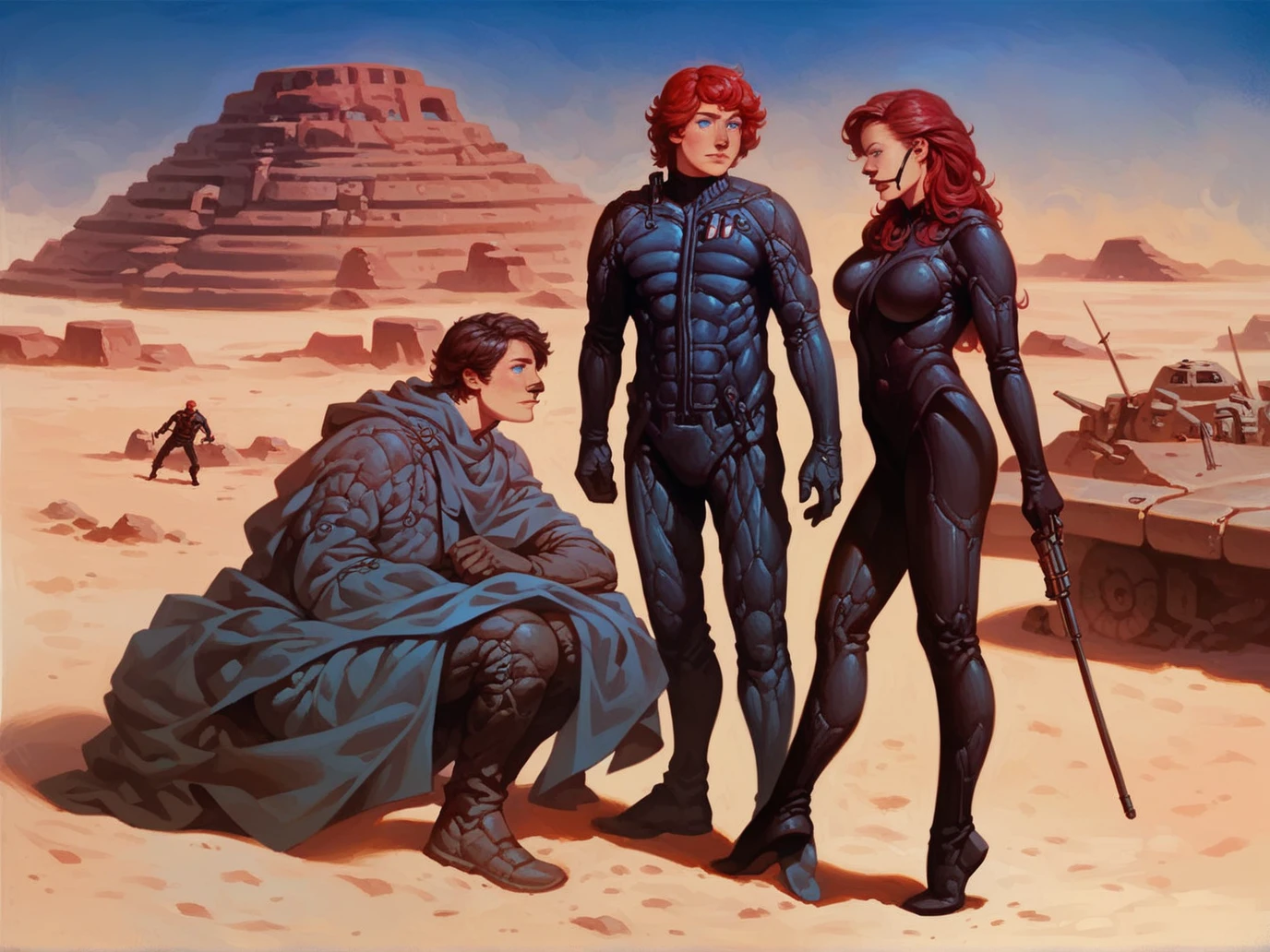 It works very well even at 1.0, but perhaps there's a minor style influence there, so if you don't want that, lower to 0.8. It tends to make these stillsuits with gloves or half-gloves - not much of a problem here, as many people complained that the stillsuit from the movie does not cover palms. Still, if you don't want that, then put "gloves" in the negative prompt.