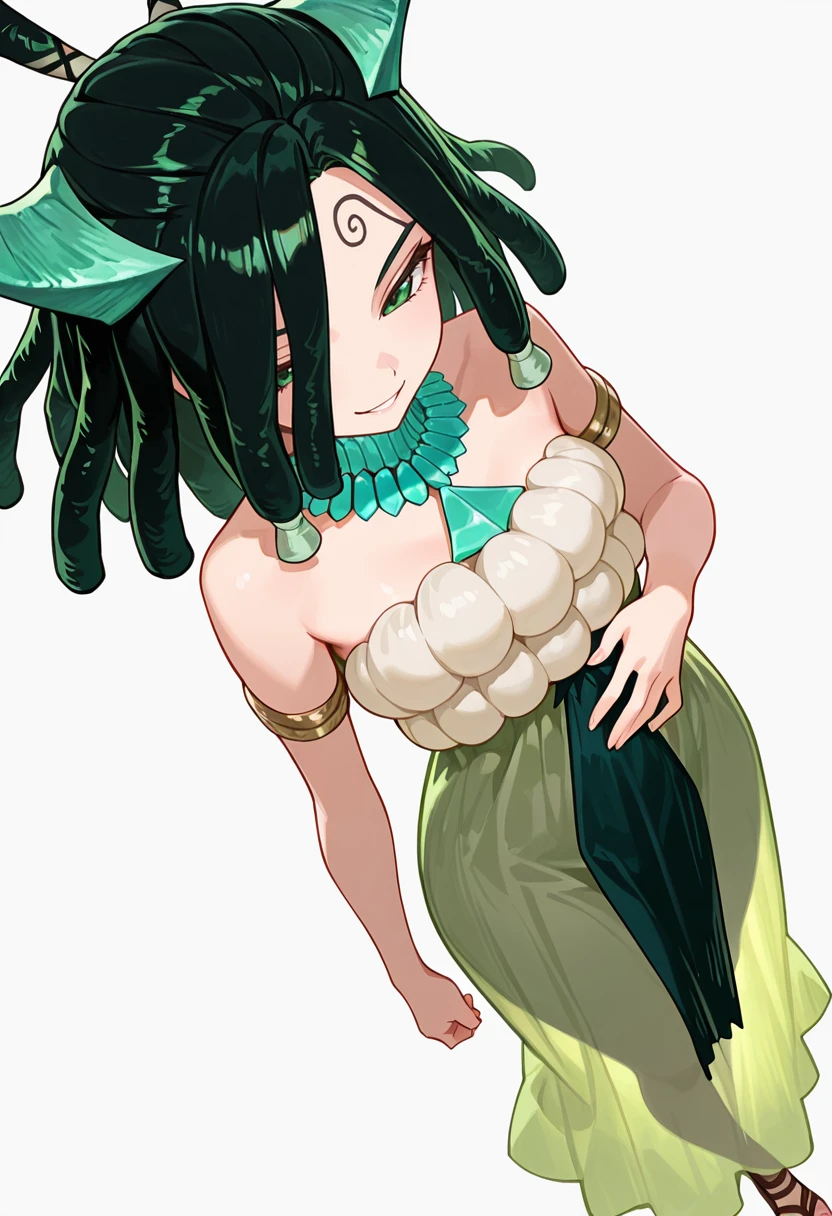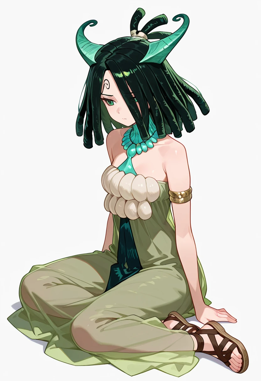 bare shoulders, dress, armlet, green dress, necklace,see-through, sandals, aqua necklace,loincloth