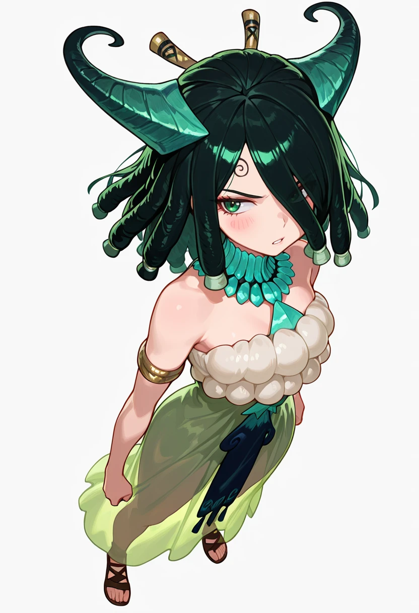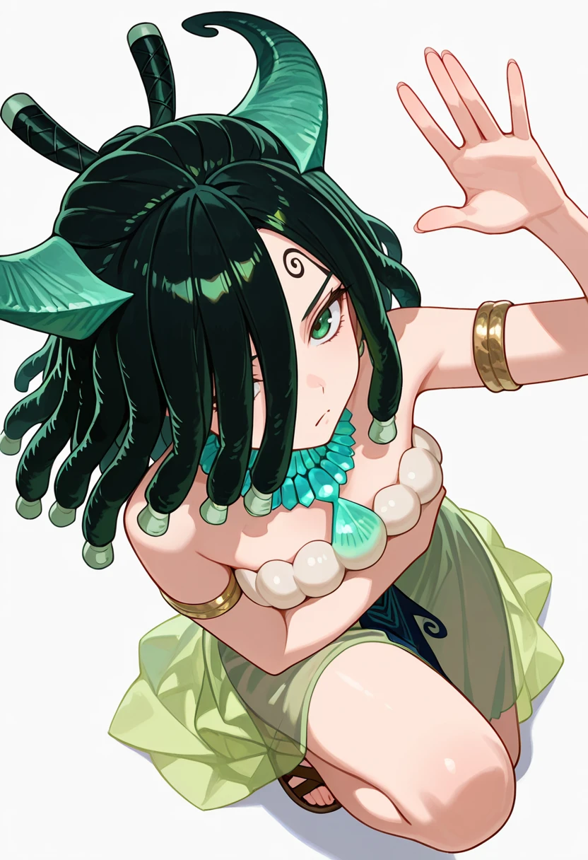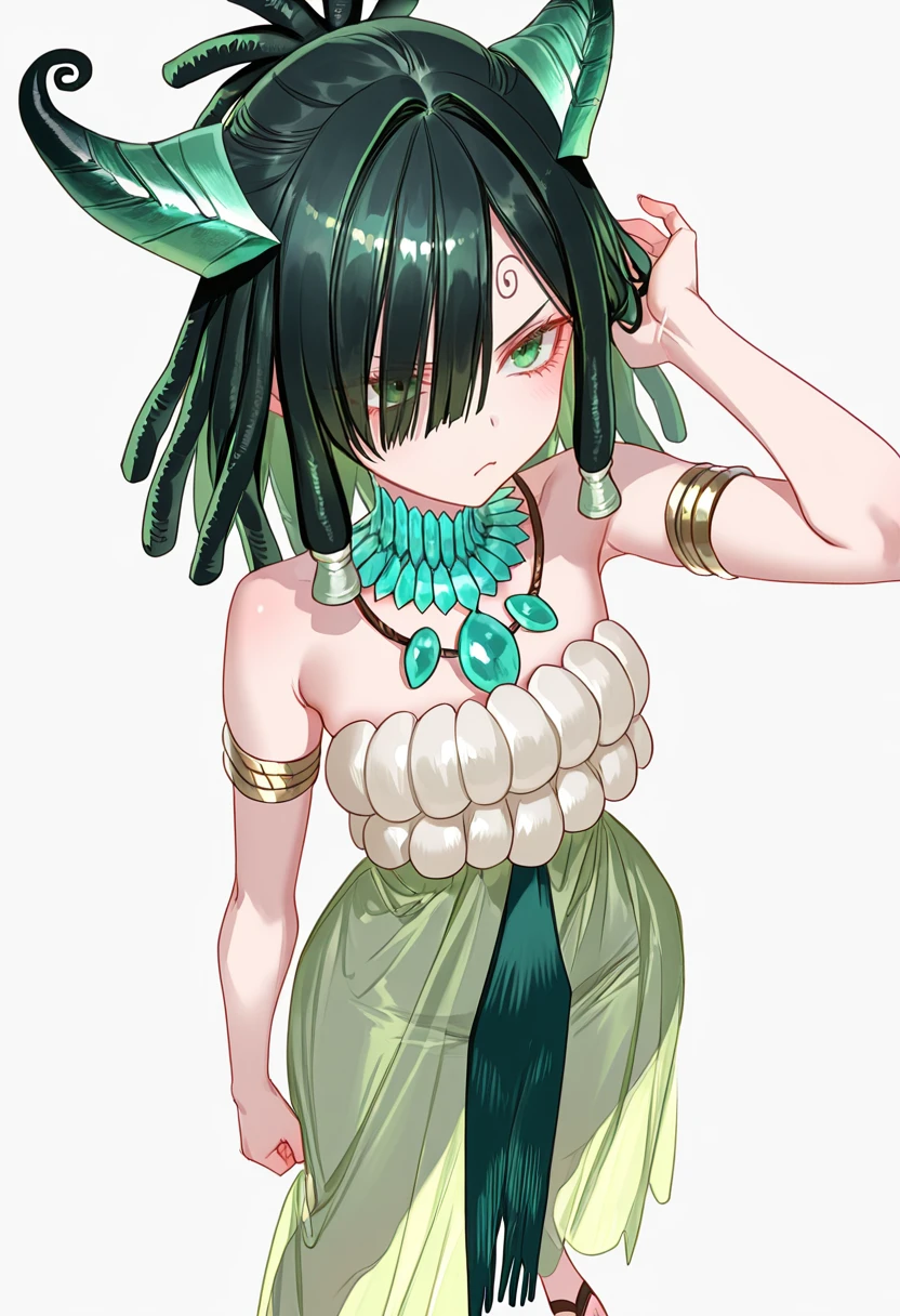 kirisame_cnr, 1girl, black hair, green eyes, green hair, long hair,horns,hair tubes,dreadlocks, facial mark,hair over one eye,