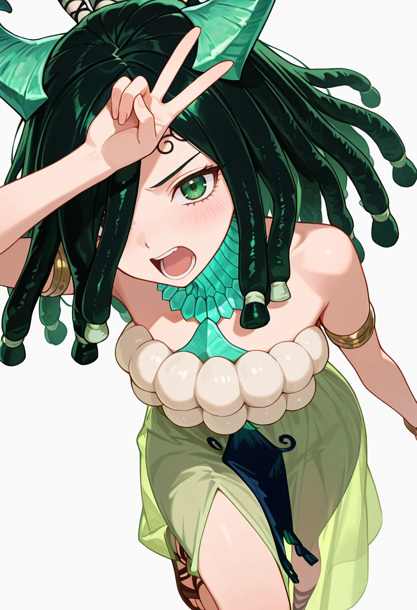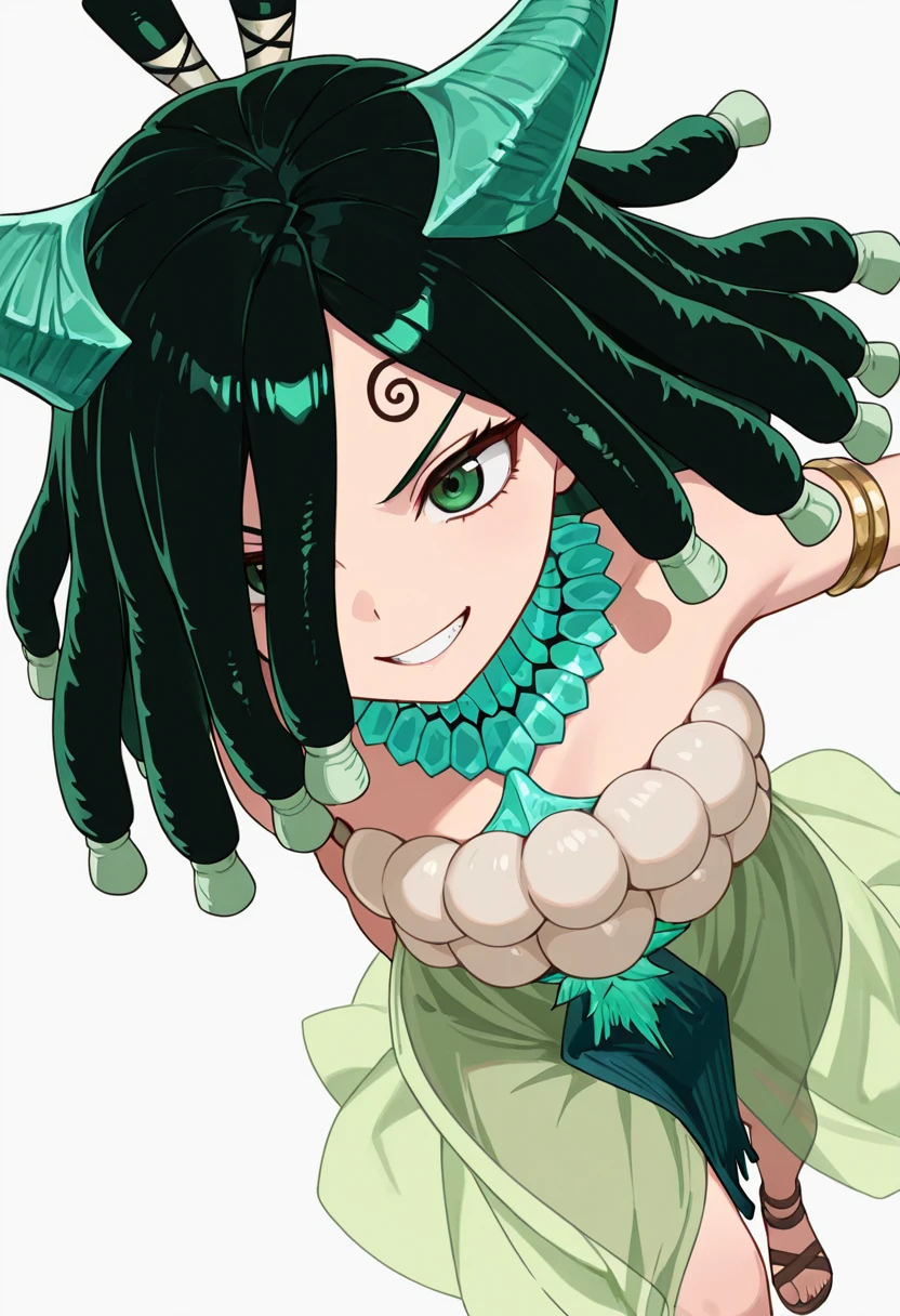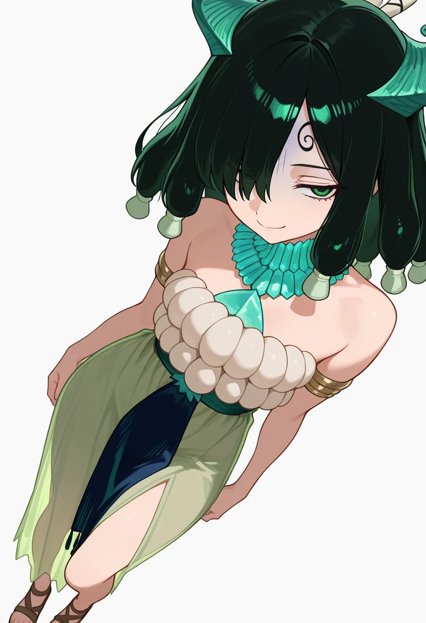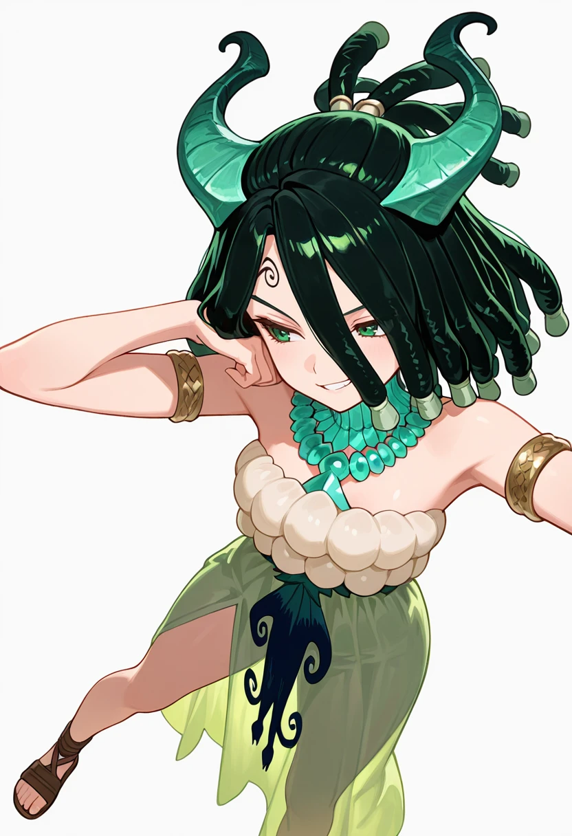 kirisame_cnr, 1girl, black hair, green eyes, green hair, long hair,horns,hair tubes,dreadlocks, facial mark,hair over one eye,